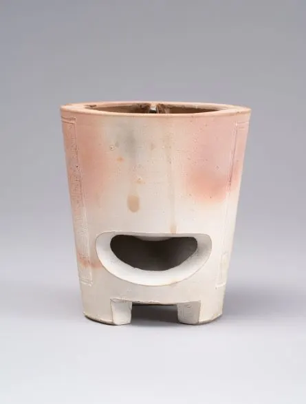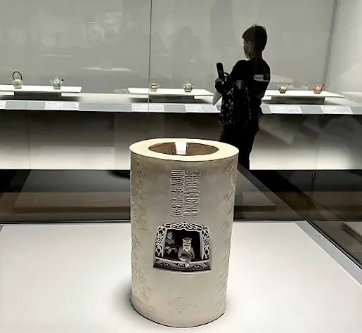 ここで、木米の煎茶愛を象徴する作品を紹介しておこう。《白泥蘭亭曲水四十三賢図一文字炉》である。上に急須を載せて沸かすための炉なのだが、空気を通すための穴から人物の像が上半身を覗かせている。《蘭亭序》という書の名作を書いた4世紀の書家、王羲之の姿だという。筆者が特に感じ入ったのは、王羲之の像が見せている笑顔である。そこには必ずや木米の心が乗り移っているのではないかと思うのだ。