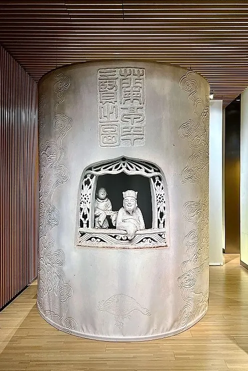 会場の一角に記念撮影用に設えられた木米《白泥蘭亭曲水四十三賢図一文字炉》の大型レプリカ(部分)。王羲之の像が満面の笑みを浮かべている。 撮影:小川敦生