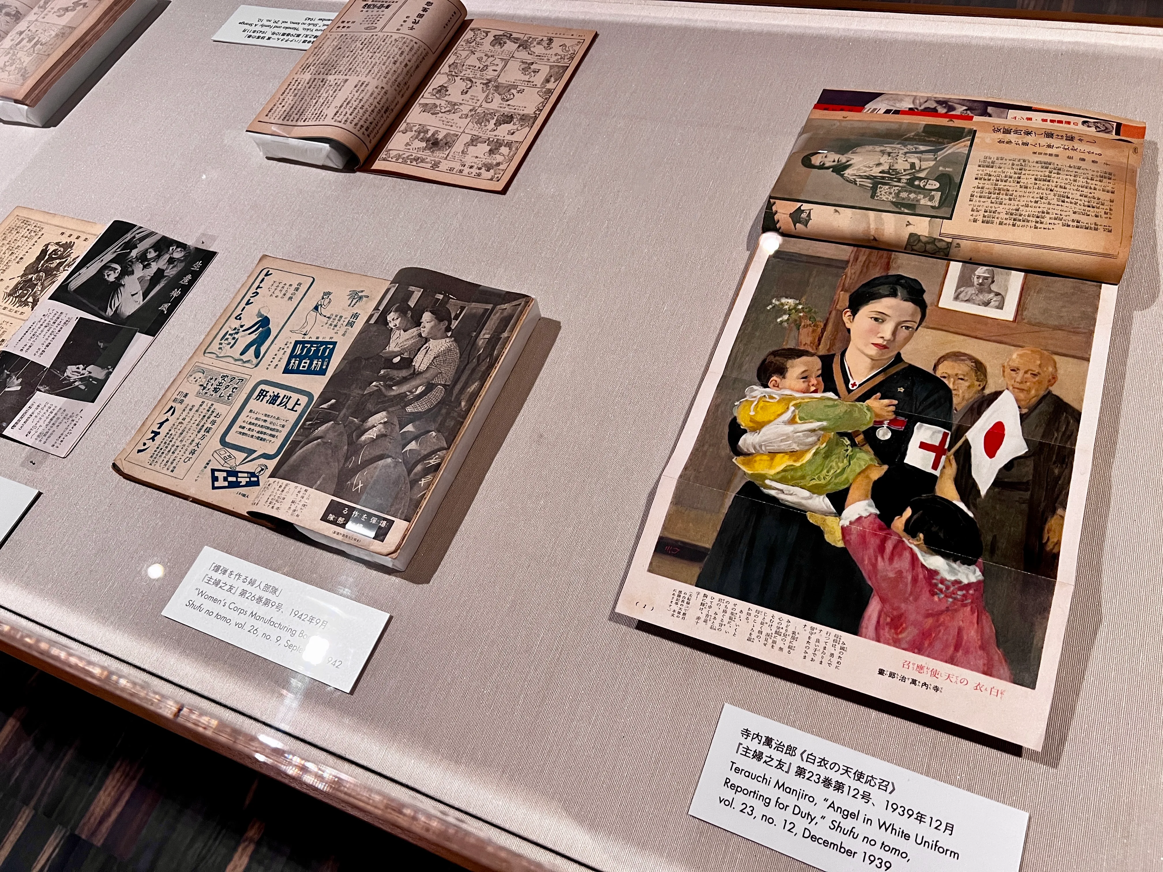 本展示室は、「絵画や雑誌に登場する女性たちのイメージを通して、日常と戦争が隣り合わせにあった当時の暮らしと社会における女性の多様な役割を紹介」するもの。同館の説明によれば、「日中戦争から太平洋戦争にかけて日本では総力戦体制が敷かれ、『前線で戦う男性』と『銃後を守る女性』という構図が美術や文学、雑誌など、あらゆるメディアを通じて浸透していきました。良妻賢母として家庭を支える女性たちの姿は、しばしば戦時下の典型的なジェンダーロールとして受け入れられました。一方で、この時代には軍需工場で武器を製造したり、応召して従軍看護師として戦場に赴いたりする女性たちも存在していました」(公式サイト)という。