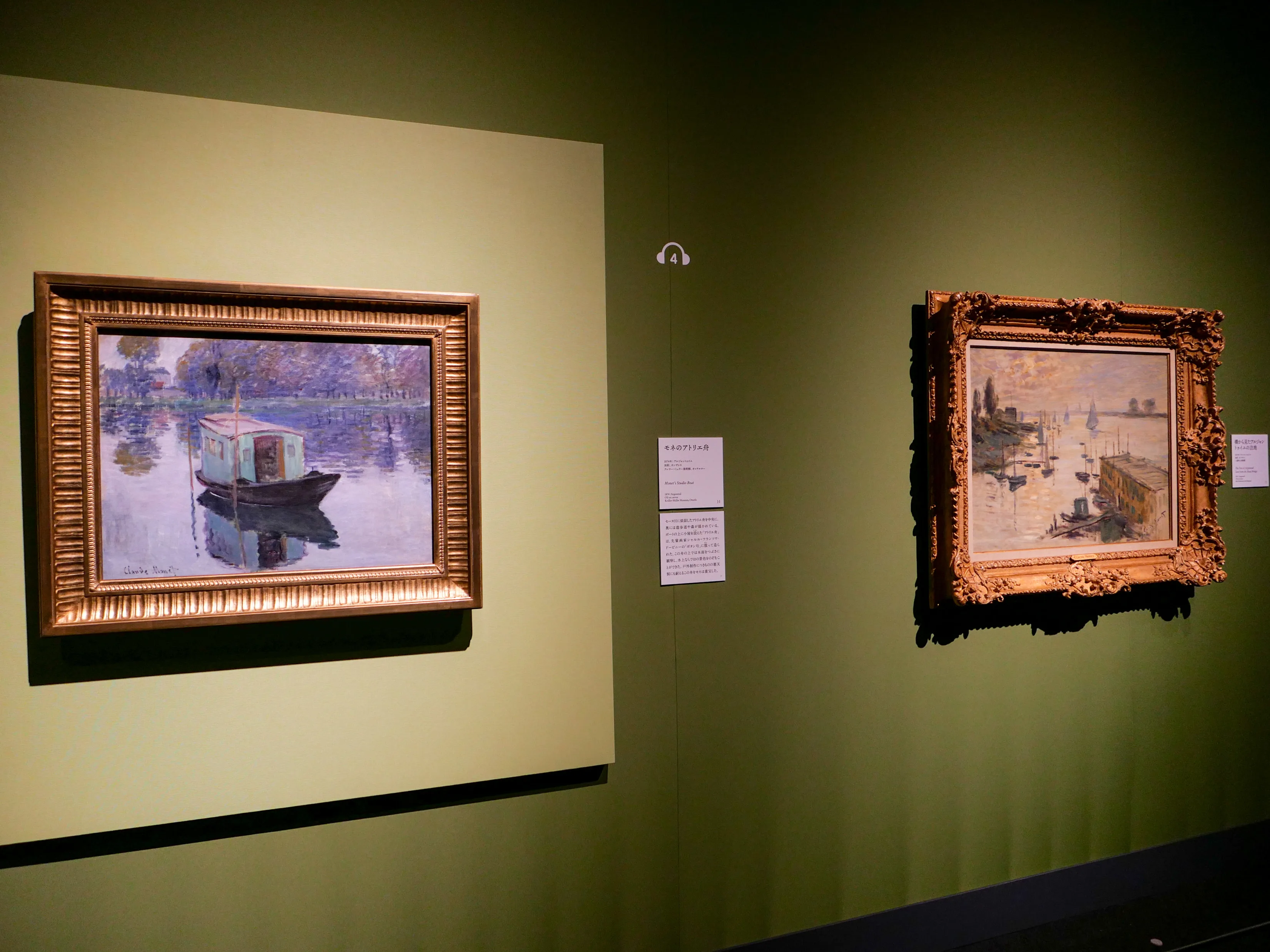 本章で目を引いたのはユニークな「アトリエ舟」が描かれた《モネのアトリエ舟》(1874)。ボートの上に小屋を設えた移動式アトリエは先輩画家で「水の画家」とも言われるシャルル=フランソワ・ドービニーのアトリエ舟「ボタン号」を真似たもの。悪天候もものともしないこのアトリエで、モネは水上ならではの景色を絵画に残した。このアトリエ号は本章の他の絵画の中にもひっそりと登場するため、探し絵感覚で見つけてみてほしい。