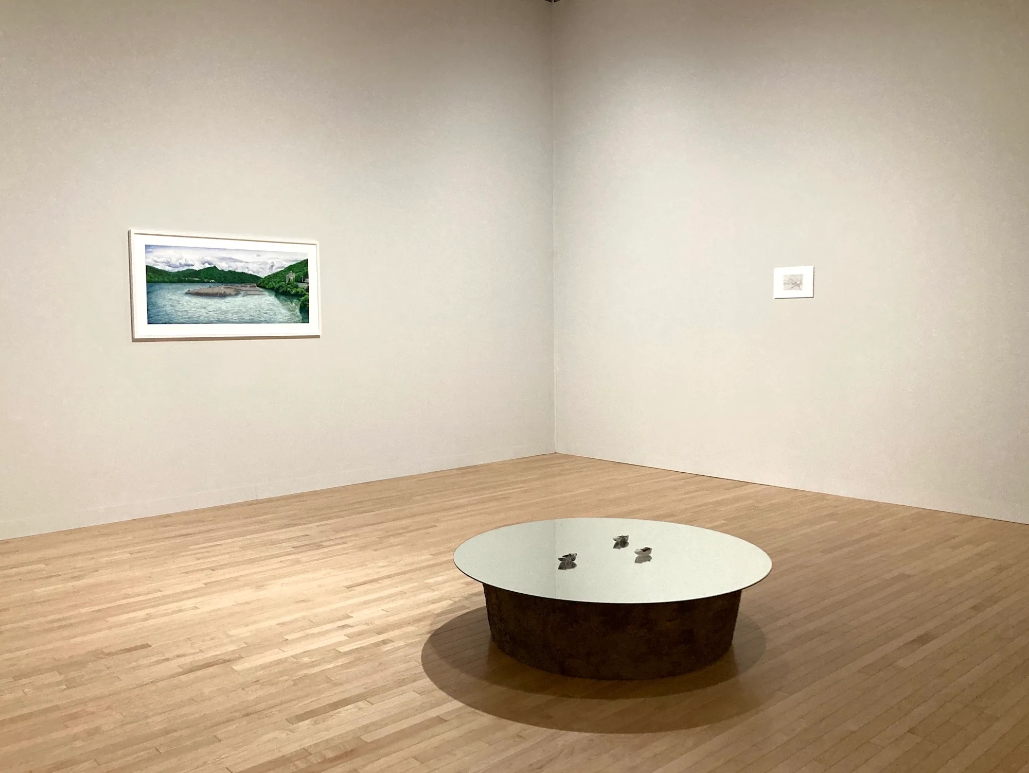 今回の展示は、事件のあった、相模湖にほど近い「津久井やまゆり園」の地域史から始まる。同園は東京オリンピックと同じ1964年に開園している。日中戦争が激化した1938年、ダム建設で湖底に沈んだ集落を描いた水彩画や地図。相模湖の水を京浜工業地帯に運び、京浜工業地帯の植物を相模湖に移植する映像作品。