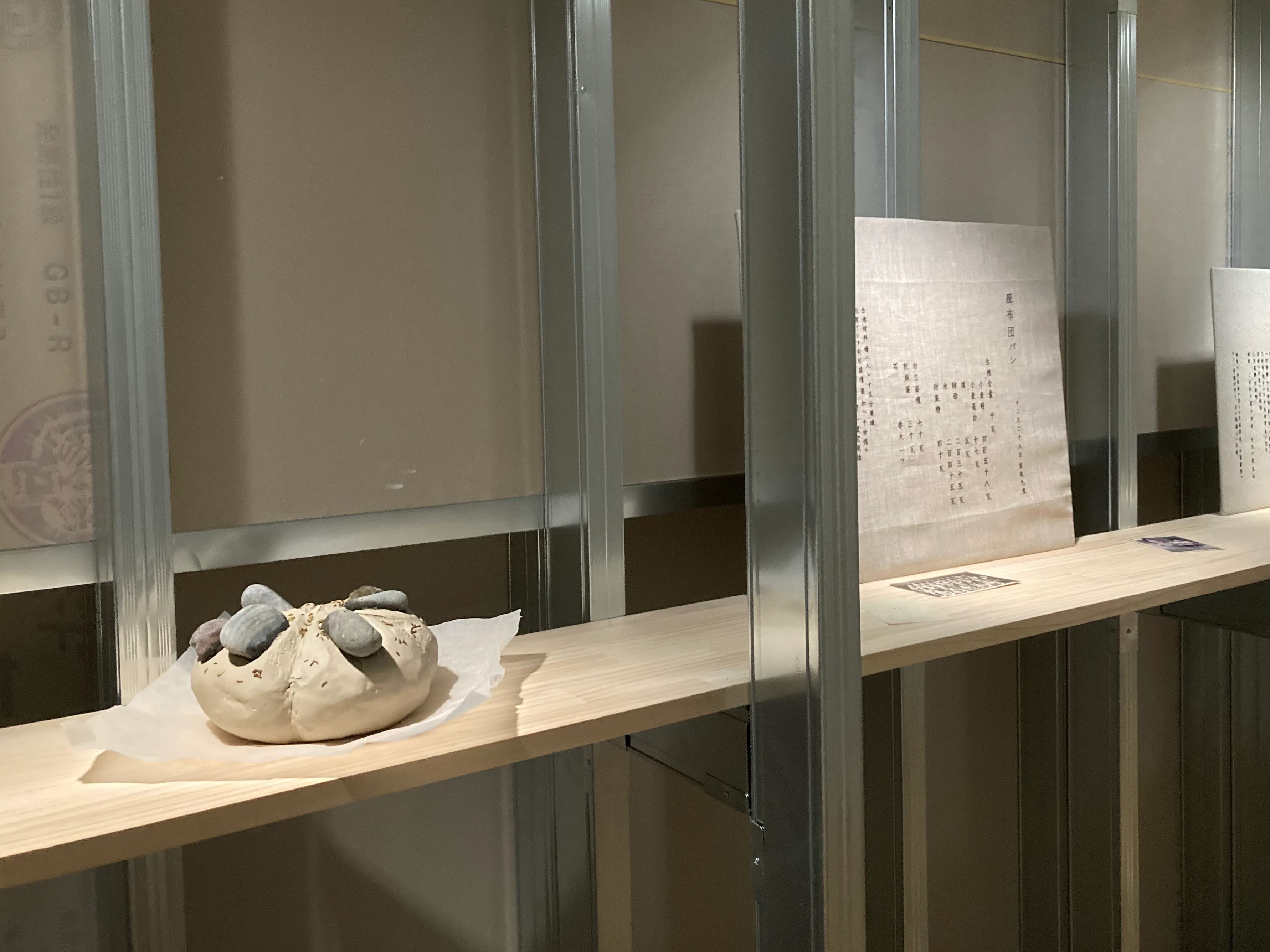 「手作りパンを焼いていた時期があります。意地悪ではなく、パンに石を入れたものを食べさせたいと思って、入れてもいい理由を考えたら食べてくれるかもと思って17個考えました。ミネラルが採れるとか、ありそうな理由となさそうな理由を。それに母方の家族史と組み合わせて、実在した人物が石を入れて焼いたパンを発明したというお話をつくりました。そうしたら展示を見た親戚が信じちゃったんです。家族が知らない家族の話ってあるので、文章としてしっかり書かれると信じてしまうのかなと思いました」。