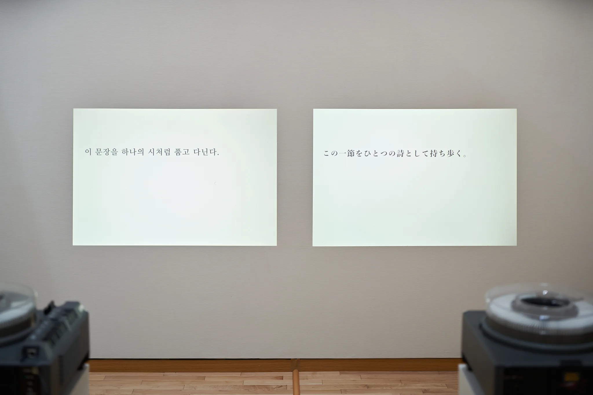 会場には、日韓英3言語のスライドが映し出されている。置かれている小さな冊子には「シボレート/schibboleth」にまつわる物語が記され、持ち帰ることもできる。
