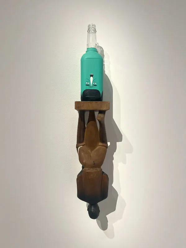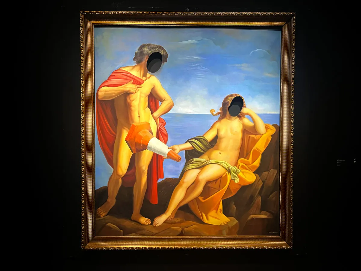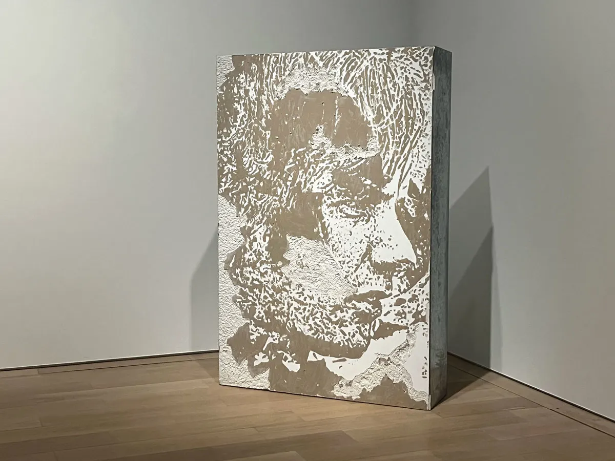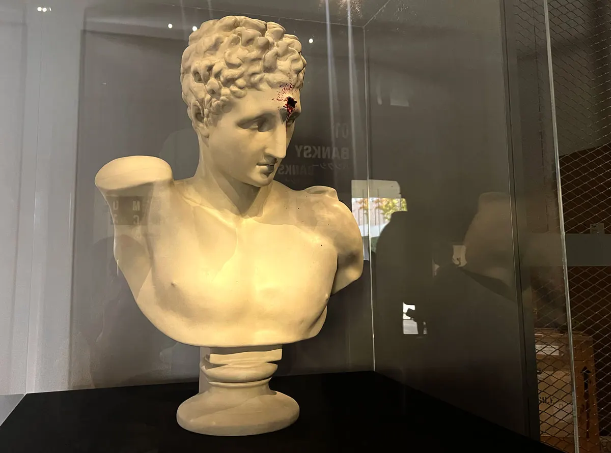 入り口で出迎えてくれるのは、バンクシーによる衝撃の作品《ブレット・ホール・バスト 弾痕の胸像》(2006)だ。ヘルメス像に似た鋳造のこめかみに、まさしくいま銃弾が撃ち込まれている。バンクシーの代表的彫刻作品で、彼の国際的な知名度をさらに押し上げた作品でもある。彼の狙いは伝統芸術への批判であり、強欲資本主義が闊歩する現代社会への一矢とも言えるだろう。