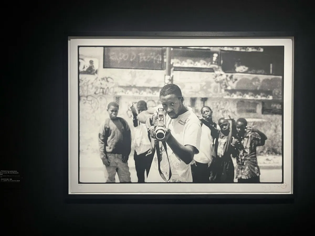 フランスの写真家であるジェイアール。13歳の時、「フェイス3(Face3)」というニックネームで街中に作品を描き始める。《28ミリメートル、ある世代の肖像、強盗、JRから見たラジ・リ、レオイスケ モンフェルメイユ 2004》(2011)は、彼のドキュメントカメラマンとしての腕が生かされている。男性がもっている銃のようなカメラは、時により、武器と同じような力を持つことを示唆している。