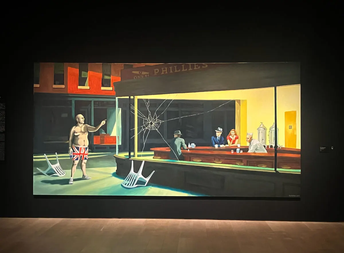 エドワード・ホッパーの作品《ナイトホークス》をオマージュした作品が、《アー・ユー・ユージング・ザット・チェア その椅子使ってますか?》(2005)だ。イギリス国旗を履いた男性が、礼儀正しく椅子が空いているかという質問をしながらもまるでフーリガンのように、窓ガラスを割って入ろうとしている。