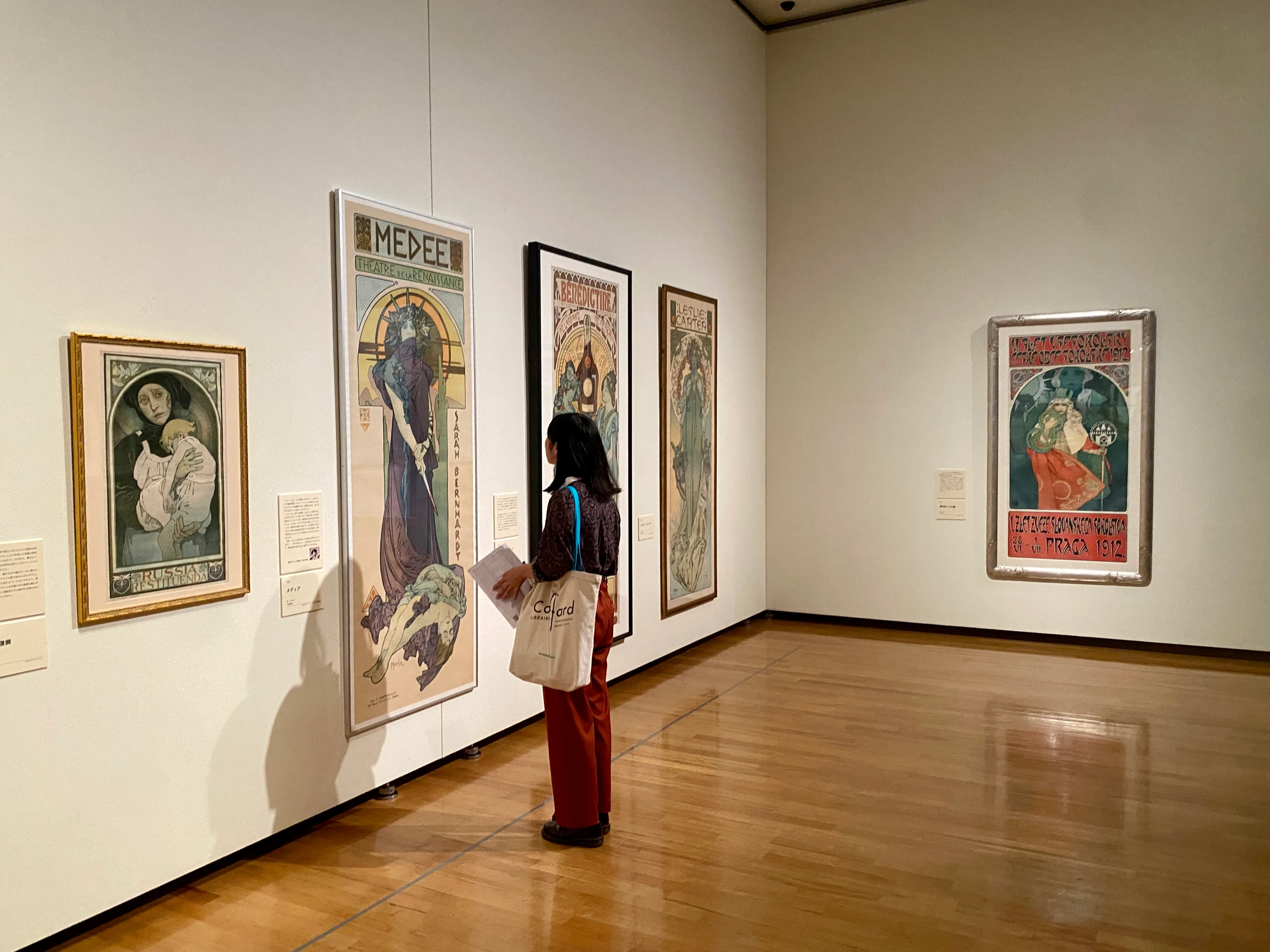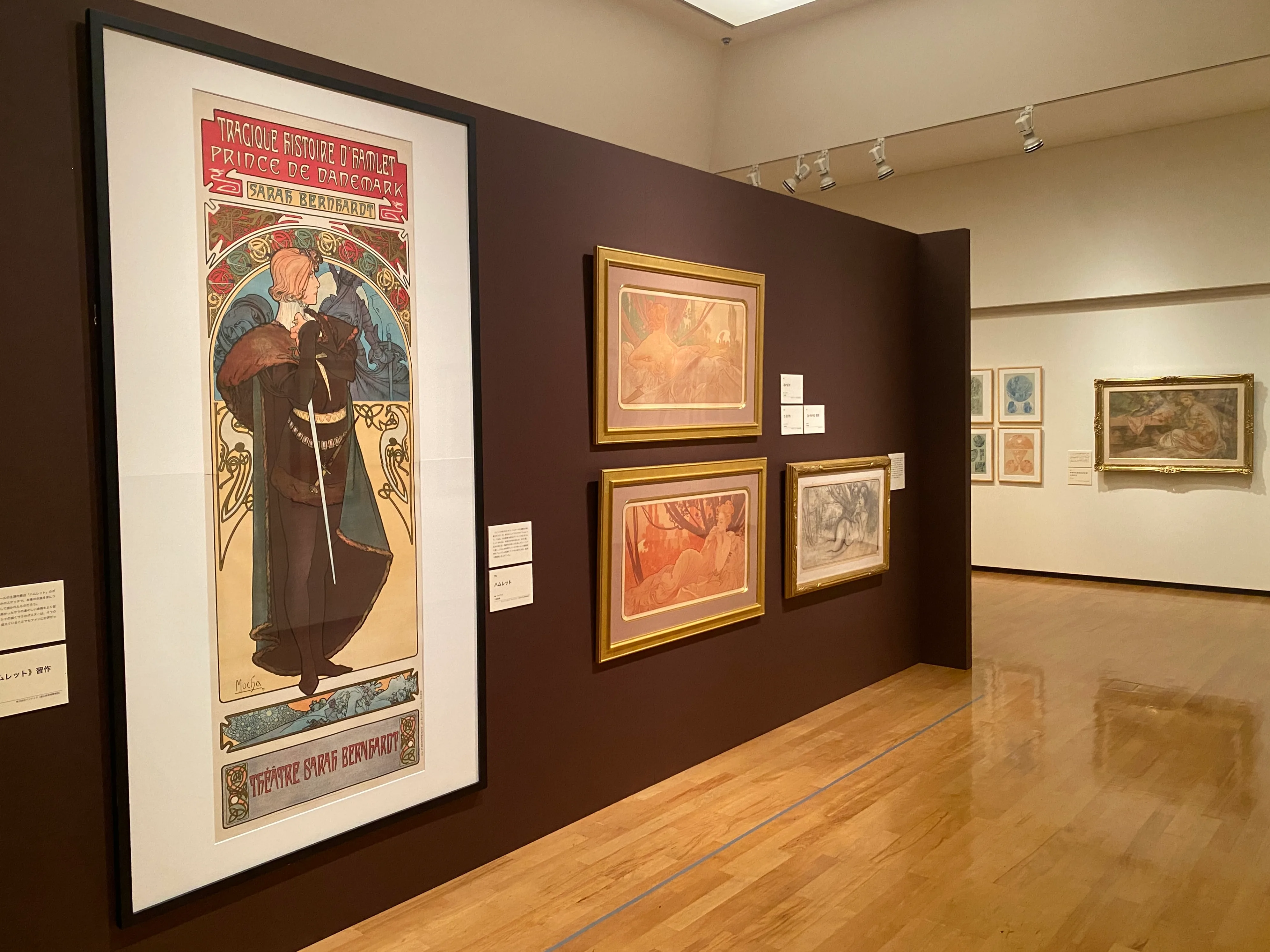 初期のミュシャを見出した重要な人物としては、世紀末のパリを代表する女優サラ・ベルナールが挙げられる。彼女の主演した舞台「ジスモンダ」のポスターを手がけたミュシャは一躍パリにその名を馳せるアーティストとなり、演劇や商品広告のためのポスター、パッケージデザインなどを数多く手がけた。本展の最初の展示室では、彼が手がけた挿絵やポスター、ビスケットや紅茶のパッケージデザインなどが展示されていた。