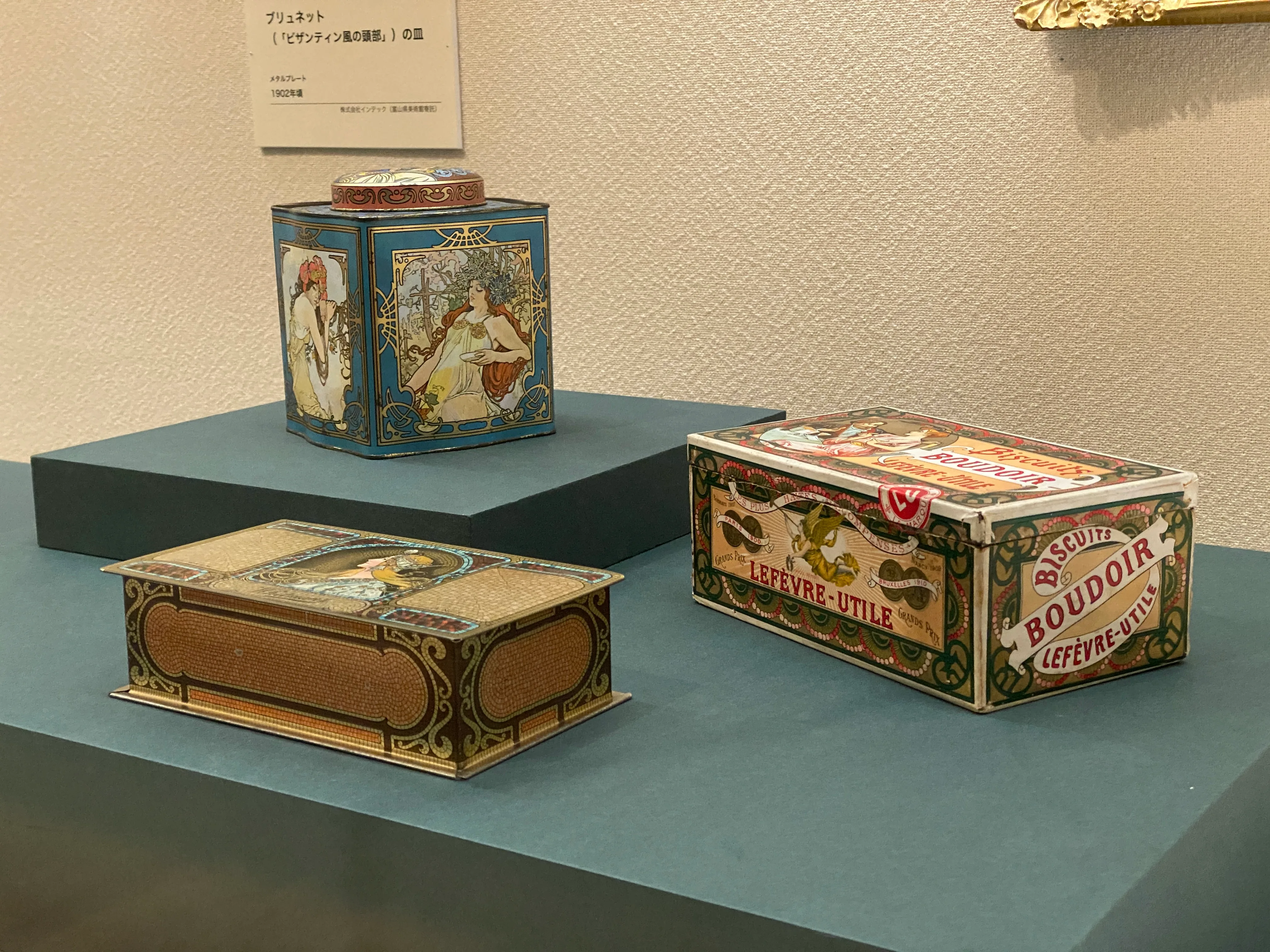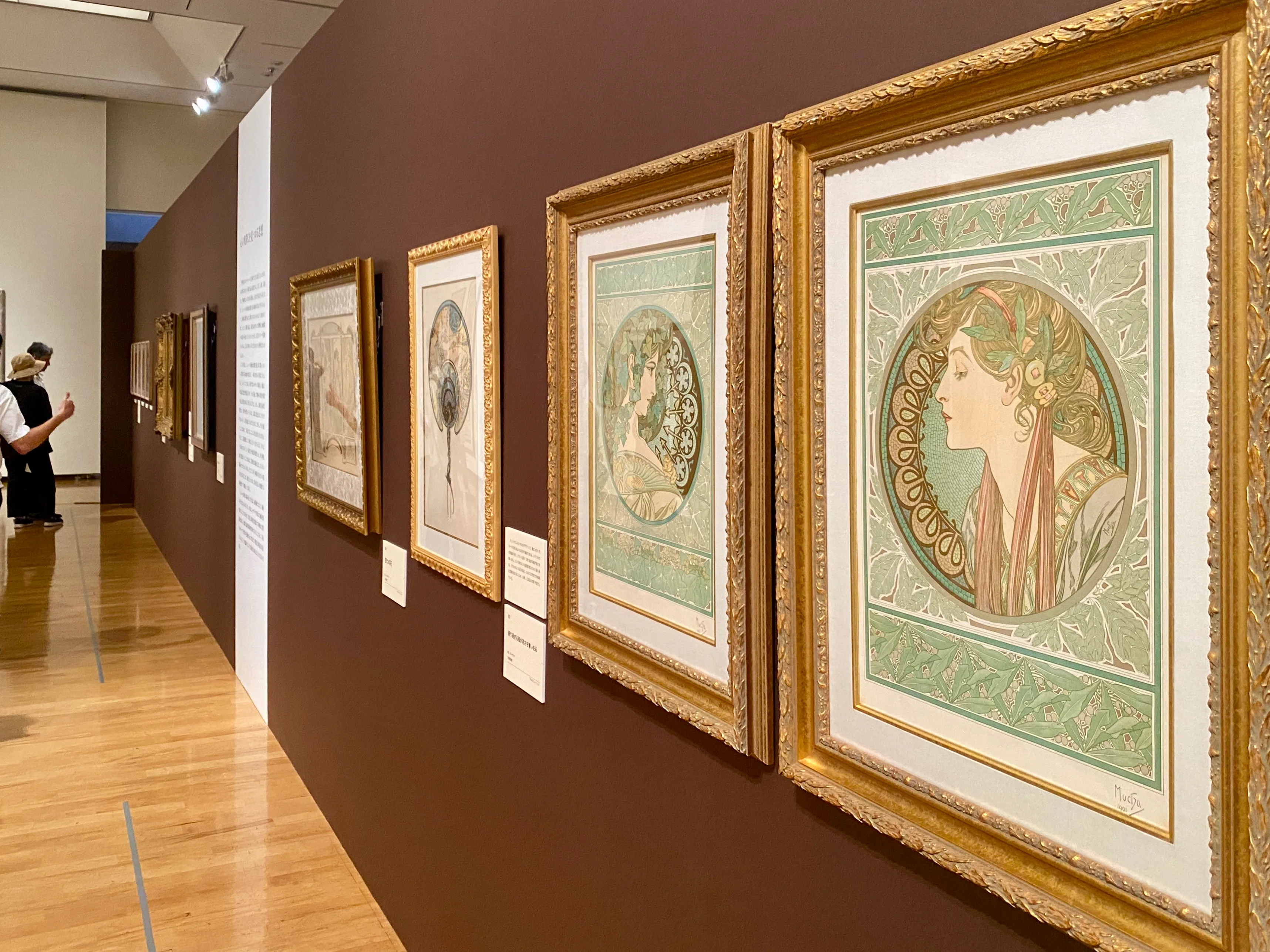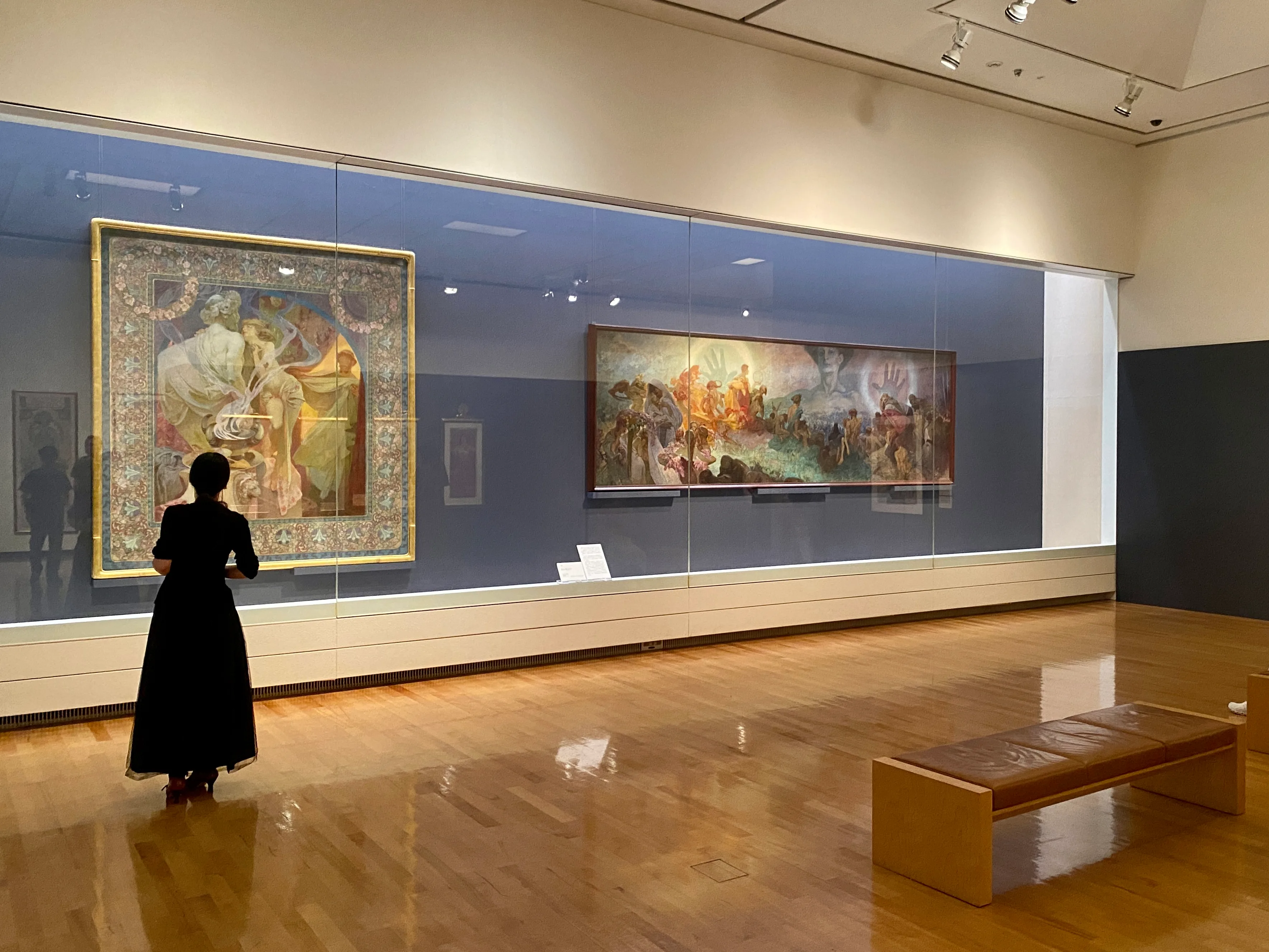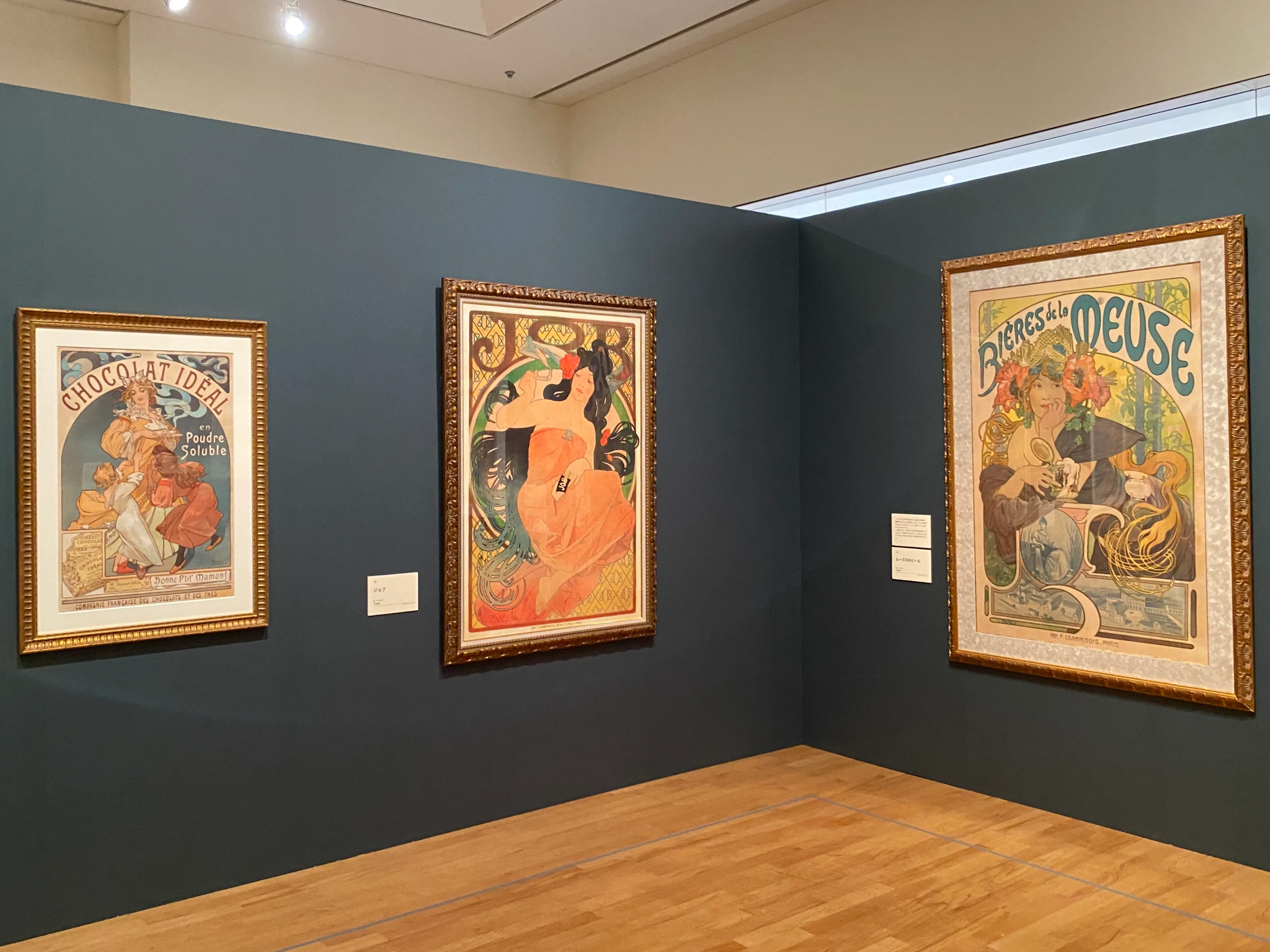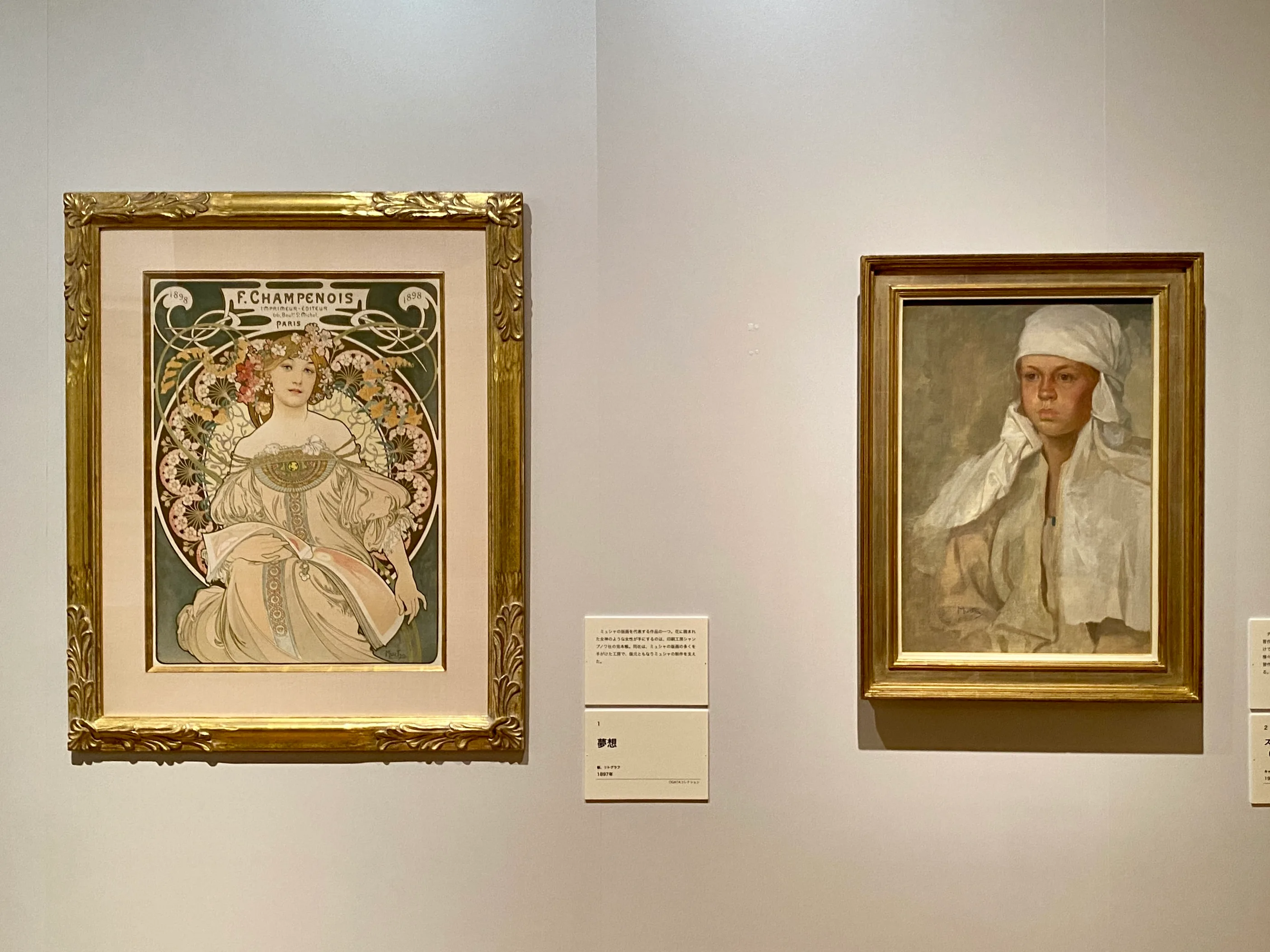 展示風景より、左からアルフォンス・ミュシャ《夢想》(1897)、《スラヴの民族衣装を着た少女(《スラヴ叙事詩》習作)(1911)