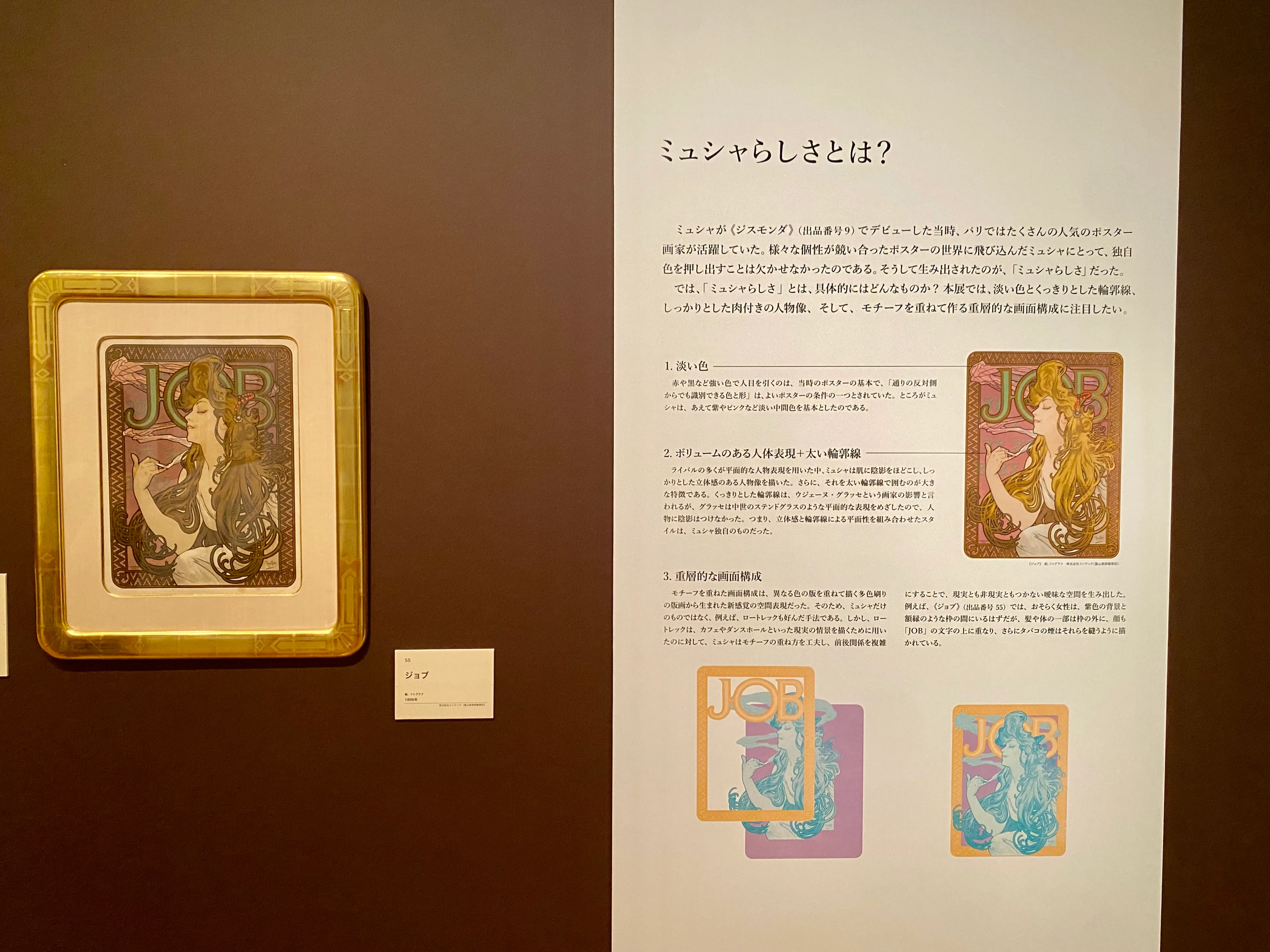 ここからは、展示の構成に沿って会場の様子をお届けしよう。第1章「版画でたどるミュシャの画業」は、ミュシャの画業の変遷が概略的に紹介されるセクションだ。画家を目指しパリへと出てきた若きミュシャは、挿絵画家として下積みを重ね、版画(多色刷りのリトグラフ)の分野で才能を見出される。本格的に油彩画に取り組み始めたのは、彼がポスター画家としてパリやアメリカで成功をおさめた後のことであった。