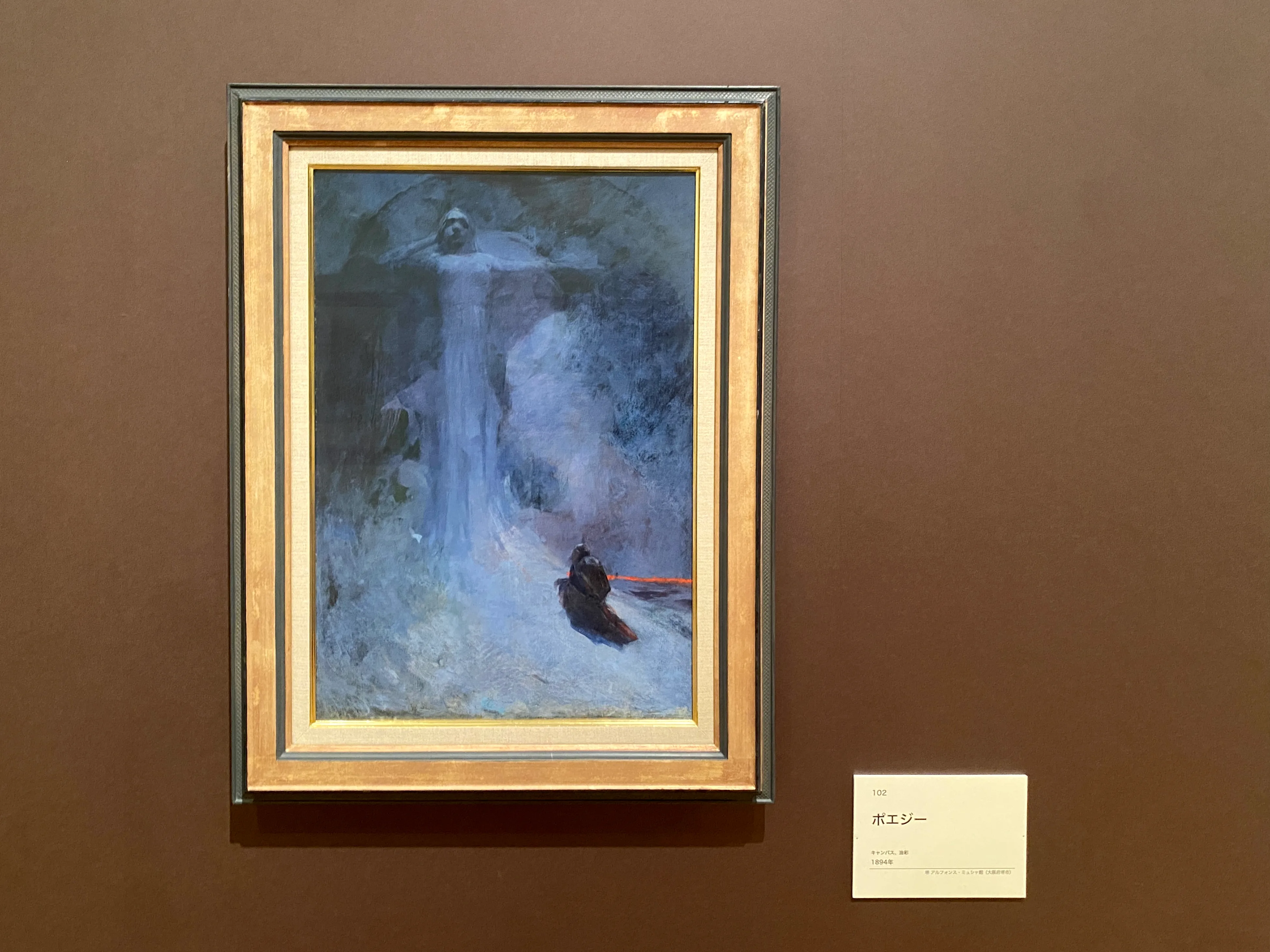 第2章後半〜第3章「ふたつの世界をつなぐ造形」では、いよいよミュシャの油彩画が本格的に紹介される。彼の油彩画は、いわゆる「象徴主義」という芸術動向に位置付けられることが多い。象徴主義とは、産業革命以降の物質的/商業主義的な世界観に対する反発として起こった芸術運動であり、心の世界に向き合う神秘的な世界を「暗示する」ことを志向する。たとえば《ポエジー》(1894)は、フランス語で「詩情」を表す語がタイトルになっているが、詩を直接表現するようなモチーフは一切用いられていない。暗闇の中で一心に祈る人を描くことで、詩の持つ趣や魅力を表現している様は「いちばん大切なものを書こうとしない」象徴主義らしさの典型とも言えるだろう。