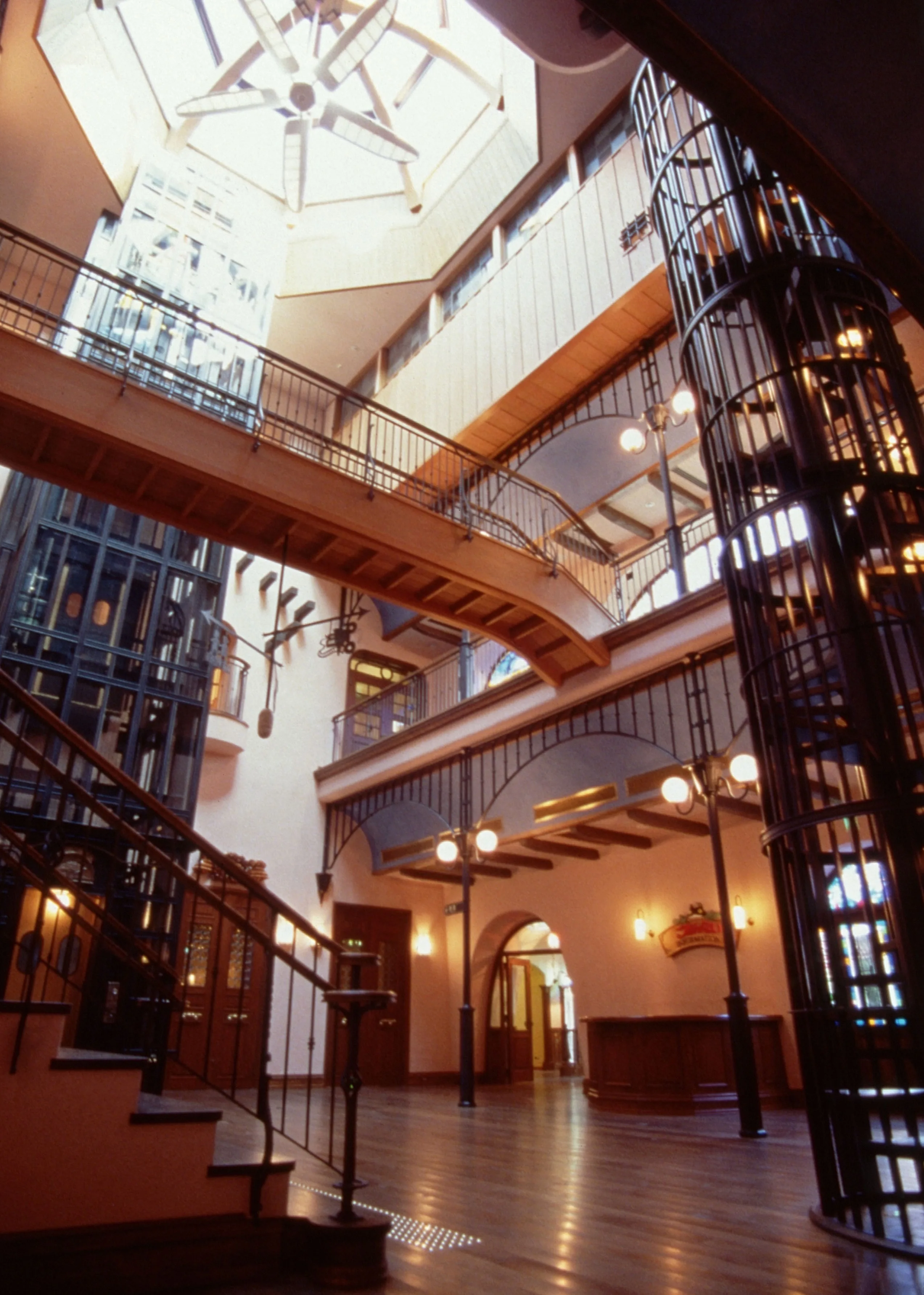 地下1階から地上2階までの吹き抜けの大空間、中央ホール。天井のガラスのドームに海を泳ぐ黄色いクジラや、妹たちと泳ぐポニョが描かれ、階段や廊下の手すりには取れそうで取れないガラスの"ふしぎ玉"が輝く。螺旋階段や空中廊下、張り出したテラスが子供の冒険心をくすぐる。晴れた日には窓をあけて光と風が入るこの空間にも、作品の保護より、居心地の良い場としての美術館をつくりたいという哲学が現れている。