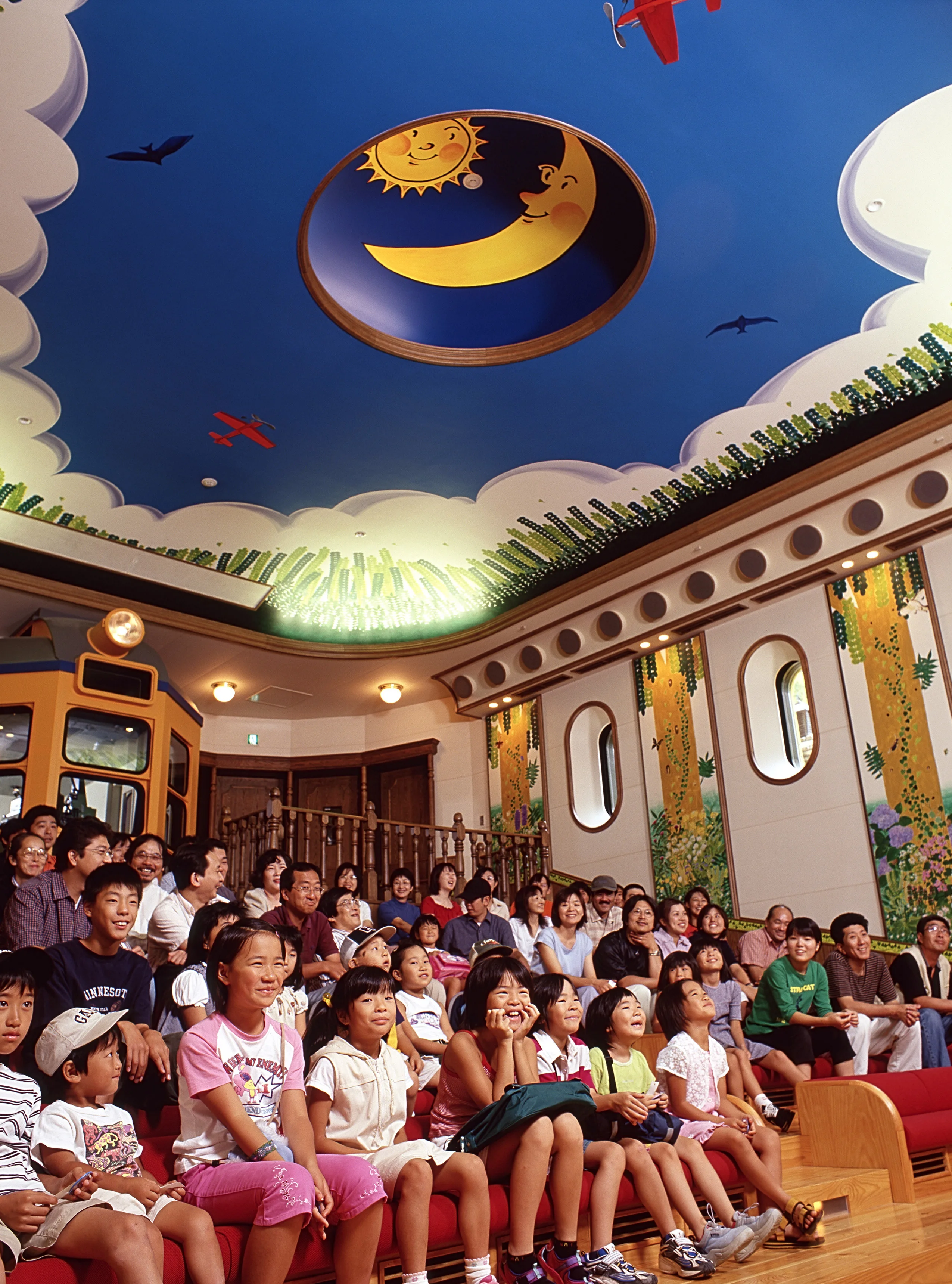 地下1階にある映像展示室「土星座」は、初めて映画を鑑賞する子供のための小さな映画館。三鷹の森ジブリ美術館とジブリパークでしか観られないオリジナル短編アニメーションは、子供が楽しめるようほっとするお話が多い。小さな子供が怖がらないように、映画館には窓が設けられ、天井には太陽や飾りの工夫がされている。