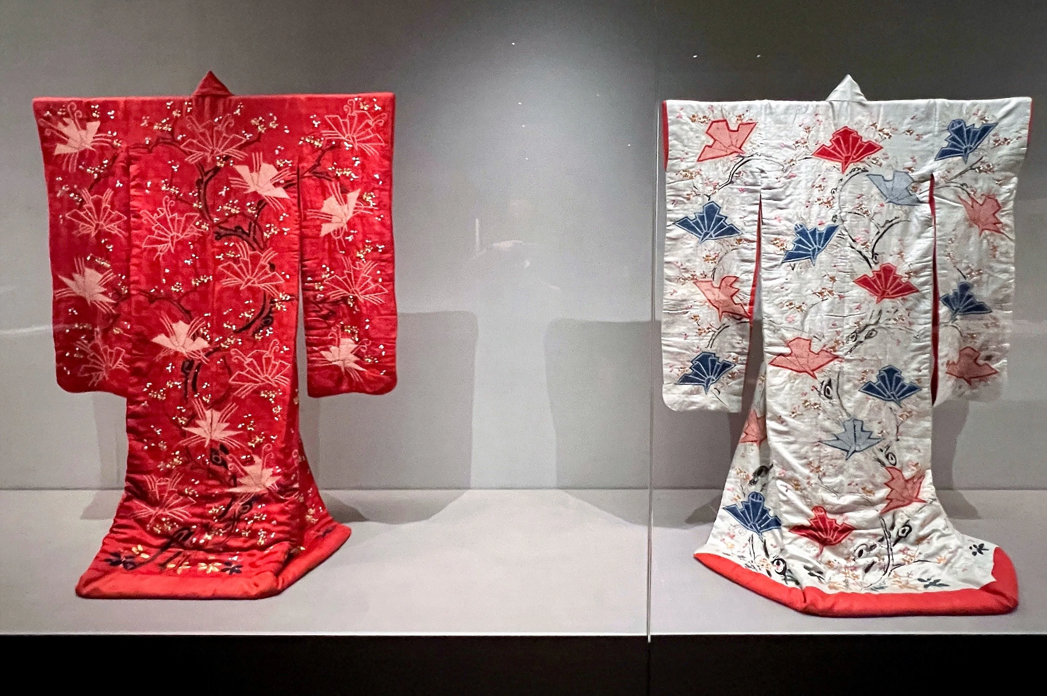 抽象性を高めた蝶の文様をあしらった《梅樹熨斗蝶模様振袖》は、じつに鮮やかで美しい。江戸時代の裕福な町人の婚礼衣装だった。蝶は夫婦円満を表すという。展示されている2領のほかにもう1領あり、花嫁は婚礼時に、いわゆる「お色直し」のような着替えをしたそうだ。こうした着物から江戸時代の婚礼風景を想像してみるのもまた楽しい。着物を替えて現れた花嫁の姿は、宴に出席した人々の目にはじつに華麗に映ったに違いない。