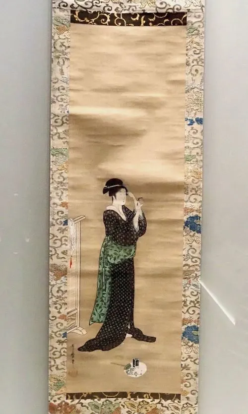 本展図録の解説によると、「恋に焦がれて鳴く蝉よりも鳴かぬ蛍が身を焦がす」という歌は室町時代から知られていたという。さらに、歌麿は狂歌師としても活躍しており、蛍と恋の結びつきをこうした絵画で表現した可能性があったとも。