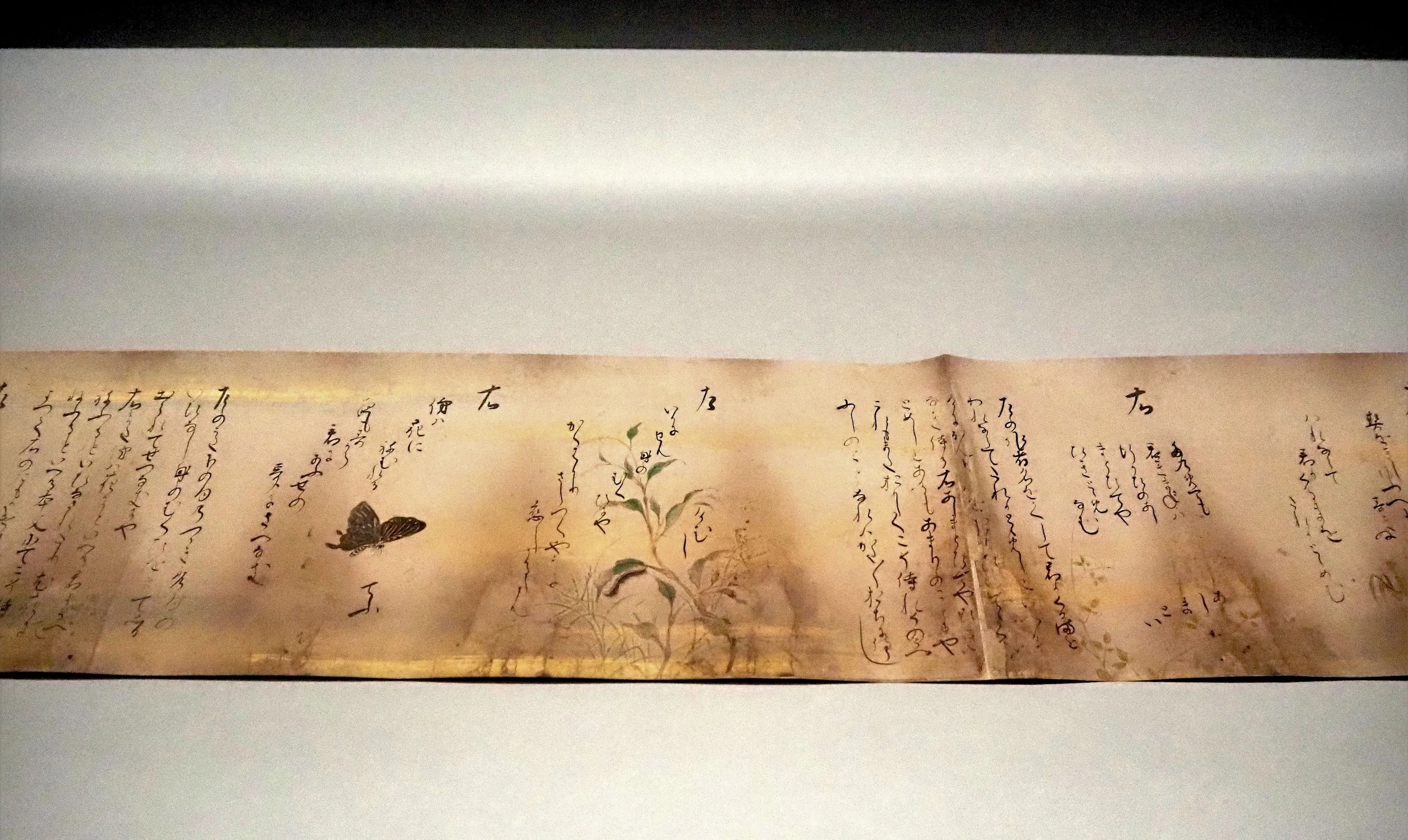 ひらがなの優美さが際立っているのは、平安の流れを受け継いだ雅やかな表現のたまものだ。背景の絵には、草木に交えて、蝶、毛虫、カマキリなどの虫が、柔らかな筆致で描かれている。蝶はもちろんのこと、葉の裏にいる毛虫にも親しみがわく。一見、巻物を美麗に飾る料紙のようなあしらいだが、それぞれの虫のそばに和歌が書き添えられているので、むしろ、吹き出しのない漫画に近い表現方法である。絵は没骨(もっこつ)と呼ばれる輪郭線のない技法で描かれているため、線で書かれた文字は自然に目に入ってくる。作者の如慶は、絵と文字を効果的に配するグラフィック・デザインのセンスも持ち合わせていたようだ。