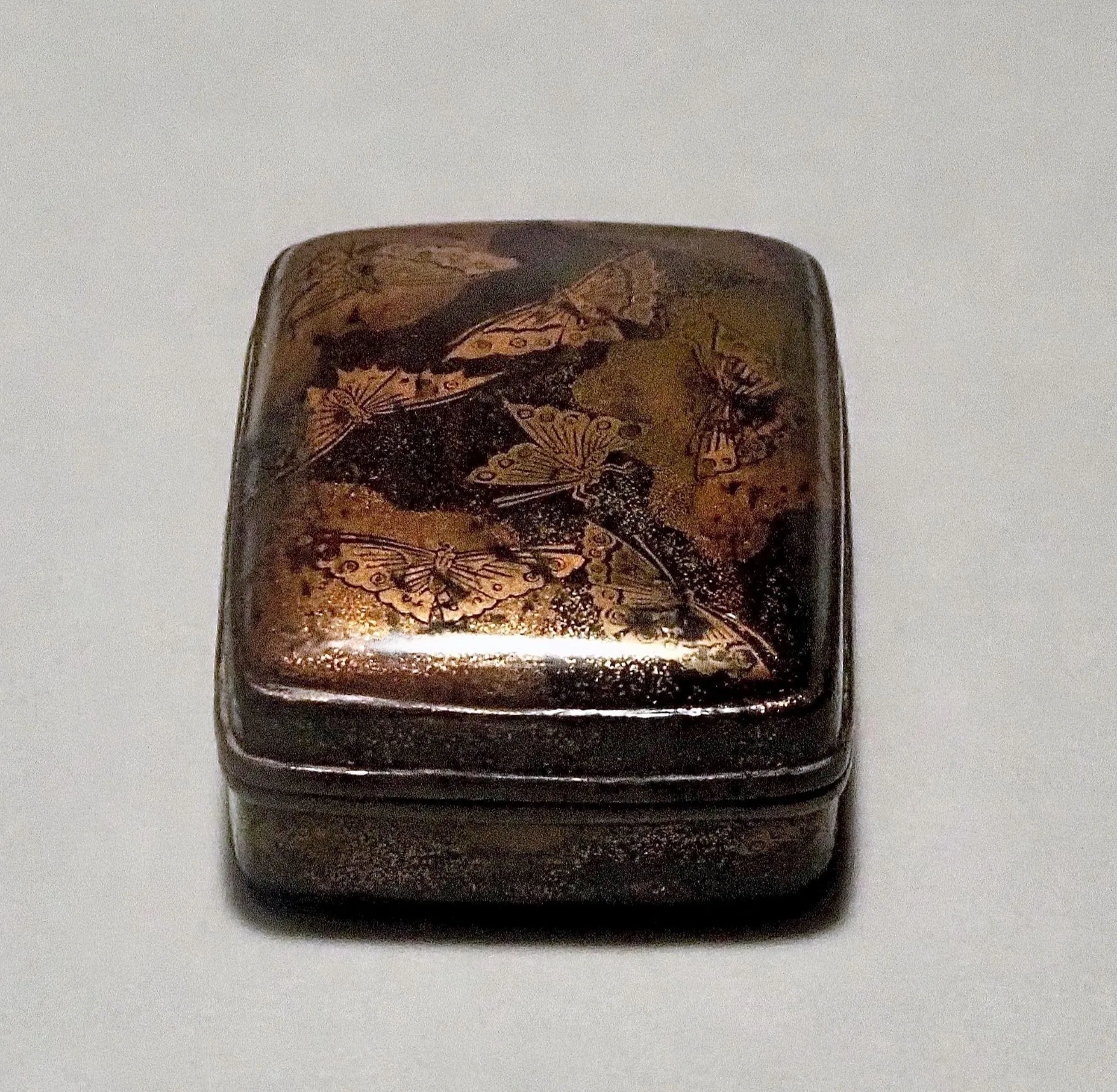 虫がヴィジュアルで表現された江戸以前の例として、鎌倉時代の《蝶蒔絵香合》が出品されていた。数センチ大の小さな箱の蓋に、たくさんの蝶が金蒔絵であしらわれている。蝶は和歌にはあまり詠まれなかったものの、中国の説話『胡蝶の夢』の伝来などによって、平安の昔から、意匠としてさまざまな工芸品にあしらわれていたという。