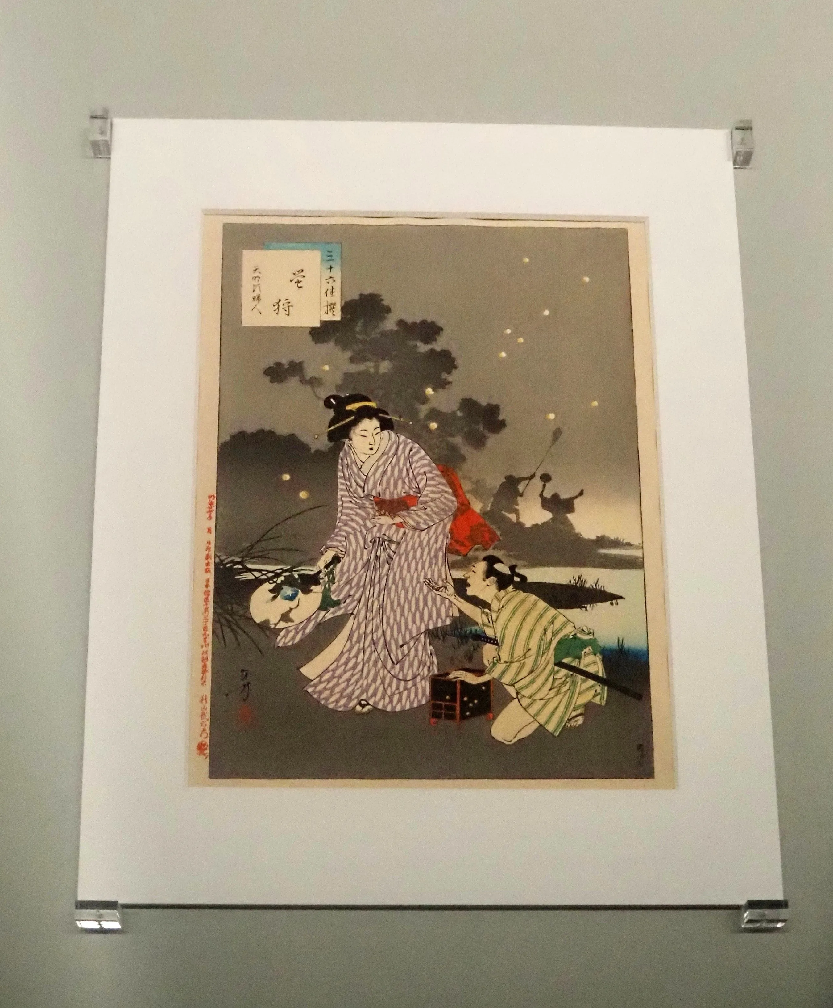 明治時代の日本画家・浮世絵師、水野年方の《三十六佳撰 蛍狩 天明頃婦人》は、江戸時代の錦絵(多色摺り木版画)の技法で制作されている。「最後の浮世絵師」と言われた月岡芳年の弟子だった年方は、錦絵の制作に力を入れた。シルエットで表された夜の陰の部分に、点で表されたたくさんの蛍が舞っている。手前の男の子はどうやら蛍を捕まえて虫かごに入れようとしているようだ。「蛍狩り」は多くの場合、蛍を見て鑑賞することを意味するが、この作品では本当に蛍を狩っている。江戸の趣が色濃く残っている作品である。