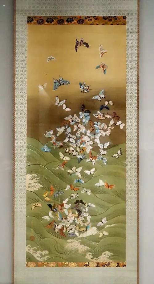 自然の中で妖しく優美な姿を実際に目にしやすい蝶が、いにしえの和歌にあまり登場せず工芸品の意匠にしか用いられてこなかったのは、考えてみれば不思議である。しかし、江戸時代になると、群蝶図が多く描かれるようになった。この展覧会の企画を担当した宮田悠衣学芸員によると、中国清朝からもたらされた草虫図の影響を受けて制作されるようになったという。