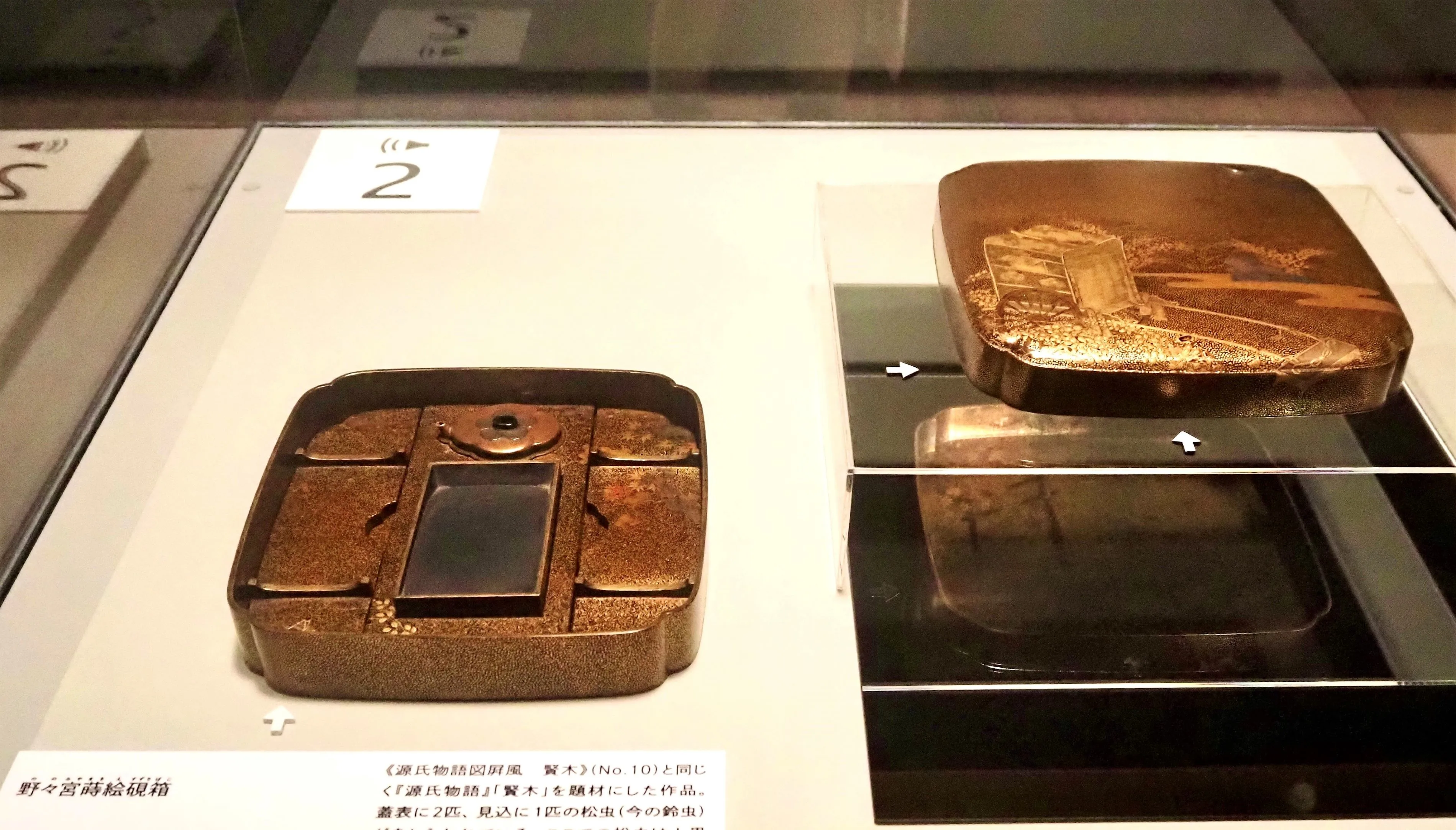 こうした和歌や小説などに見られる虫への親しみがヴィジュアルの形で盛んに現れたのが、江戸時代だった。《野々宮蒔絵硯箱》は、『源氏物語』の「賢木」を題材にした蒔絵箱だ。光源氏が載っている牛車をメインモチーフにした華やかな蓋表などに、4匹の鈴虫(『源氏物語』では「松虫」と書かれている)が、離れ離れに極めて小さくあしらわれている。物語を知っている者は、虫の姿を見つけるのも楽しみのひとつだったのかもしれない。江戸初期の風雅な趣味の世界が、こうした工芸品に現れているのである。