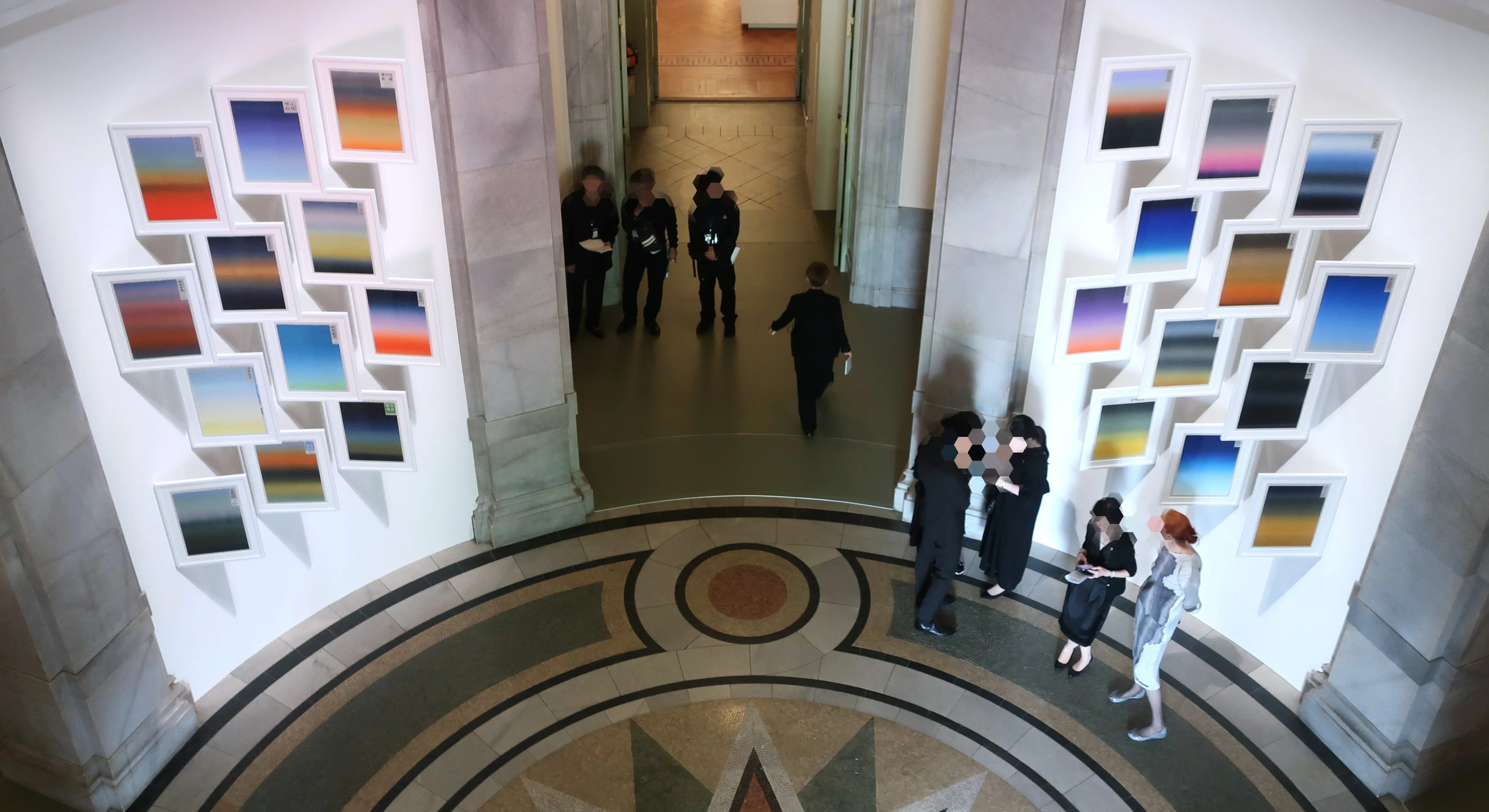 館内に入ってまず目に飛び込んでくるのは、ニューヨークを拠点にする日本人アーティスト・澁谷翔(しぶや・しょう)が、2024年の元日から2月5日まで、47都道府県を旅して制作した《日本五十空景》だ。