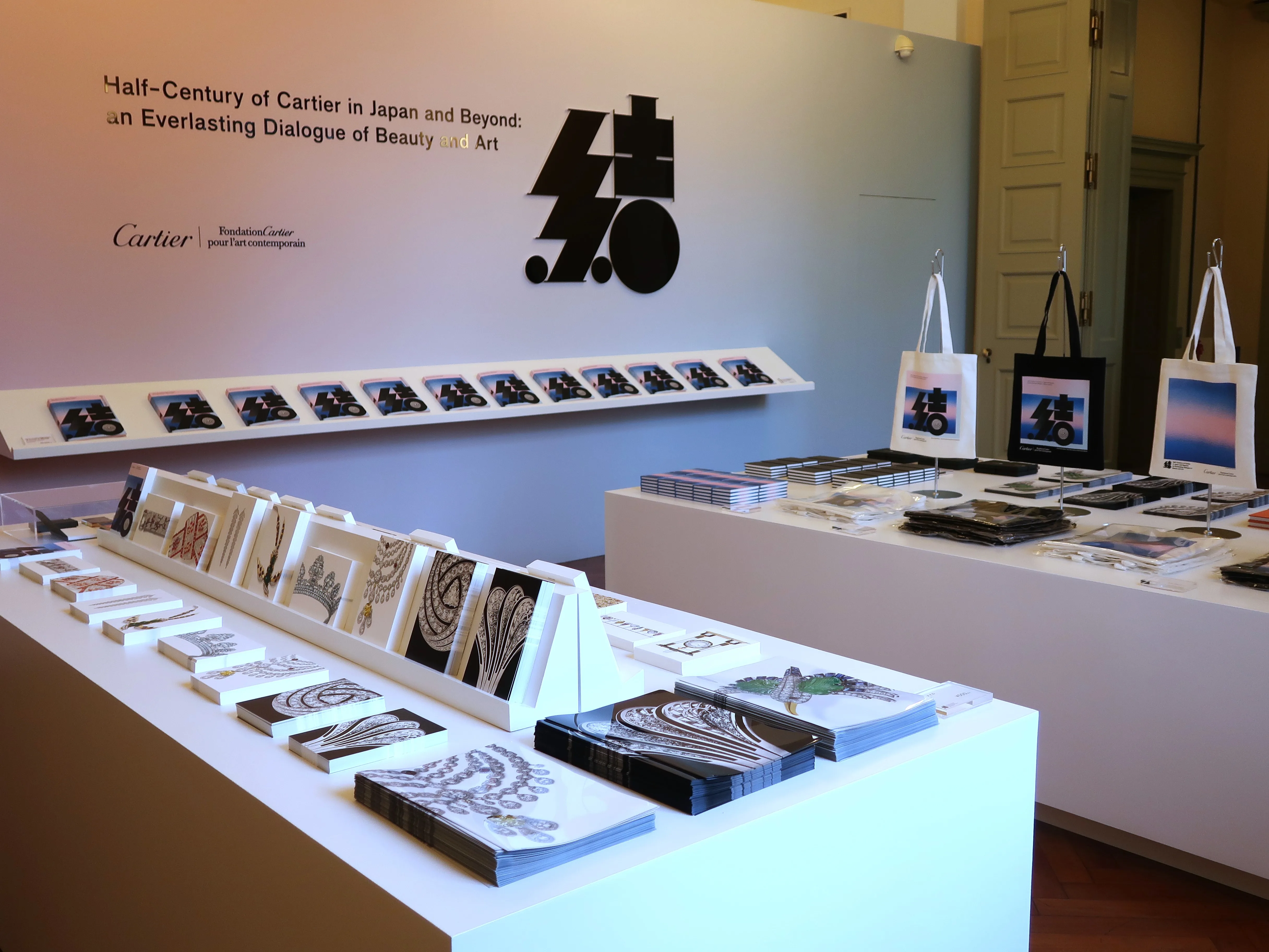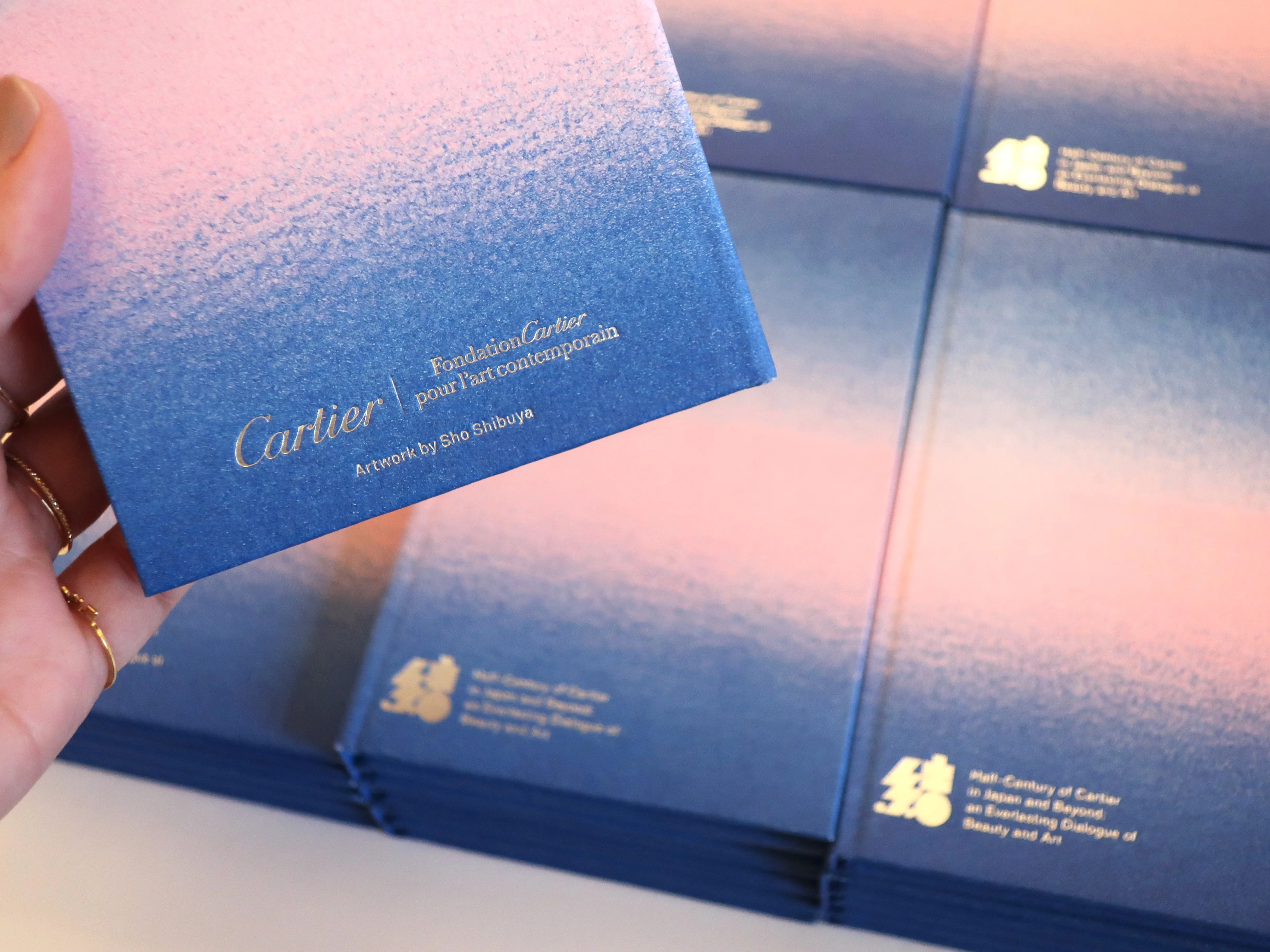 特設ショップでは、多数のオリジナルグッズが展開されている。筆者が気になったのは、キービジュアルになっている澁谷の作品を表周りに用いた、手のひらサイズのノート。表紙と裏表紙それぞれに、金色の箔押しで、本展のロゴデザインや、カルティエと財団の名前があしらわれている。