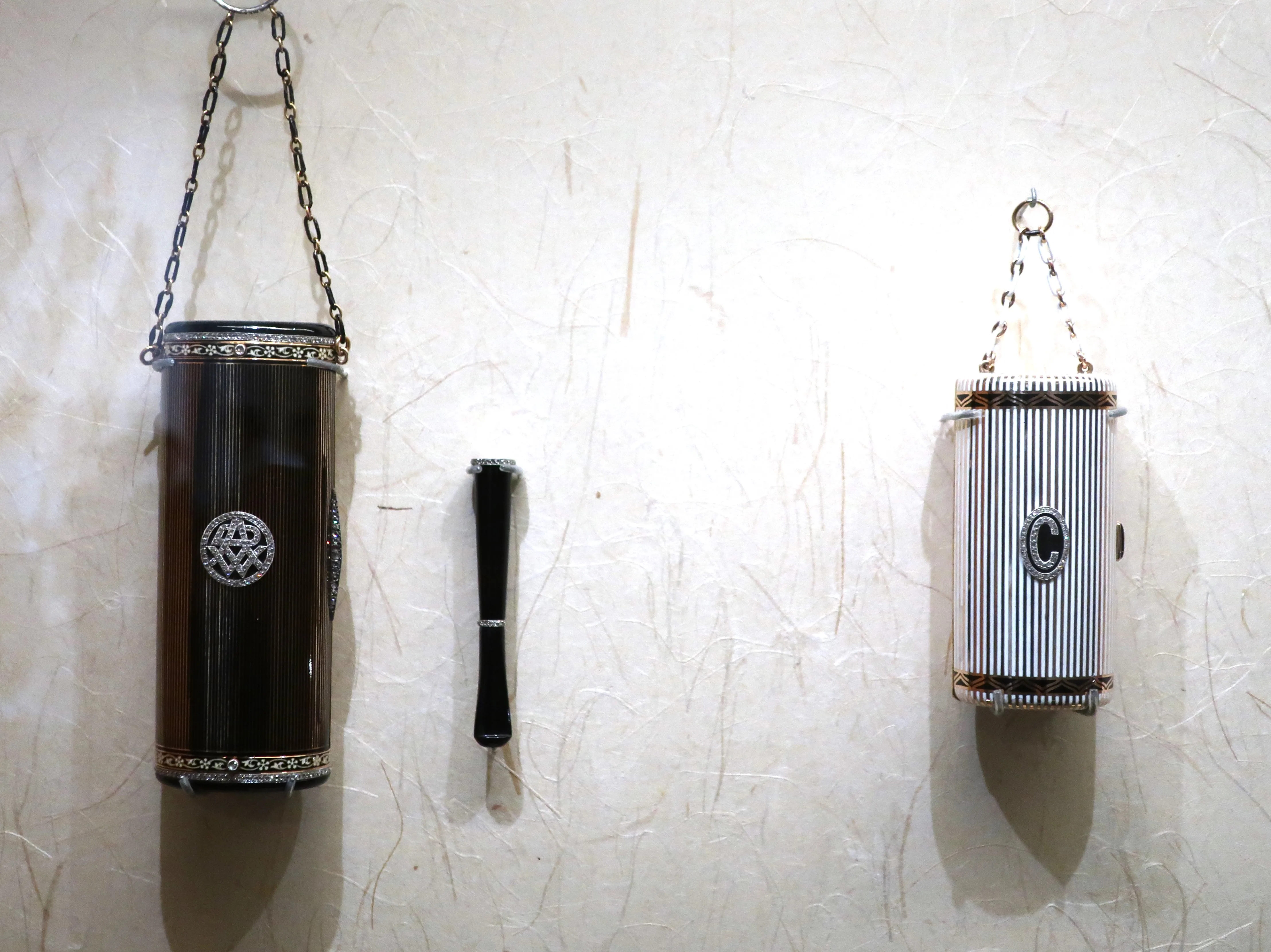 たとえば、印籠から着想したというシガレット ヴァニティケースは、片手に乗るのほどのサイズながら、1890年に制作された蒔絵のようなゴールドのものや、ココ・シャネルへのプレゼントとして依頼されたものなど、細やかな装飾が美しい貴重な品々を紹介している。