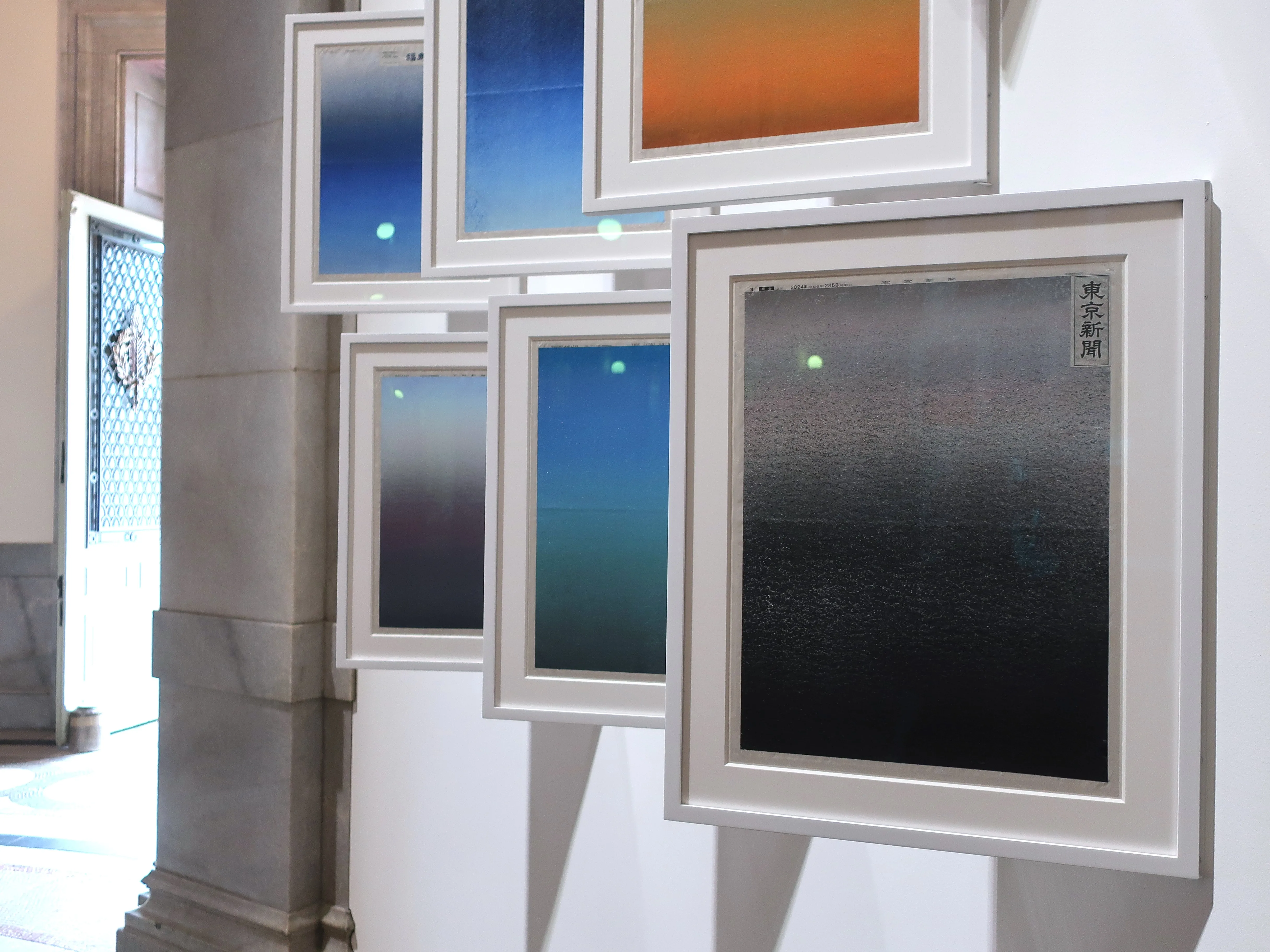 モチーフは、訪れた地域で発行されている日刊新聞を購入したとき、目にした空の色だ。朝焼けのような淡い色のグラデーションから、真っ青な日中、夕暮れや夜まで、様々な時間帯を想起させるが、澁谷は、実際の空の色を忠実に描くことにこだわらずに取り組んだという。撮った写真をもとに、日本各地の宿泊先で、毎回、室内を養生し、アクリル絵具を使って描き続けたそうだ。