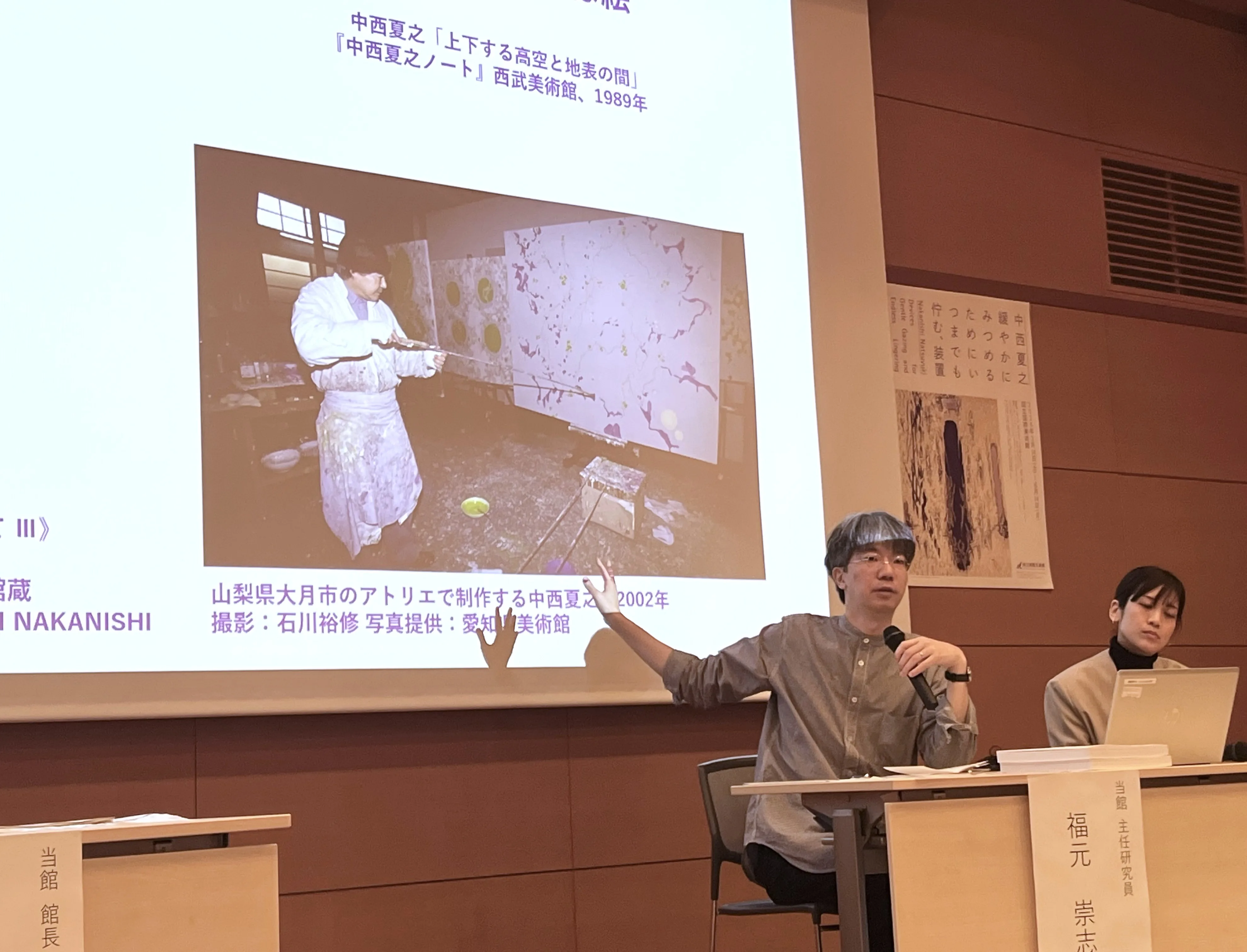 内覧会に先立ち、担当学芸員の同館主任研究員・福元崇志は、中西の作品が私たちに対して投げかける問いを3つに整理し紹介。「人はなぜ絵画を手がけ、また眺めるのか」「絵画は『どこ』に現れるのか」「絵画は『どのように』現れるのか」。このうえで、作家の制作の核にはつねに「絵画とは何か」を問い続ける姿勢があったと語る。