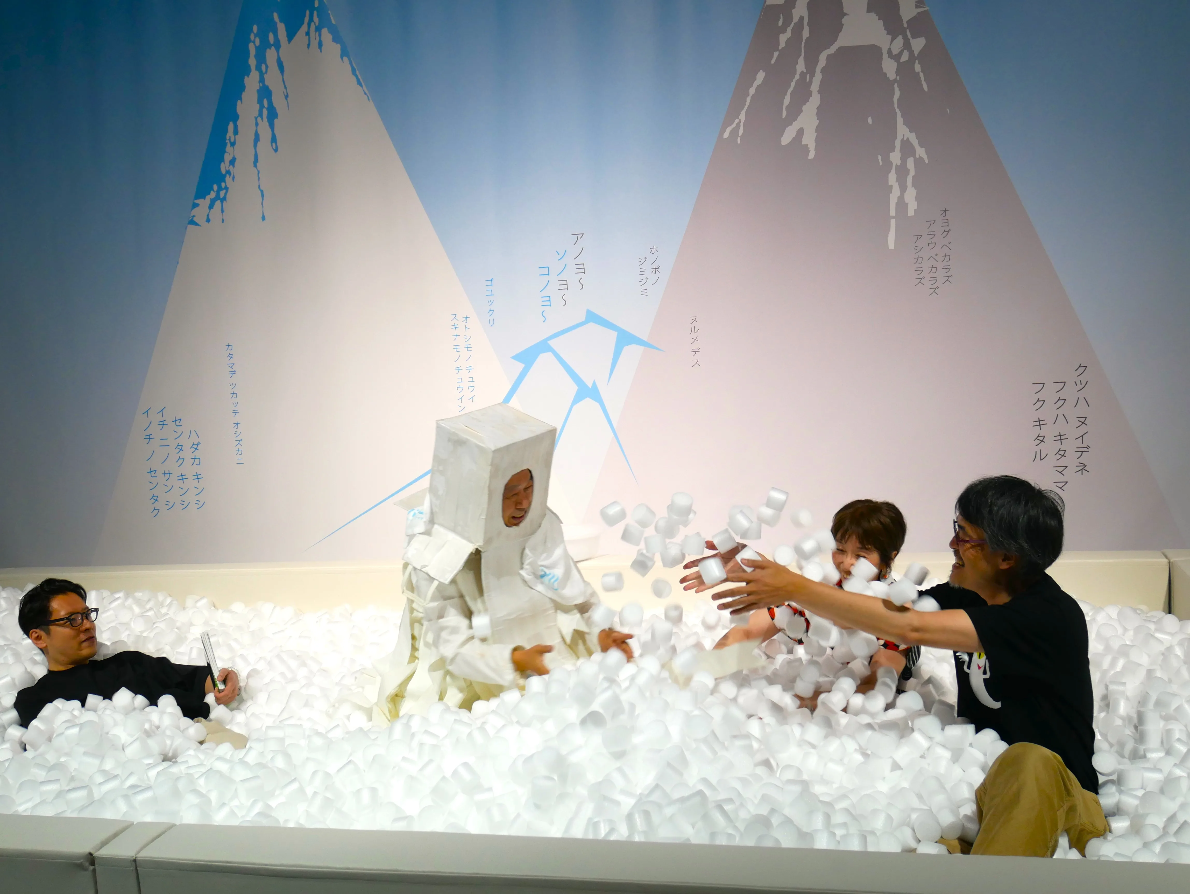 もちろん「オバケ湯」のなかに入り、思い切り遊ぶことができる。「オバケ湯」は、用意されたもので遊ぶことが多い現代の子供たちが、みずから遊びを作り出すことをめざした取り組みでもあるのだという。 脱衣所にも、オバケを吸入する「オバケ牛乳(オバケキウ二ウ)」や、身体が伸びたり縮んだり、歪んで映る鏡、風呂あがりにはオバケ漫画の名作『オバケのQ太郎』が置かれるなど、くすっと笑ってしまうような小さな工夫が込められている。