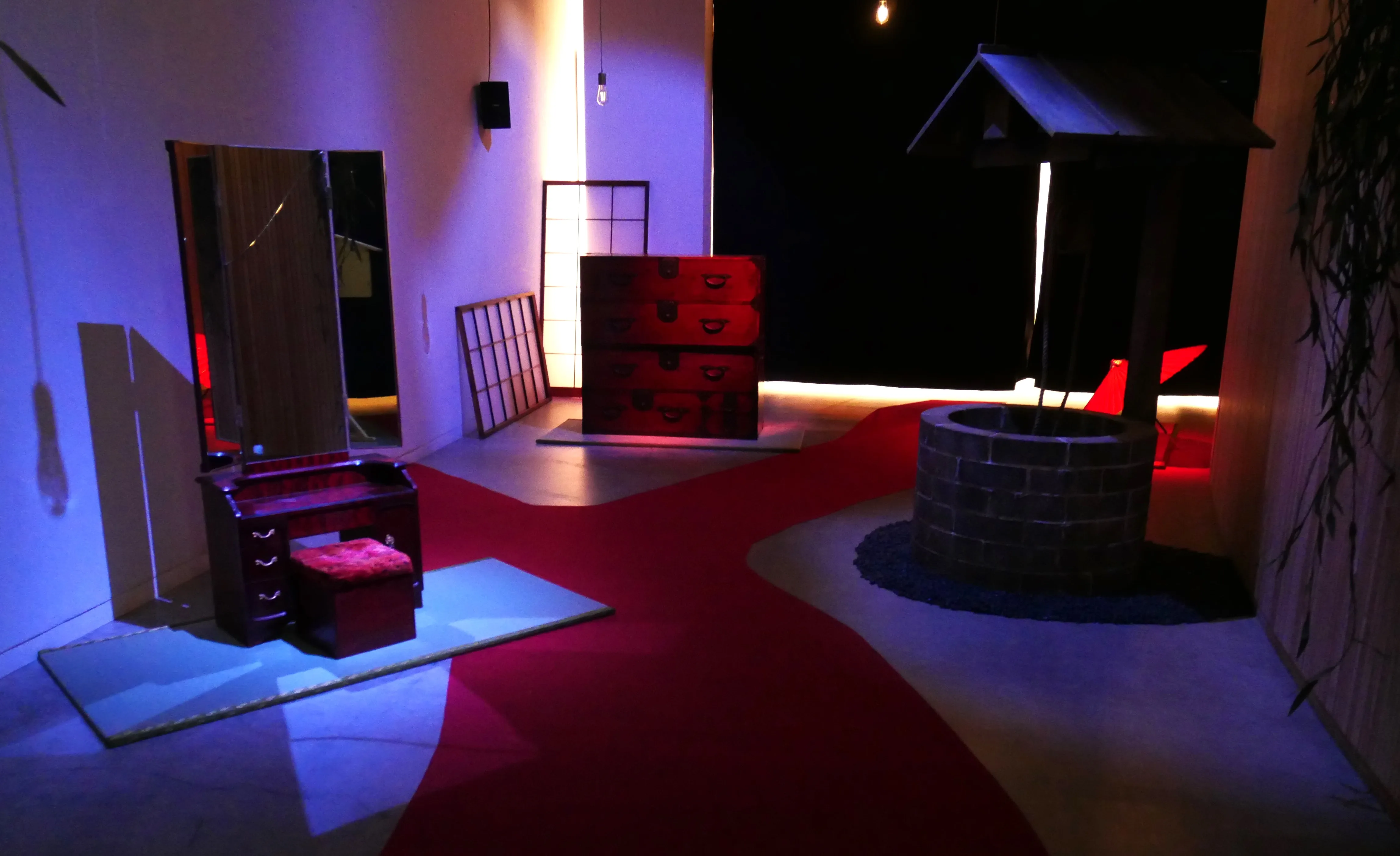 次の部屋に行くと、そこは「オバケ屋敷」! 思い切って展覧会のなかにオバケ屋敷を作ってしまったのだという。薄暗い部屋は、風の音や、扉が「ギィィィ」ときしむ音、引き出しがバタンと閉まる音など、いまにもオバケが出てきそうな気配に満ちている。プレスツアーの集団で歩いていた時は「そんなに怖くない」と思っていたが、戻ってひとりで写真を撮っていると、なかなか雰囲気のある場所である。万が一本物のオバケが写真に写ってしまったらどうしようと少しびくびくしながらシャッターを切った。