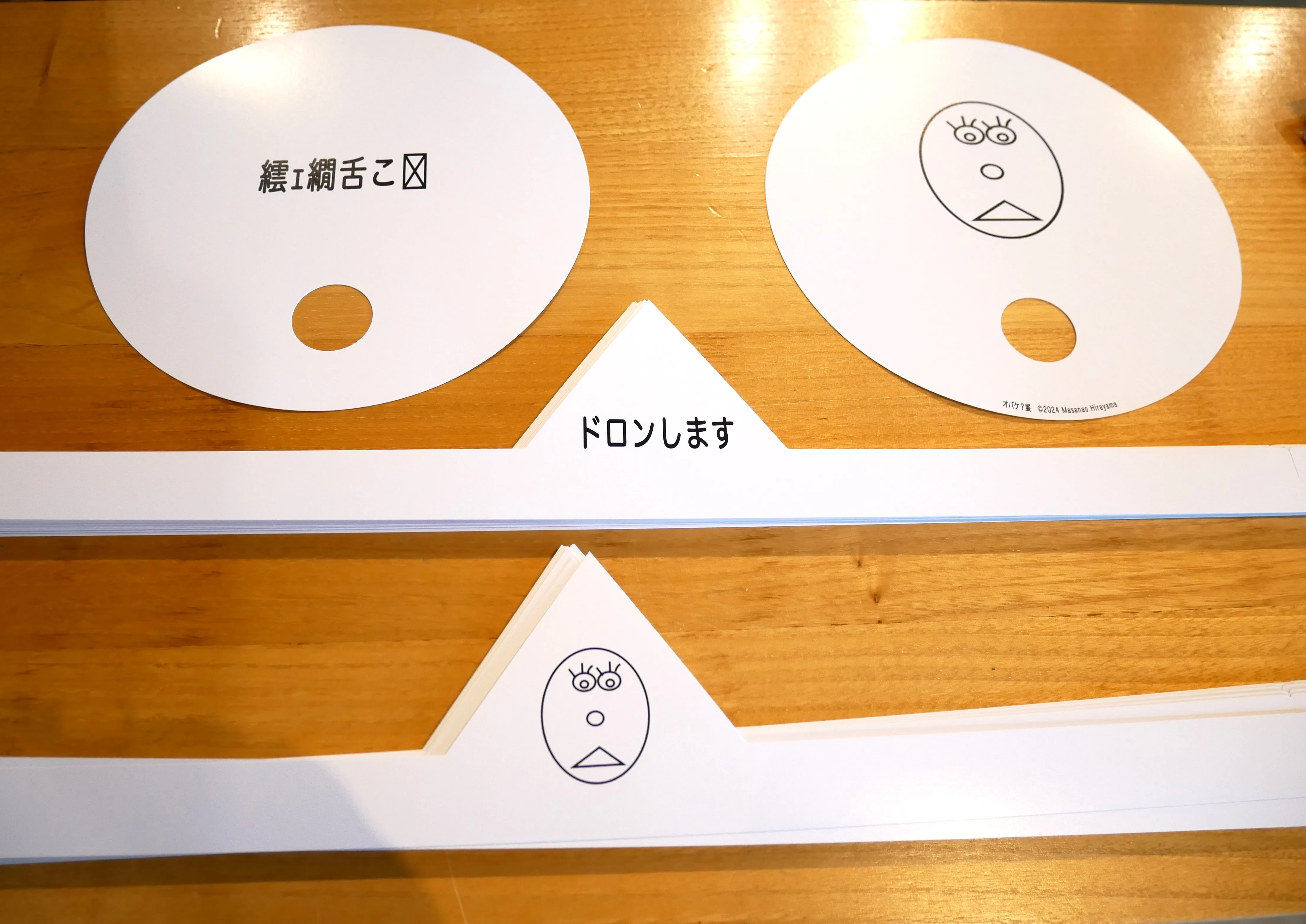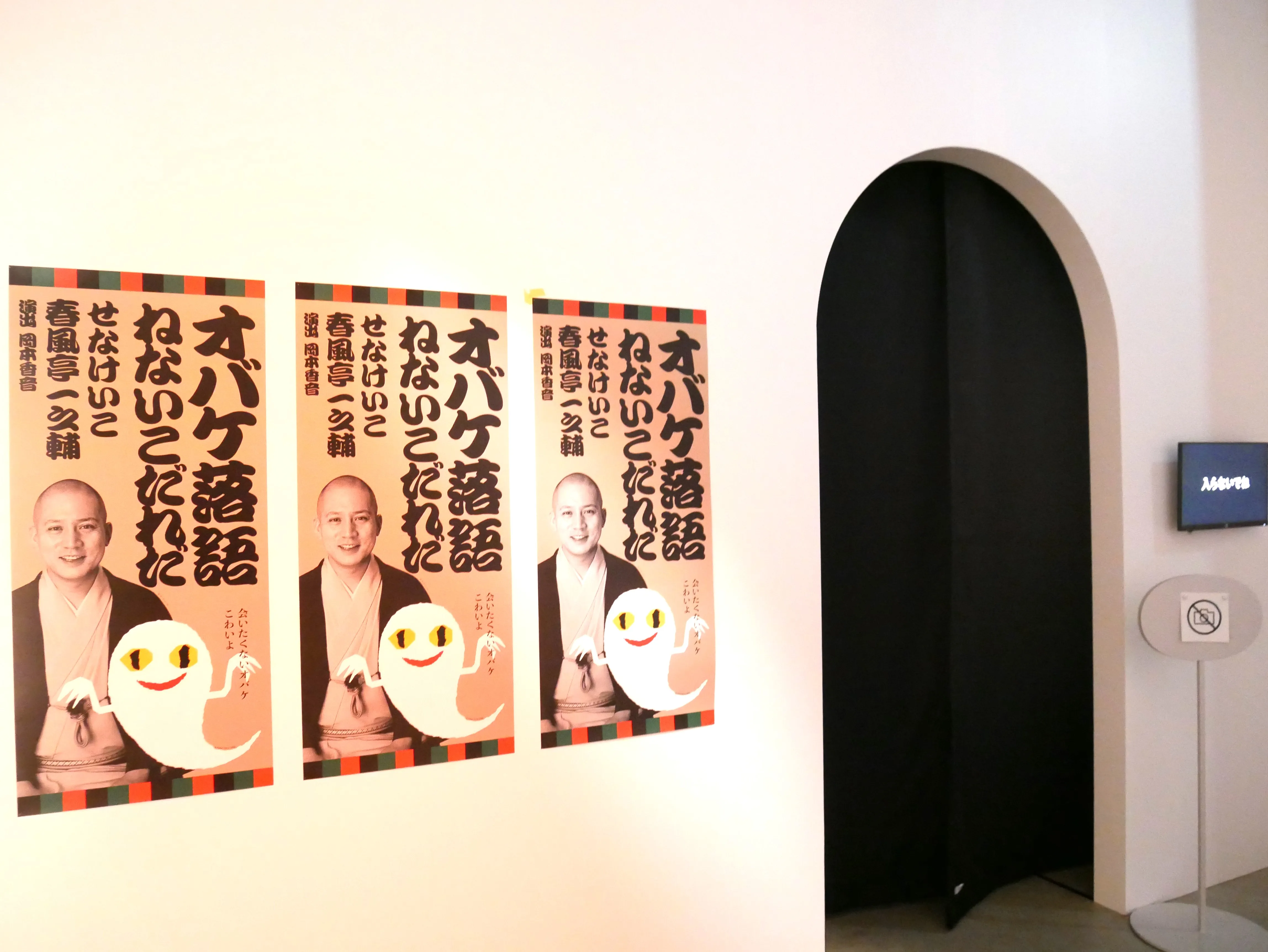 展示室に入る前から、すでに「オバケ?」展は始まっている。来場者には、オリジナルオバケグッズを配布される。映画やアニメでよく見る、日本のオバケたちが頭につけている三角形の布を付けたら、あなたもオバケの仲間入り。