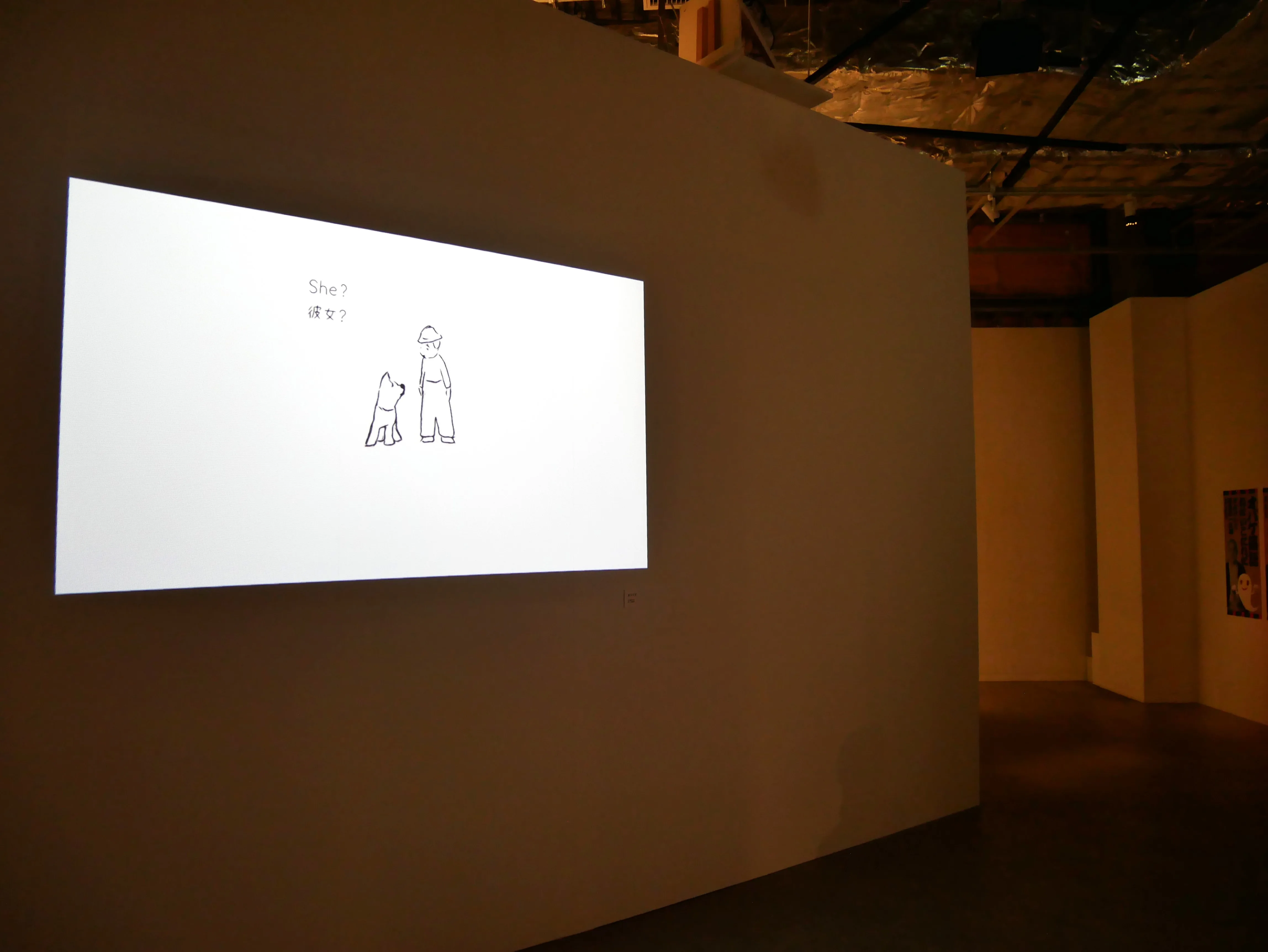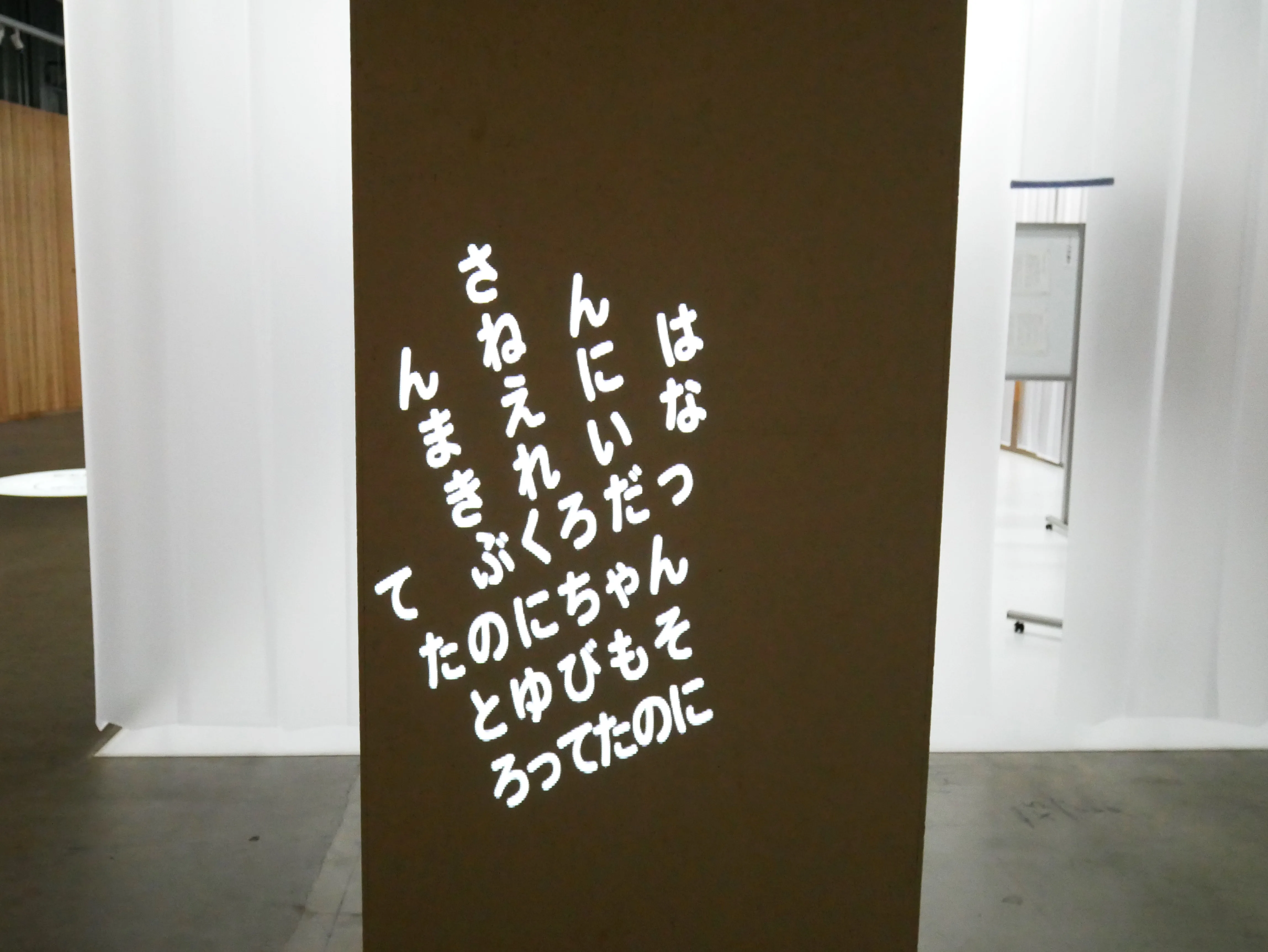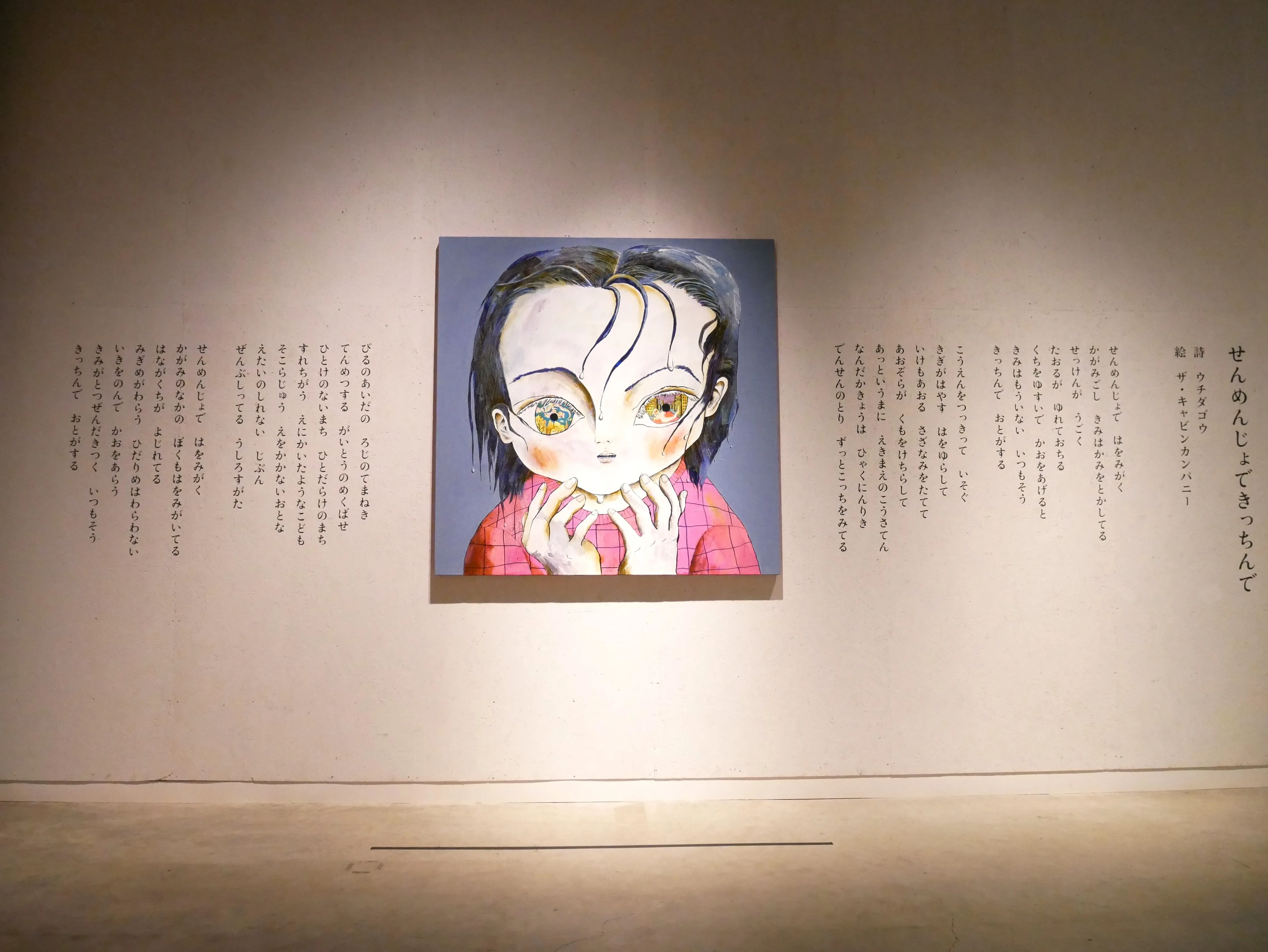 いちばんはじめの薄暗い部屋には、詩と絵からなる《せんめんじょできっちんで》が展示されている。詩人・グラフィックデザイナーのウチダゴウがオバケについて書いた詩に、絵本作家・美術家のザ・キャビンカンパニーが絵を描いたインスタレーション。絵の瞳のなかにオバケらしきものが描かれているが、オバケは見えない。となりの部屋からは「ひゅ~どろどろ~」とオバケが出現するときおなじみのあの音が聞こえてくる。