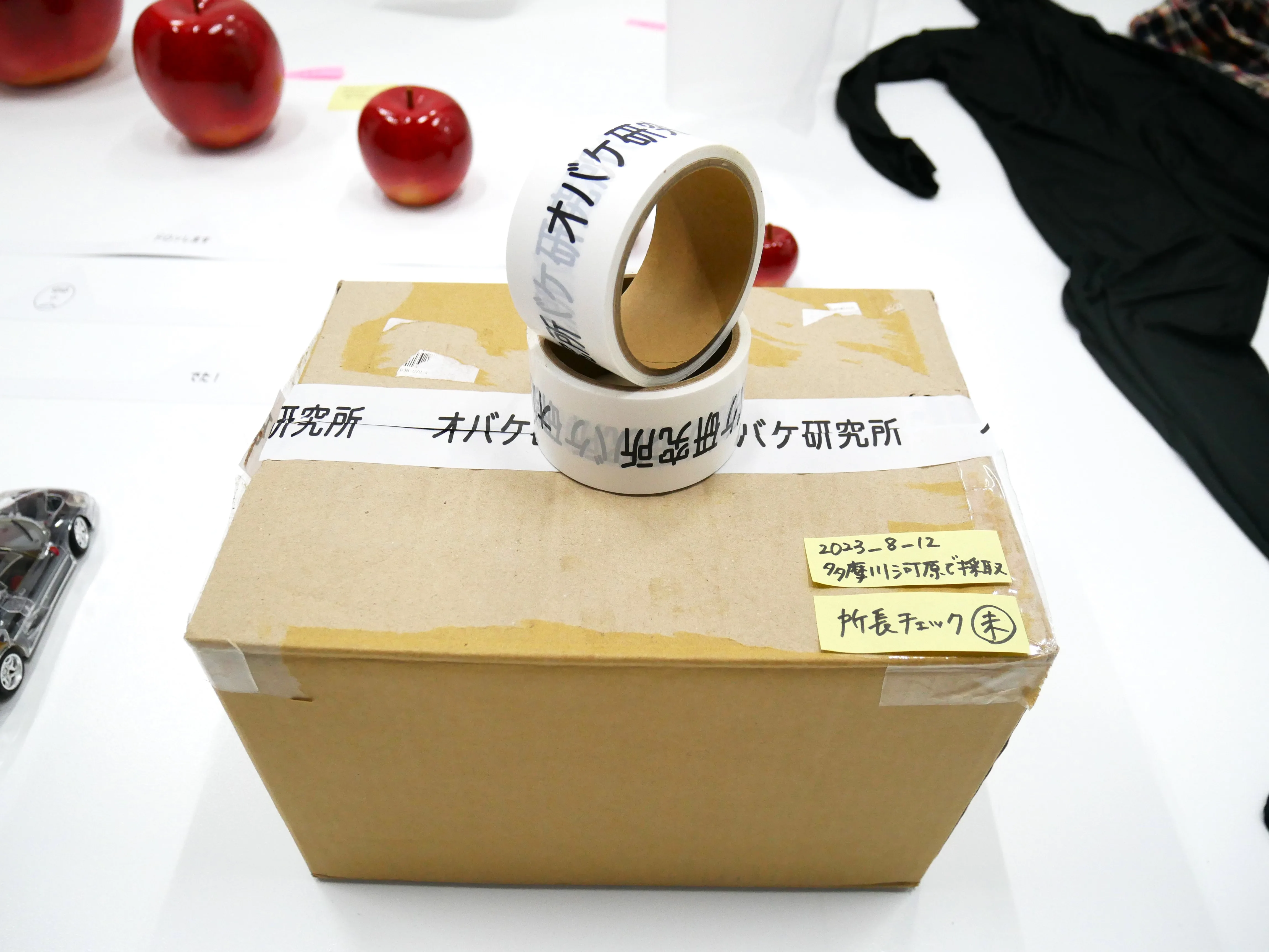 透明なスケルトンの素材も、骸骨のイメージからオバケにつながる。「オバケカボチャ」と呼ばれるように、特別大きいサイズのものも日本ではオバケになることも多い。 多摩川河川敷で採取したというオバケも段ボールに梱包されてさりげなく展示されていた。箱は、小刻みに動き続けている…。