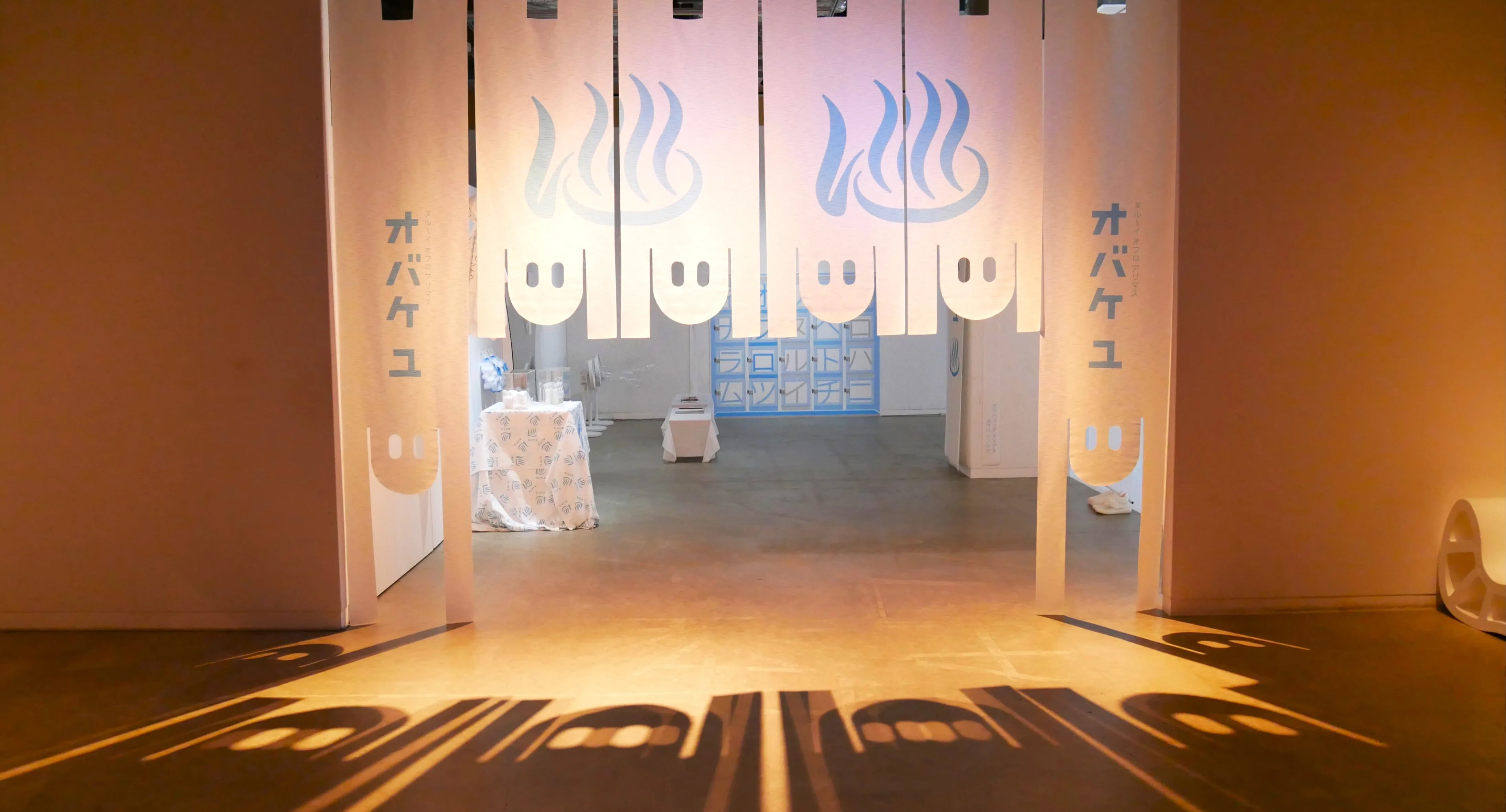 さて、「オバケ?」展のラストには、オバケたちが集う「オバケ湯」へ行って疲れを癒そう。ここは、オバケ大好きなブックデザイナーの祖父江慎(愛称:ソビー)が、オバケたちのためにデザインした銭湯。オバケはもともと水が苦手。そんなオバケたちでも入れるようにオバケ湯番頭のソビーは「カワキミズ」で銭湯を作った。