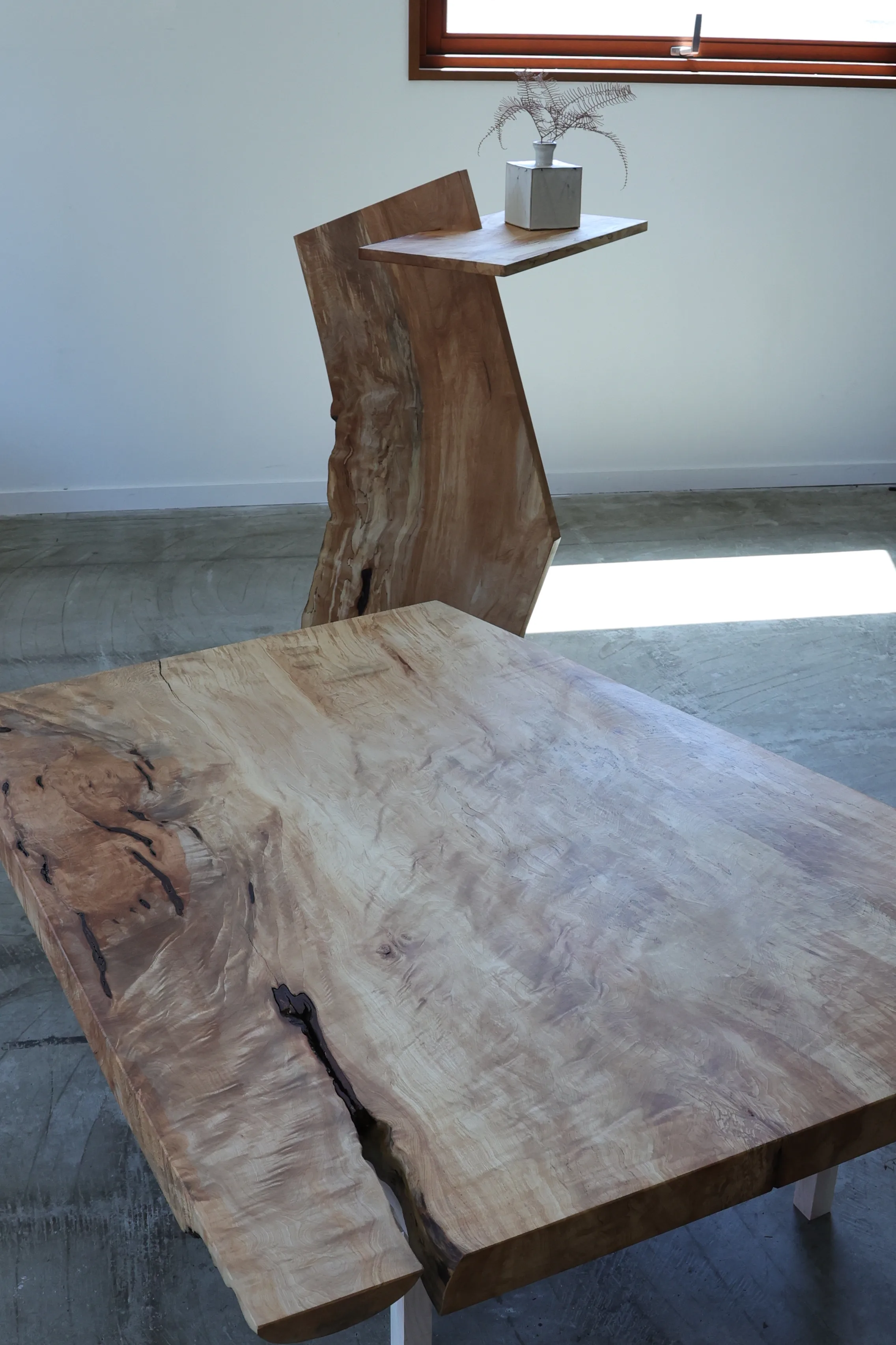 ローテーブルは放置されたトチの木を用いている。脚は伝統的な櫓組みで、細くても重いものを支えられる。奥の花台は虫食いを取り除いて残った部分でつくられていて、いずれももとの木をそこなわないデザインだ。