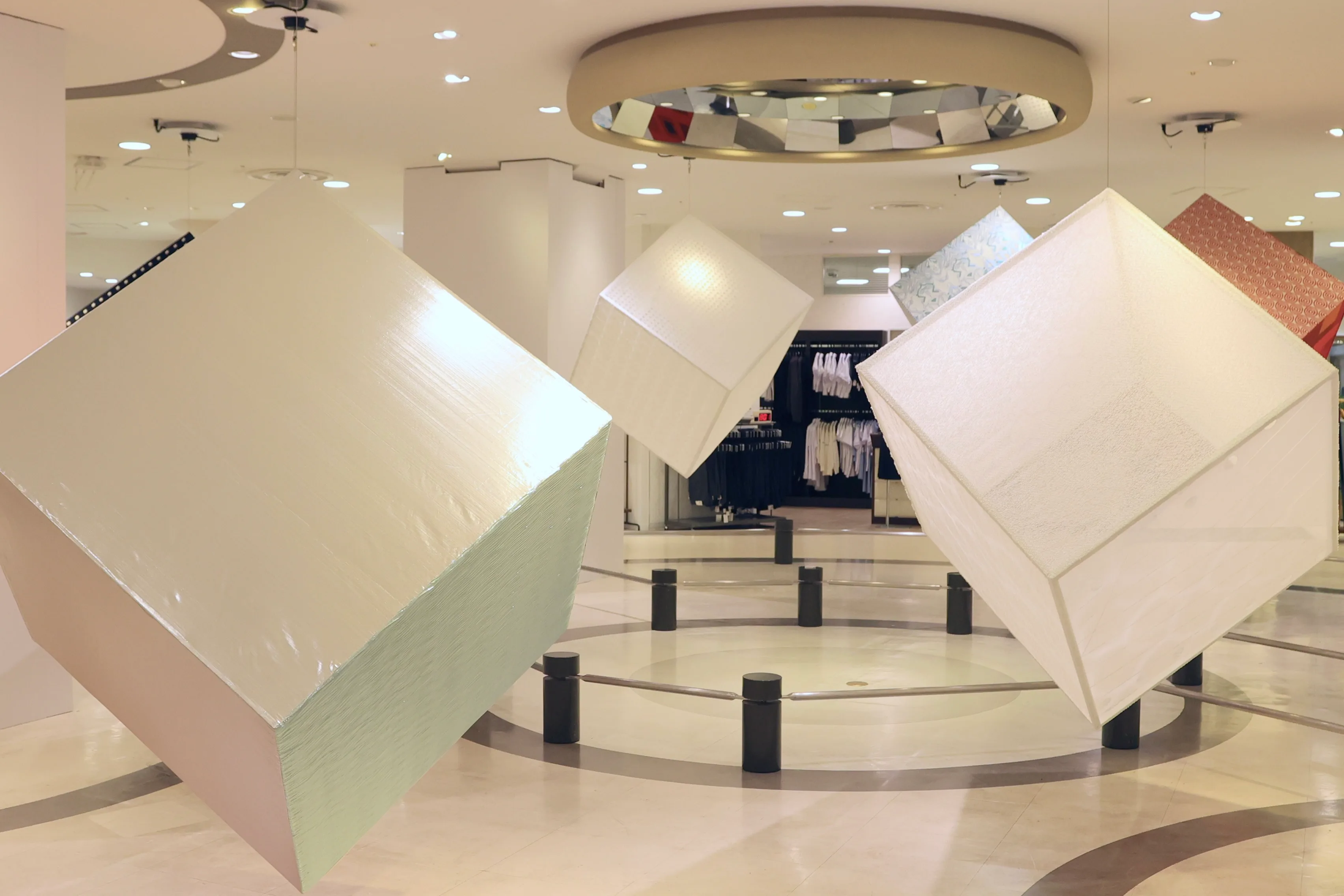 高島屋大阪店6Fでは、「NUNO × we+ テキスタイルインスタレーション OSAKA nuno nuno」が開催。かつて大阪が国際都市として栄えたことに倣い、日本各地から布の素材を集めた。久留米や鶴岡、京都、桐生の4つの産地から集めた布の巨大なキューブが回転している。それぞれの質感が間近でわかるように入り込める空間構成になっていて、サンプルを触ることもできる。釣り糸や反射する繊維など、様々な素材と技術が見て取れる。なお高島屋の担当はこのために天井にライトや電源を仕込んだというほどの気合の入れようだ。