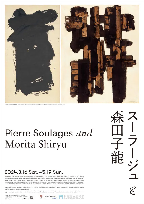 スーラージュは、パリのルーヴル美術館で2019年から2020年にかけて個展が開催されるなど、フランスの国民的な画家として人気を誇っている。また今回、スーラージュ美術館から出品される17点のうち16点は、日本初公開の作品。また1951年に日本で初めて展示された作品も約70年振りに来日する。いっぽう、森田子龍の展覧会が、兵庫県神戸市で開催されるのは約30年振り。約30点の作品が、兵庫県立美術館に一堂に会することとなる。