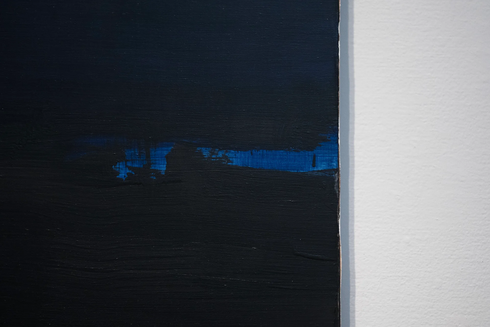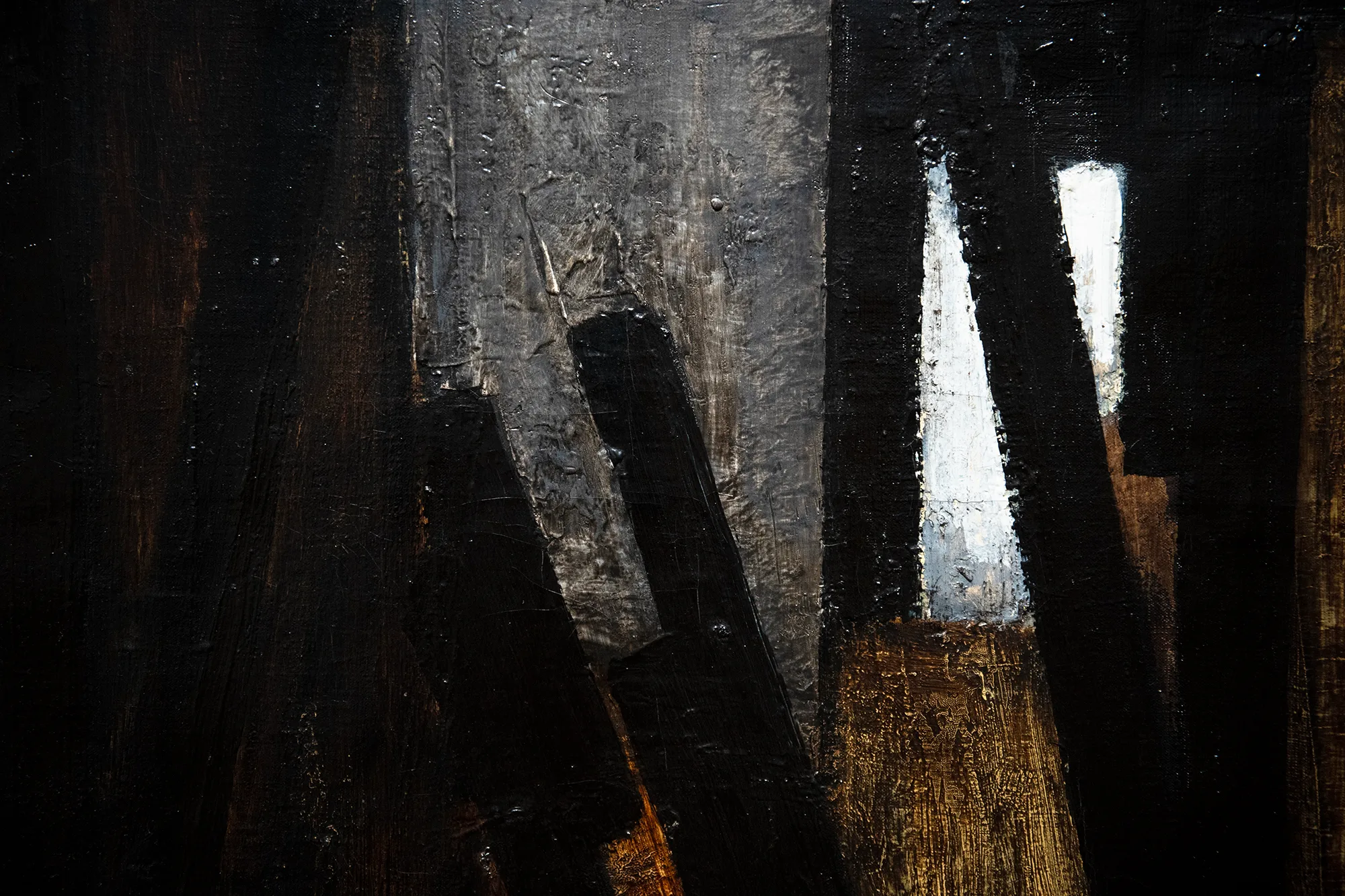 次の展示室では、「黒の画家」スーラージュのひとつの到達点とも呼べる技法と出会うことができる。「黒の向こう」を意味するフランス語(outre noir)から編み出した「ウートルノワール=outrenoir」の造語を冠した技法により、視覚表現としての黒であり、同時に物質としての黒を絵画作品でかたちにした。展示室一室を独占し、ウートルノワールの作品と対峙できる空間には光と影との厳粛なる共存が実現している。