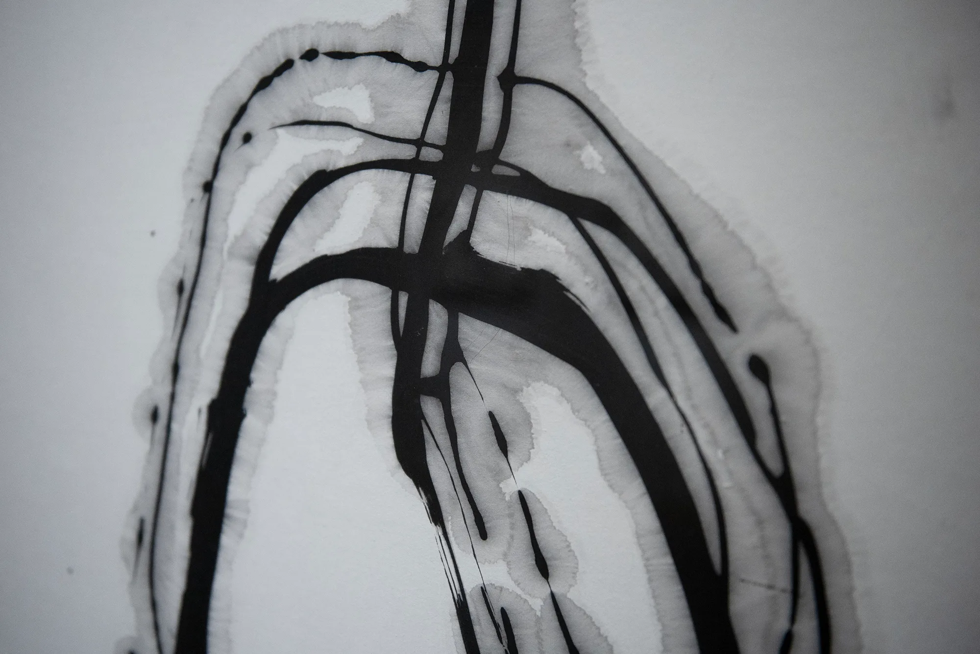 展示冒頭で、生前の森田の制作風景を収めたドキュメンタリー映像を見ることができるのだが、そこでは、筆を墨に浸した瞬間から白い紙にどう立ち向かうべきか計るような姿を見ることができる。展示作品の数々には、そこで確認した身体を用いた運筆のダイナミズムが刻まれている。