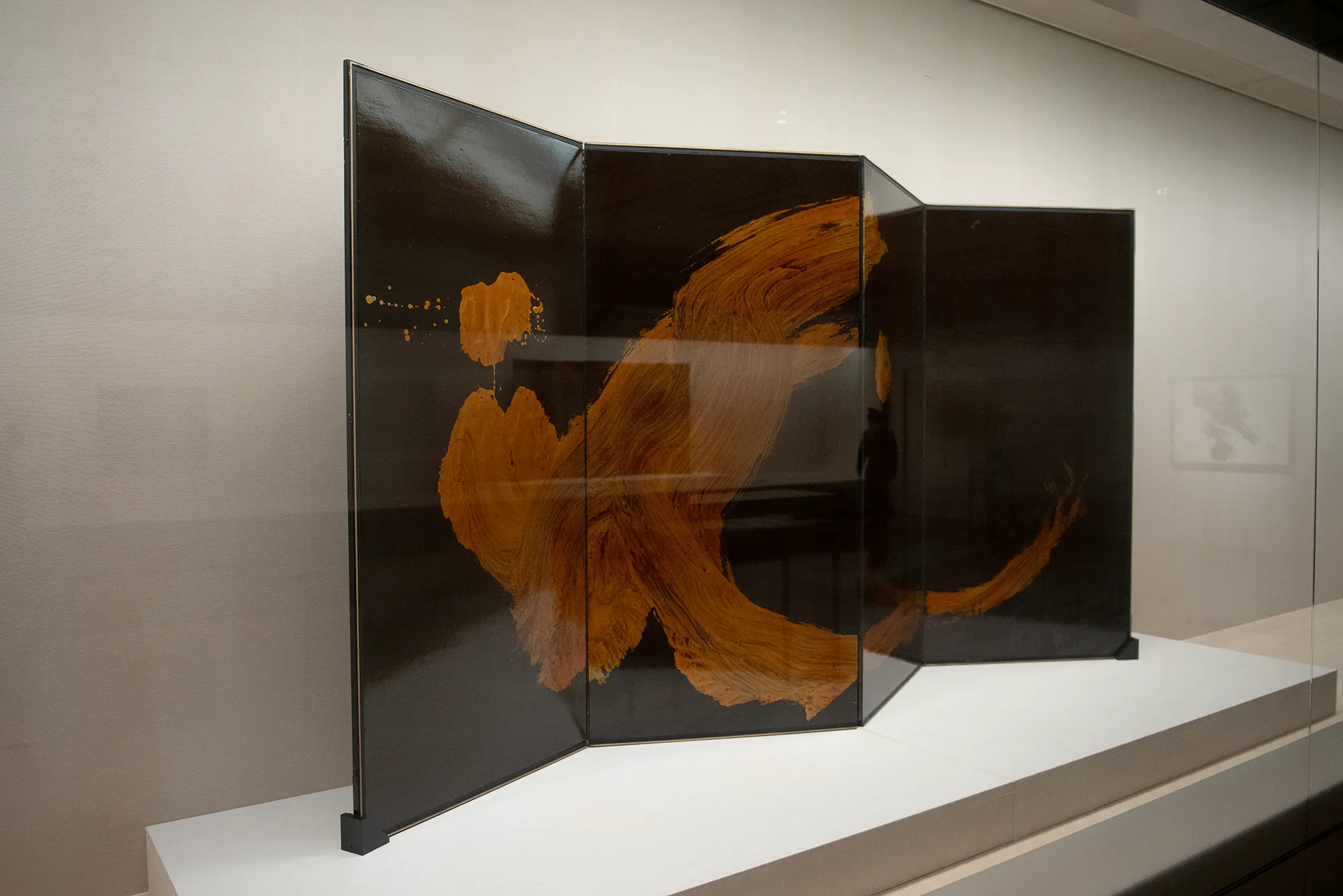 書における動き、余白、そこから感じられる時間と空間というのは作品の重要な鍵となっている。白い紙に墨で文字を書いた作品はもちろんのこと、上の作品《龍》をはじめとする黒地に金色で書かれた作品には、森田独自の「漆金」という技法が用いられ、その筆跡から動きが顕著に感じられる。