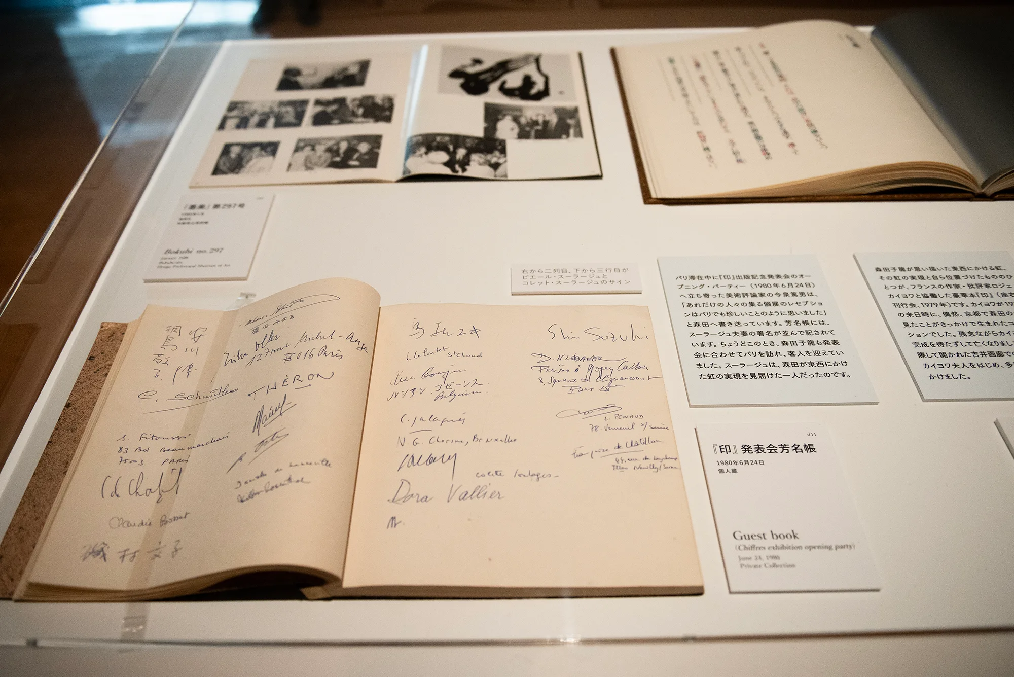 スーラージュと森田が実際に出会うのはスーラージュが初来日した1958年だが、51年に森田はスーラージュの作品に大きな印象を受け、55年に東京国立近代美術館で開催された「現代日本の書・芸術」が欧州巡回展としてヨーロッパ各地を巡った際には、「記号絵画」としてスーラージュらの作品が別室で展示されたというように、間接的な交流は始まっていた。