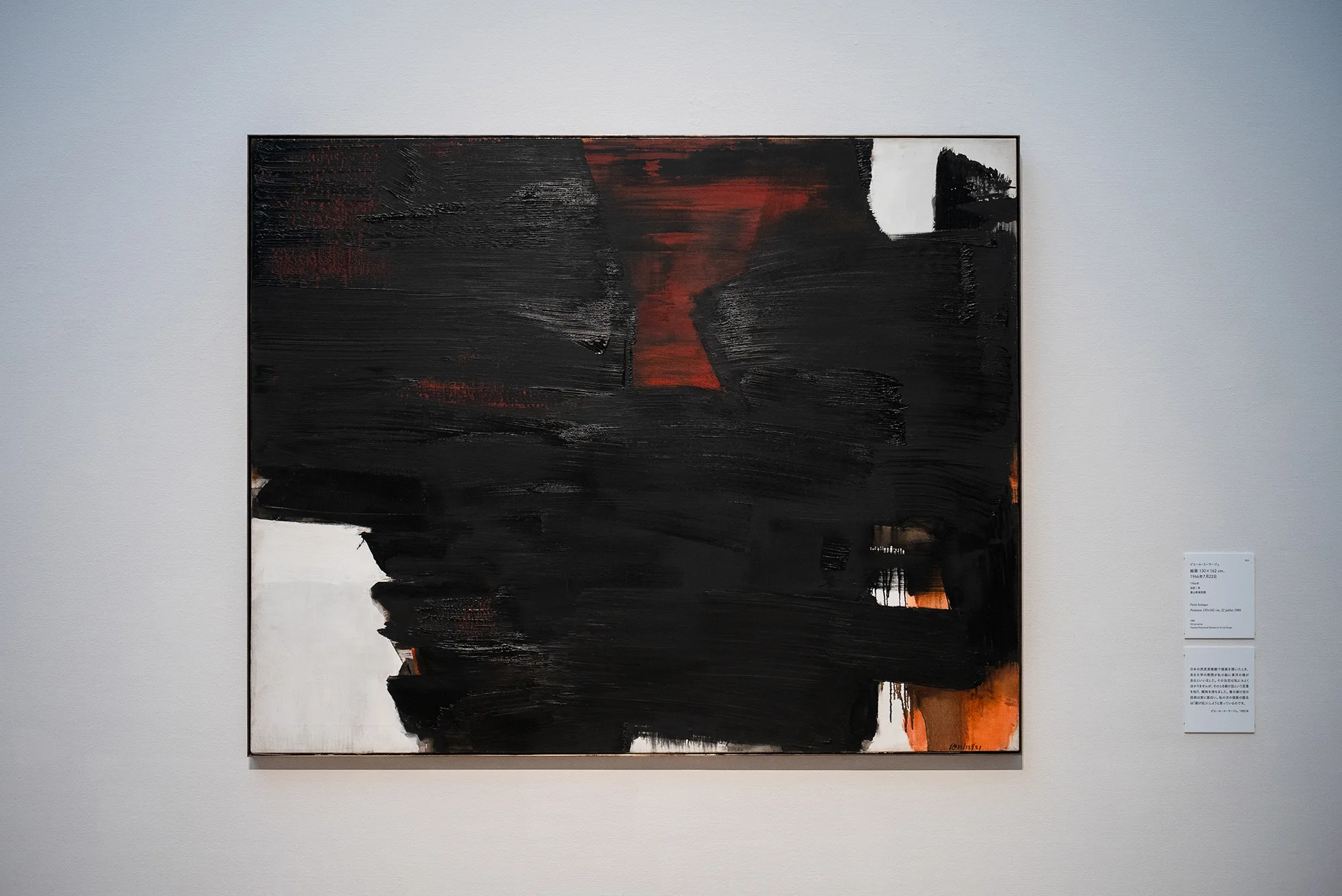 「黒の画家」と称されるスーラージュだが、「暗く暖かみのある色調を持つ」クルミ染料を愛し、紙を支持体とする作品には《紙にクルミ染料》《紙にクルミ染料と墨》などとタイトルをつけたように、黒をどの素材のどのような質感で表現するかにこだわっていたことがわかる。また、アンバーや赤、青などの色を絶妙なバランスで使用することによって、黒が際立つ作品を手がけてきたことも今回の展示から見て取れる。