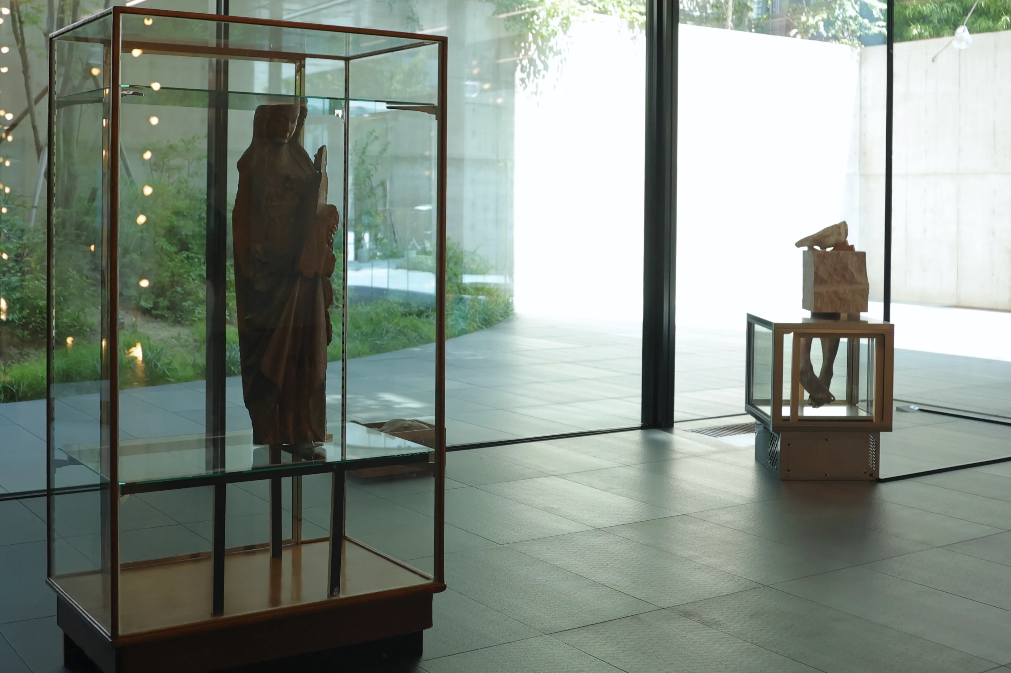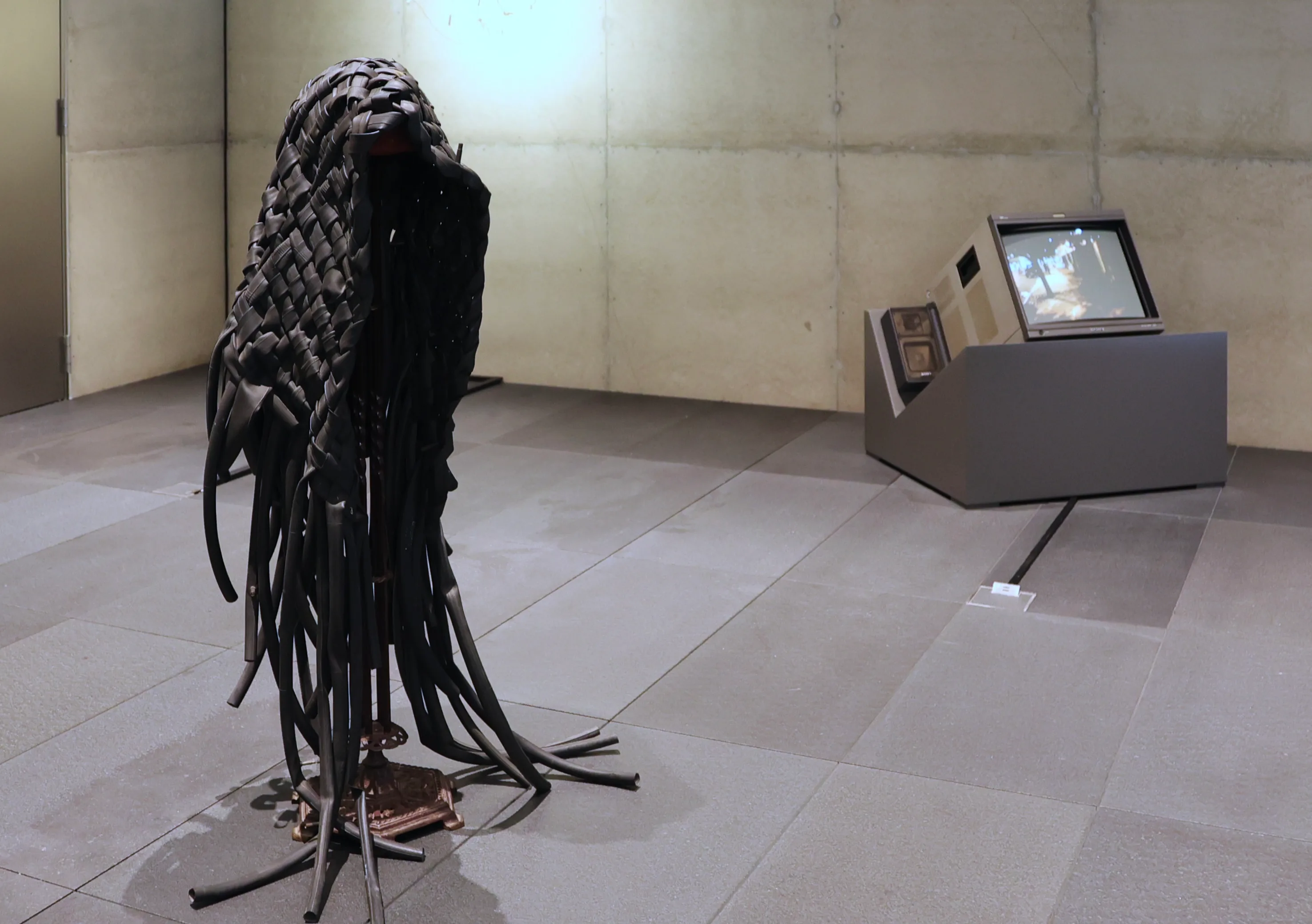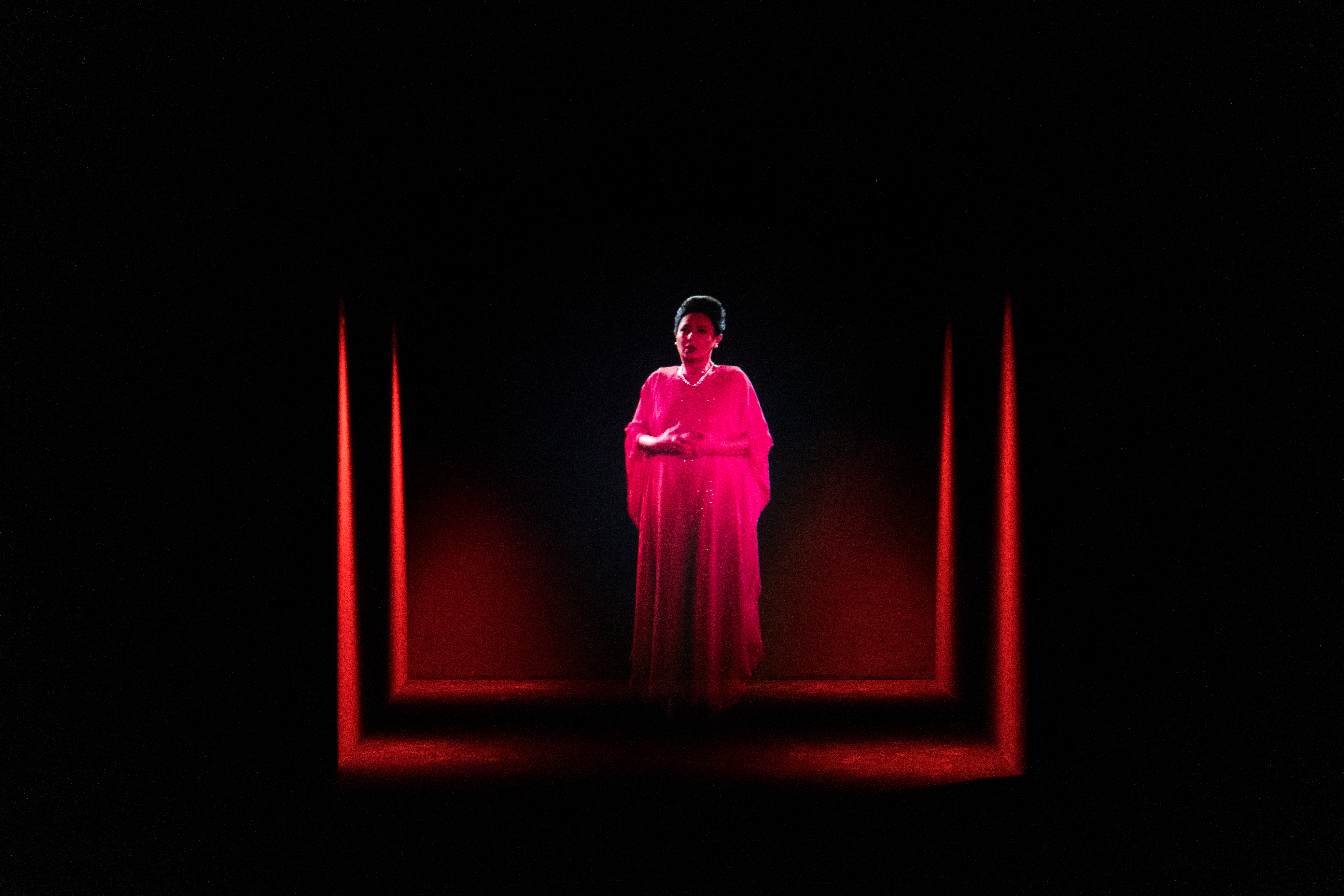 エントランスで出迎えるのは、受付にぶら下がる裸の電球の数々と、ガラスケースに入った異形の木彫だ。電球はフェリックス・ゴンザレス=トレス、そしてガラスケースと立体の3点はヤン・ヴォーによるものだ。これだけでも十分に豪華なラインナップが垣間見えるが、赤く暗い闇を湛えた吹き抜けを地下に降ると、その深奥ではドミニク・ゴンザレス=フォルステルによる映像が来場者を待ちかまえている。在りし日のマリア・カラスがホログラムになり、蘇ったかのように歌っている。