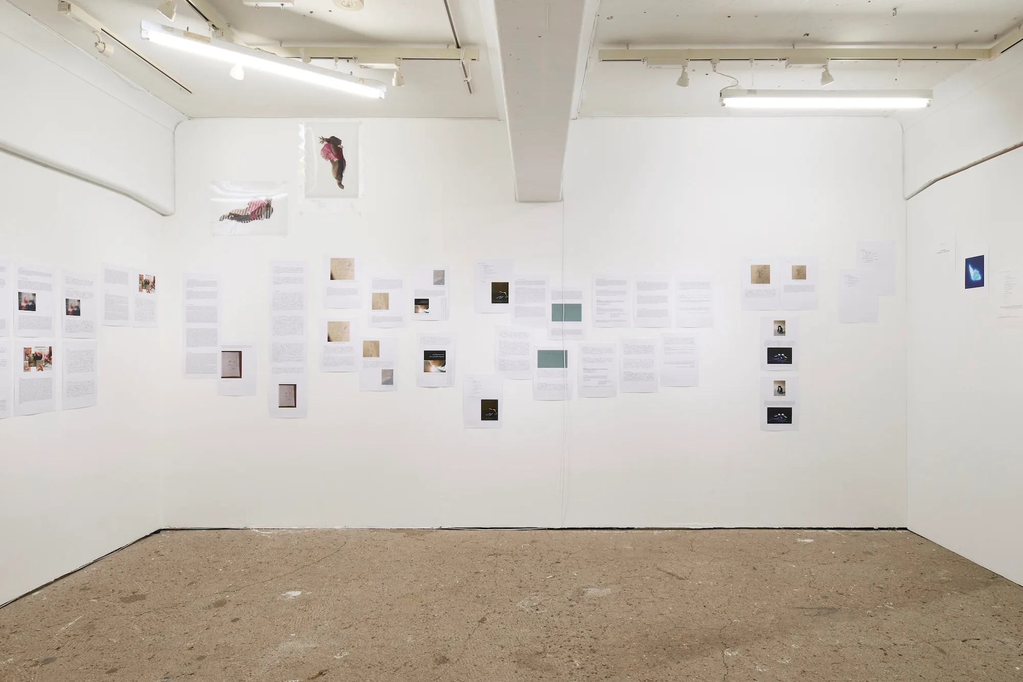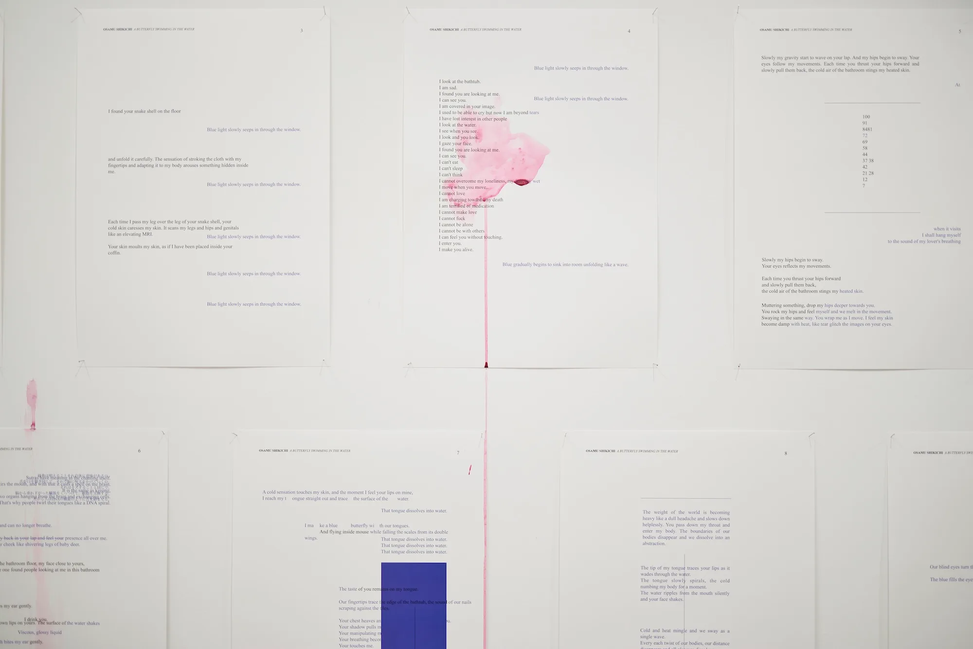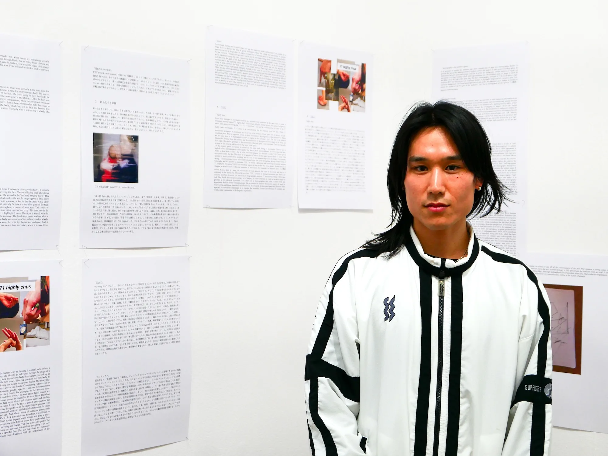 本展において敷地は様々なメディアで構成されるインスタレーションを発表している。「ダンスやパフォーマンスは残らない芸術です。その表現を記録映像を見せるのではなく、何か別のかたちで表せないかと考えていました。パフォーマンスを行うまでには様々なプロセスを経ているのですが、今回、そのプロセスのなかで生まれたテキストや官能小説としての図形楽譜、ドローイングや写真を使ったインスタレーションを制作しています」(敷地)