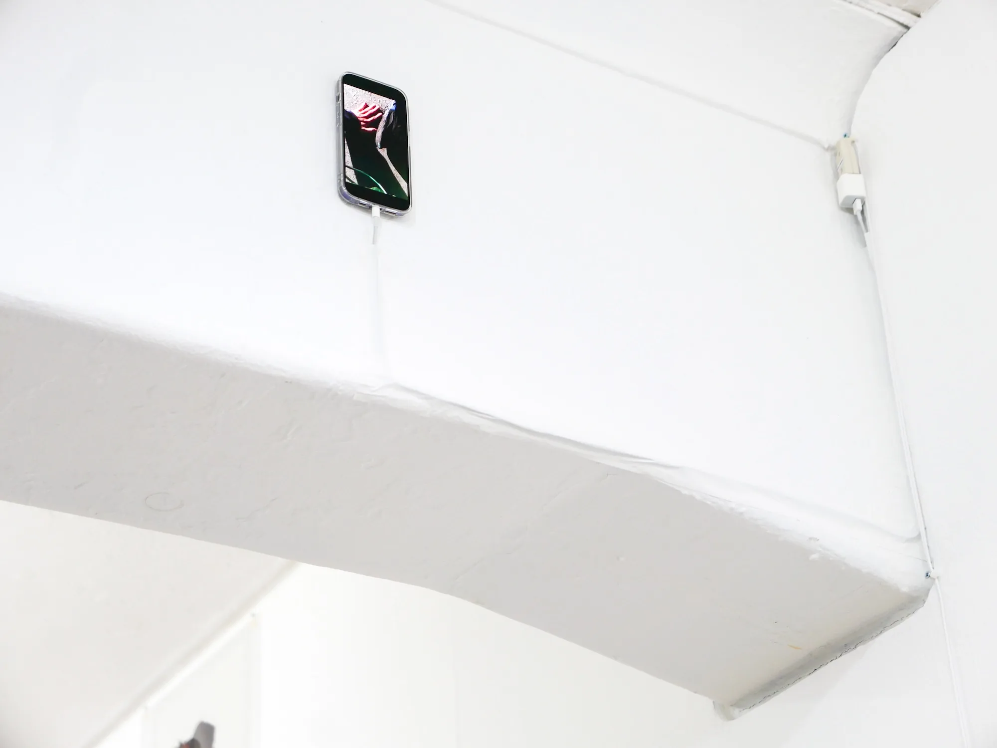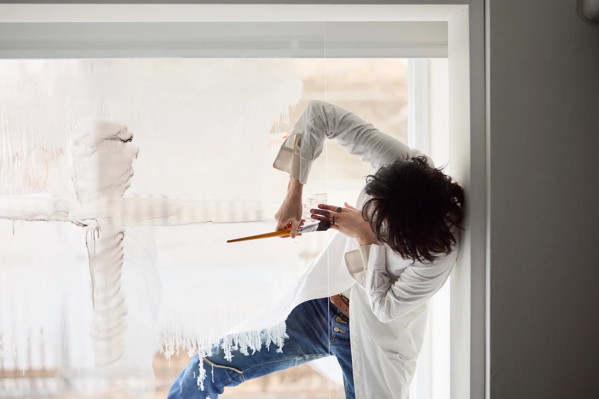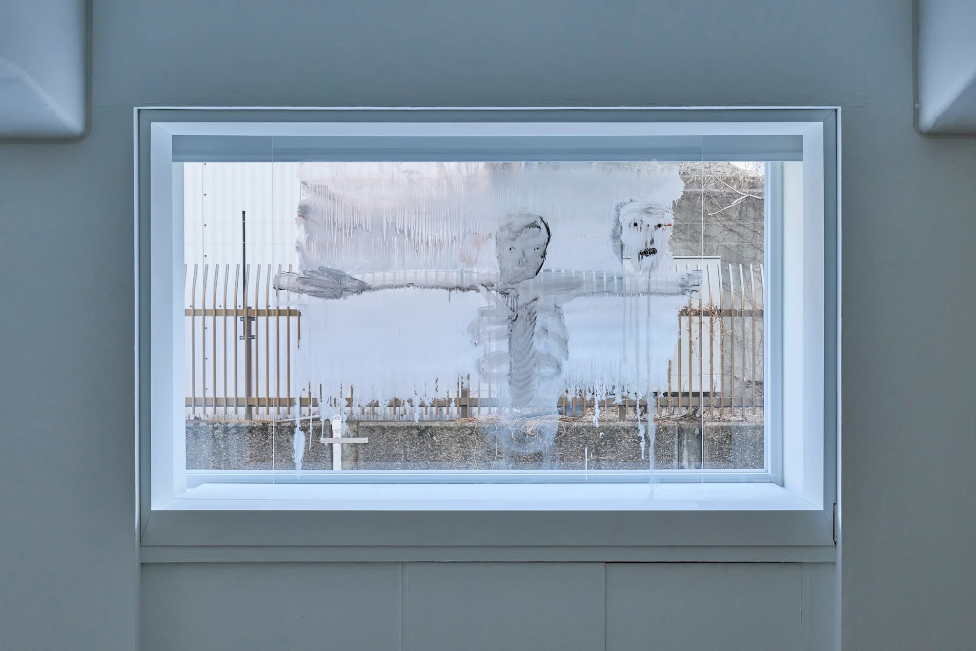 ちなみに、本取材が行われたのは展覧会開幕日の前日。展覧会初日には、窓のそばにはめ込まれた透明のアクリル板に絵を描くパフォーマンスが行われる。「当日、何を描くのかは決めていません。狭い空間なので体の自由がきかない状態で描くことになるかと思います。そのような状態で、当日来ていただいた鑑賞者の動きを追ったりしながら、行為のなかにある身体性を見せていければ」(庄司)
