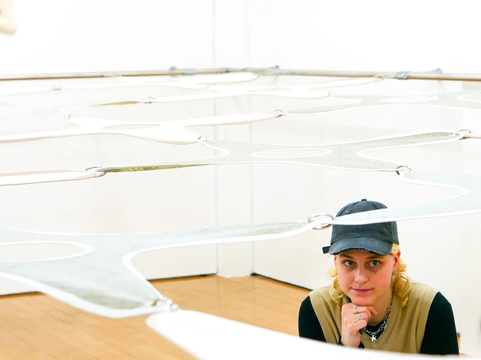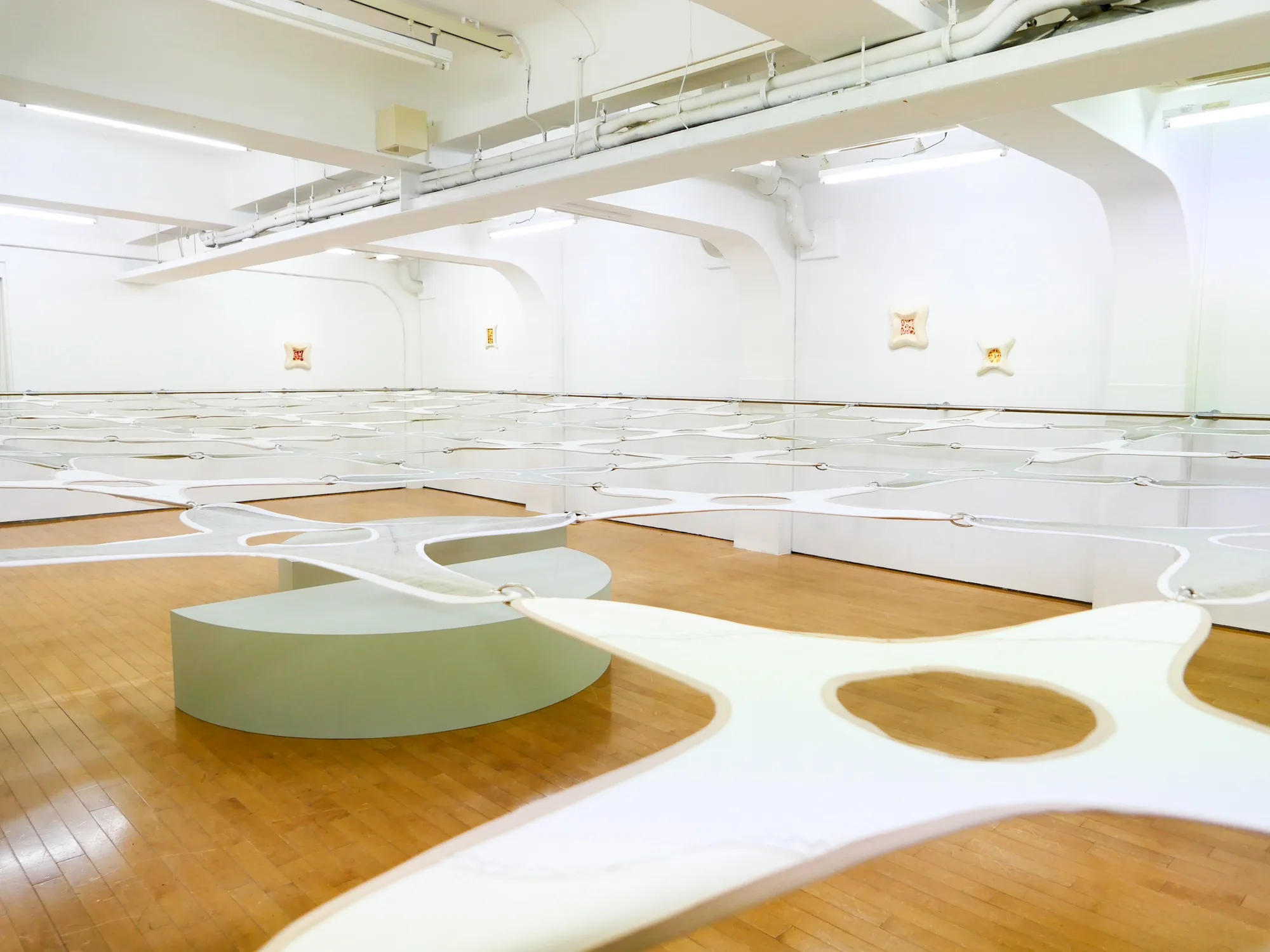 そして、最上階3階は、カナダのモントリオールを拠点に活動するマリオン・パケットのインスタレーションだ。「2階の敷地さんの作品がデジタルによって変容する身体を体感する作品であると考えると、パケットさんの作品は社会の中で形成される集合的な身体を考察する作品です。彼女はテキスタイルなどの柔らかい素材で彫刻的装置を作っています。今回は、『菌糸体』から着想された大型インスタレーションを発表します」(吉田)