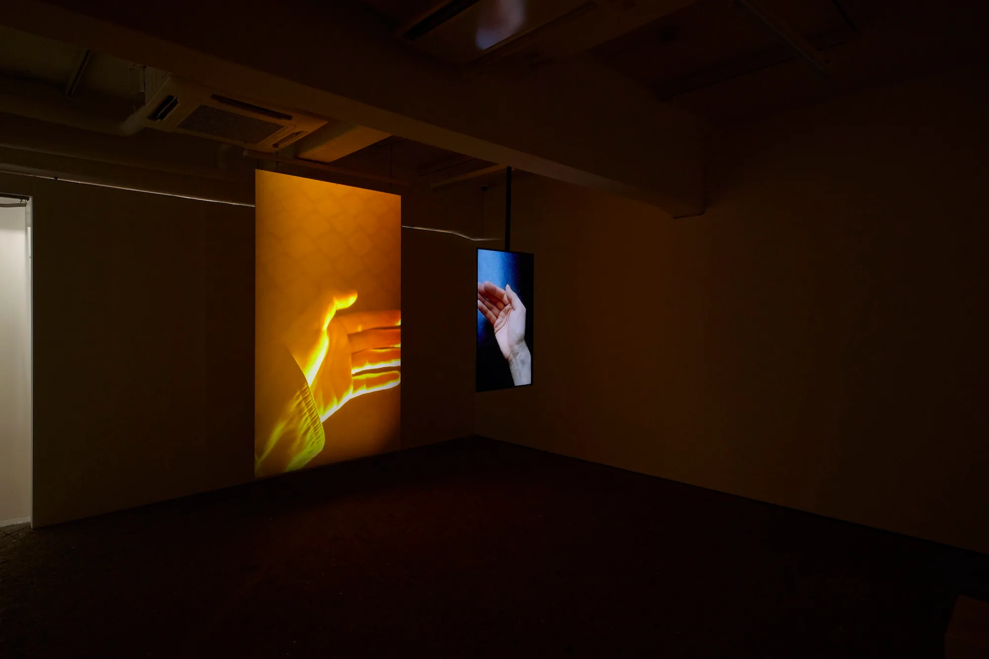 また、1回10分間、1人だけが体験できる映像インスタレーション《untitled(burning dots 2025-)》は、能の演目『井筒』を下敷きにした作品。『井筒』は歌人の在原業平の妻が、亡くなった業平を偲んで彼の直衣を着用し、舞を踊る物語だ。本作では、ふたつの画面のなかに映し出された様々な「手」の動きを見ていくことで、他者の身体を「着る」感覚を追体験するというものだ。「それぞれの画面に映し出された手の呼応の動きが、見ている人々も巻き込んでいく作品です」(敷地)