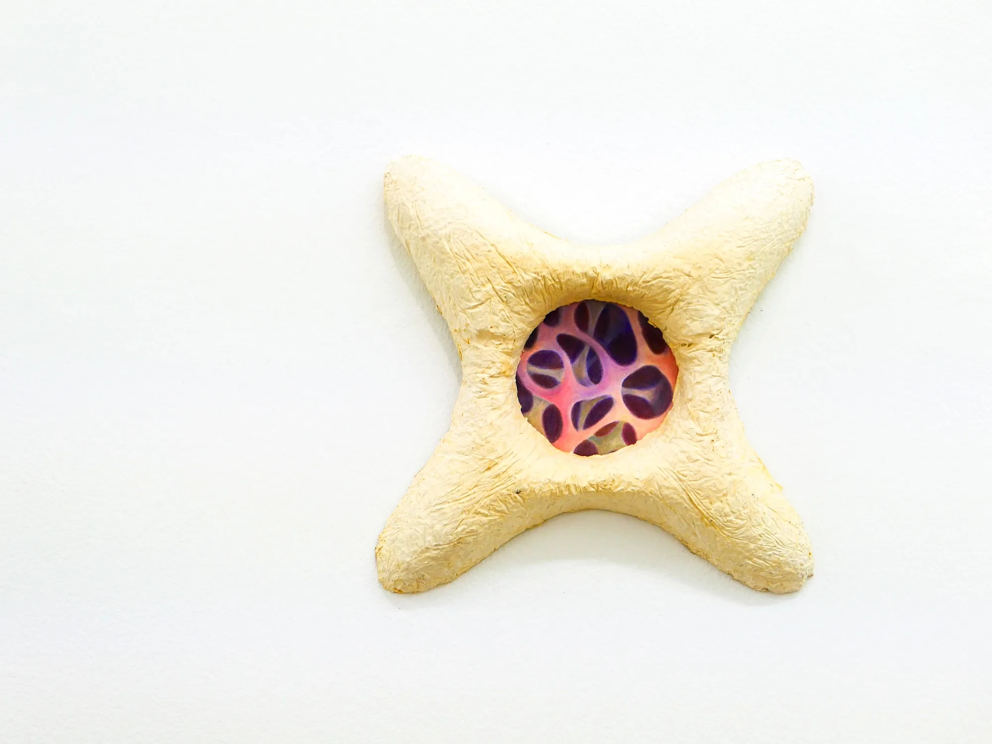フロアに足を踏み入れると室内全体に星のようなかたちのパーツが張り巡らされている。45体のパーツからなるこのインスタレーション《Corps commun(Common Body)》は、舟の帆をリメイクして作られたもの。周りの壁に展示された、菌糸体をモチーフとしたフレームに入った9点のドローイングとともに構成されている。つなぎ合わされたパーツは大人の肩の高さに張られており、鑑賞者は作品の下をくぐって移動し、空いた穴から全体を眺めることができる。鑑賞者たちがパーツのひとつに体を通したり、触れたりするごとに作品全体がたわみ、動きを見せる。