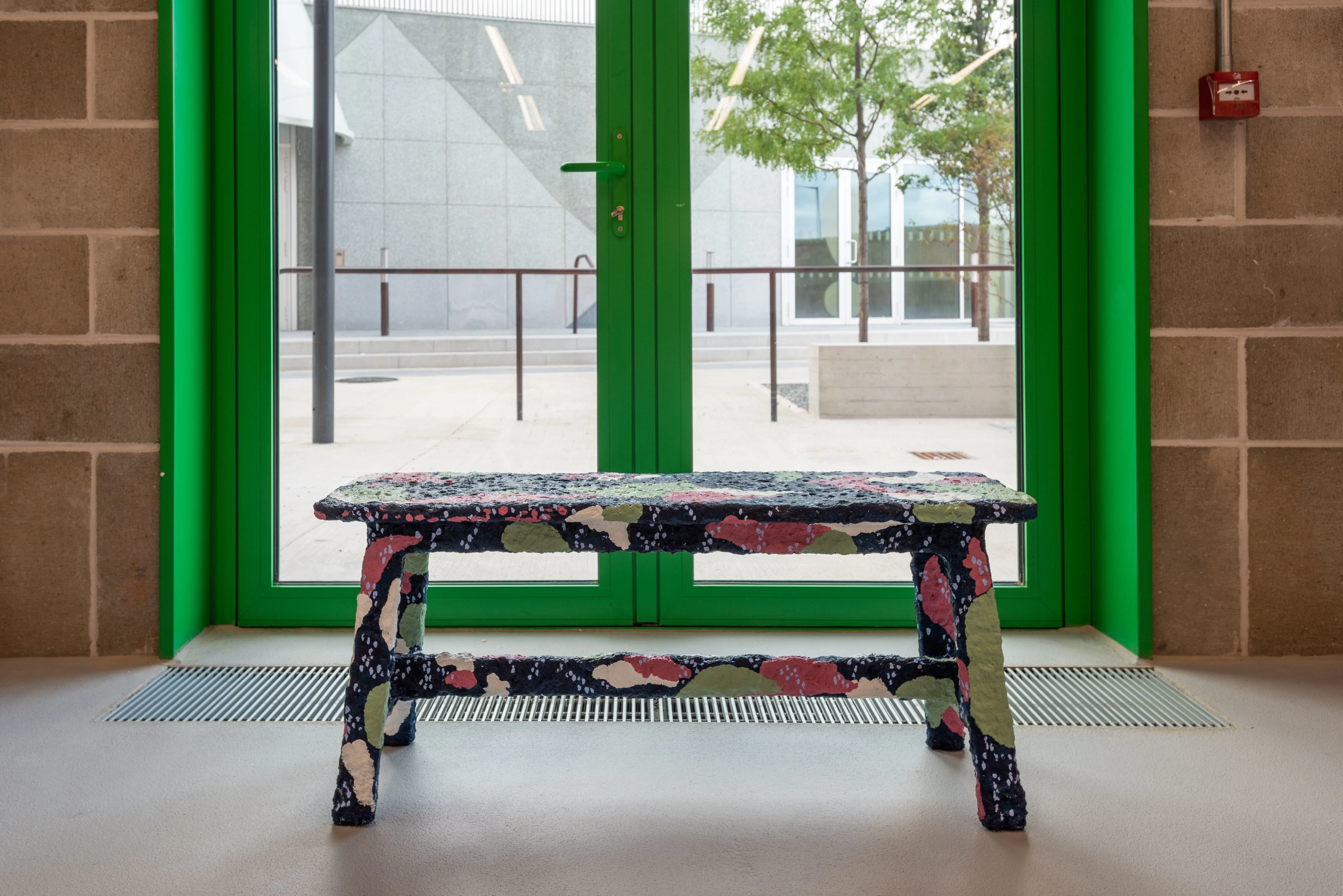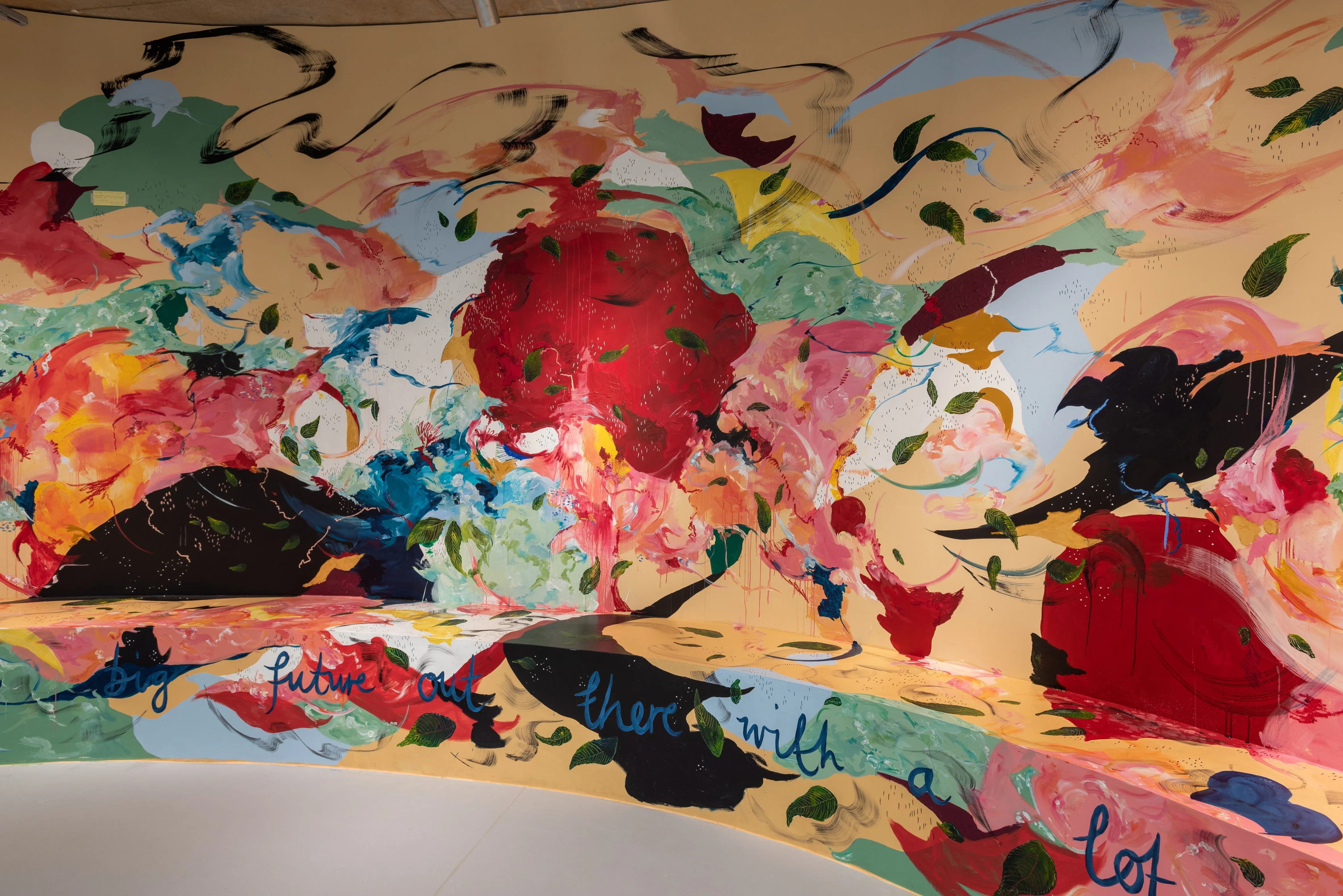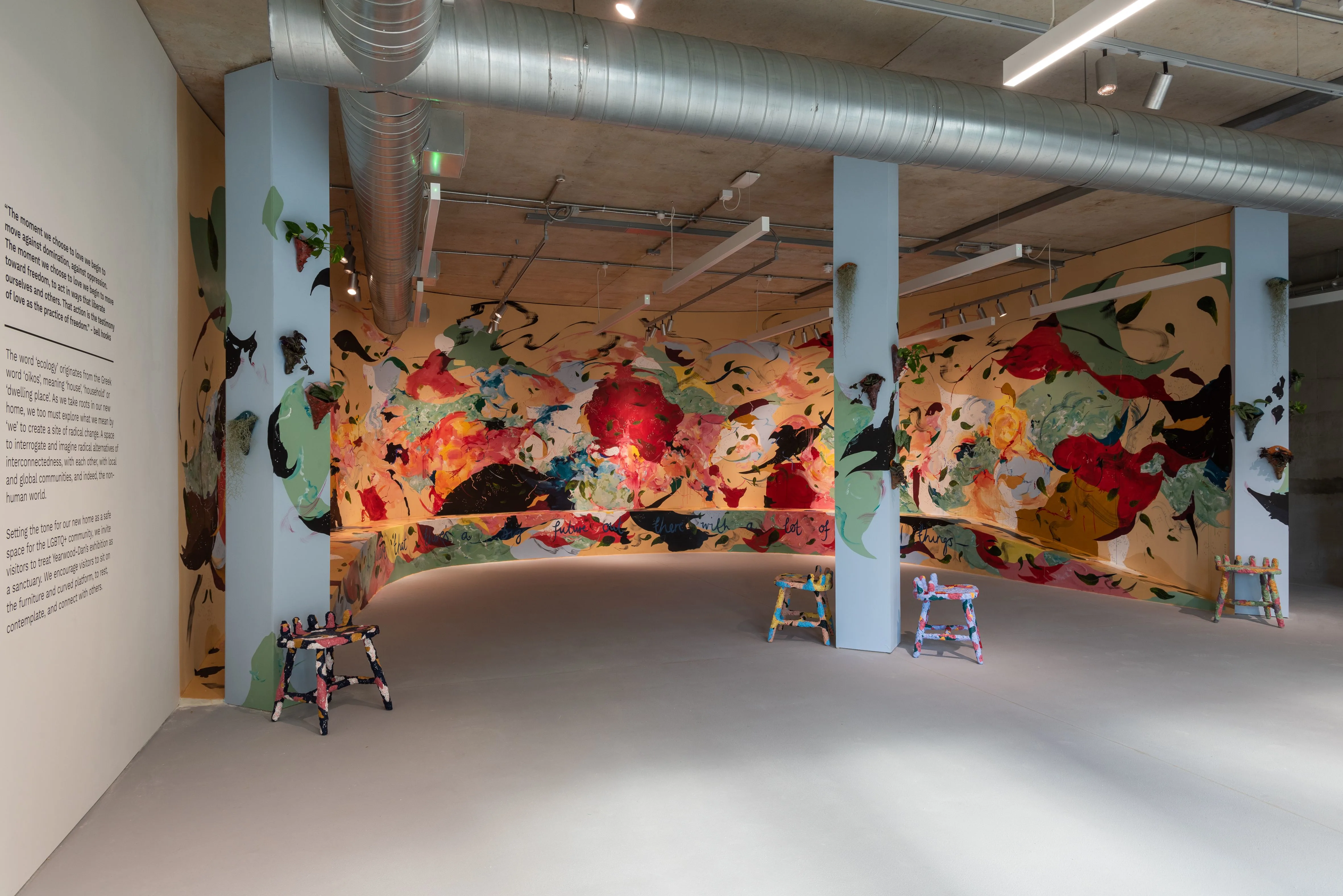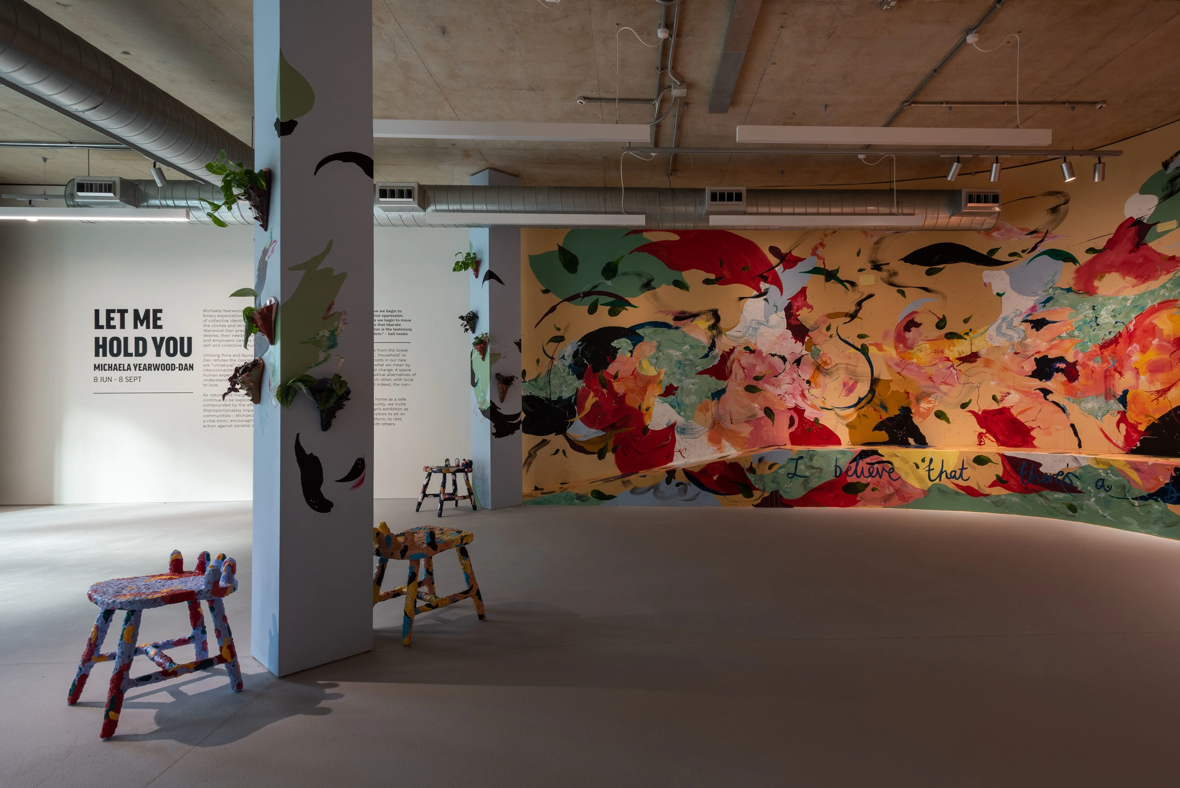 こけら落としを飾ったのは、ミカエラ・イヤーウッド=ダン(Michaela Yearwood-Dan)によるサイトスペシフィックインスタレーション「Let Me Hold You」だ。ギャラリースペースの壁面を大胆に使い、スツールやベンチを携えた空間は、クィア・コミュニティにとっての憩いの場所となる。柱には植物があしらわれ、壁面の絵画にも植物のモチーフが登場しているのが印象的だ。