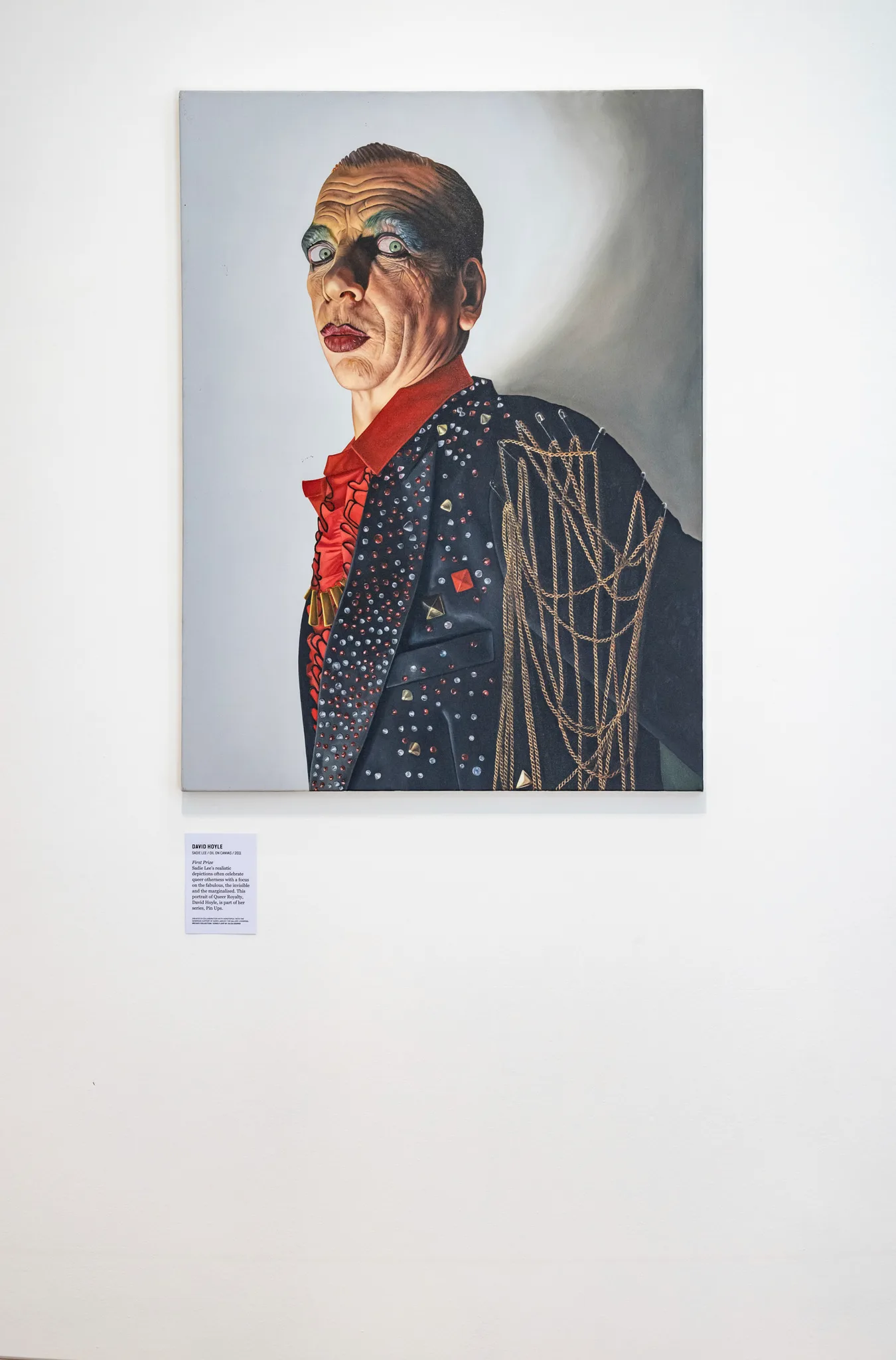 オープニングを飾った展示「Welcome to Queer Britain」では、展示室は主に3つのパートに分かれていた。入ってすぐまず目に入るのは、Queer Britainの公開にあたって昨年新設された「Madame F Award」の受賞者たちの展示だ。第一席に輝いたのは、サディ・リー(Sadie Lee)による肖像画。モデルとなっているのは、キャバレーの世界で活躍するデヴィッド・ホイルである。また、第二席に選ばれたのはポール・ハーフリート(Paul Harfleet)による写真作品。自身を南国の鳥になぞらえ、享楽的なイメージを作り出している。
